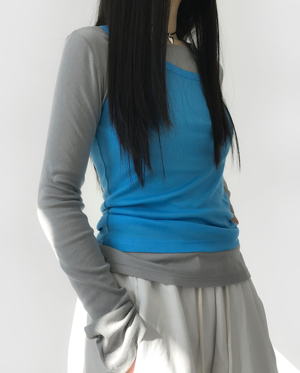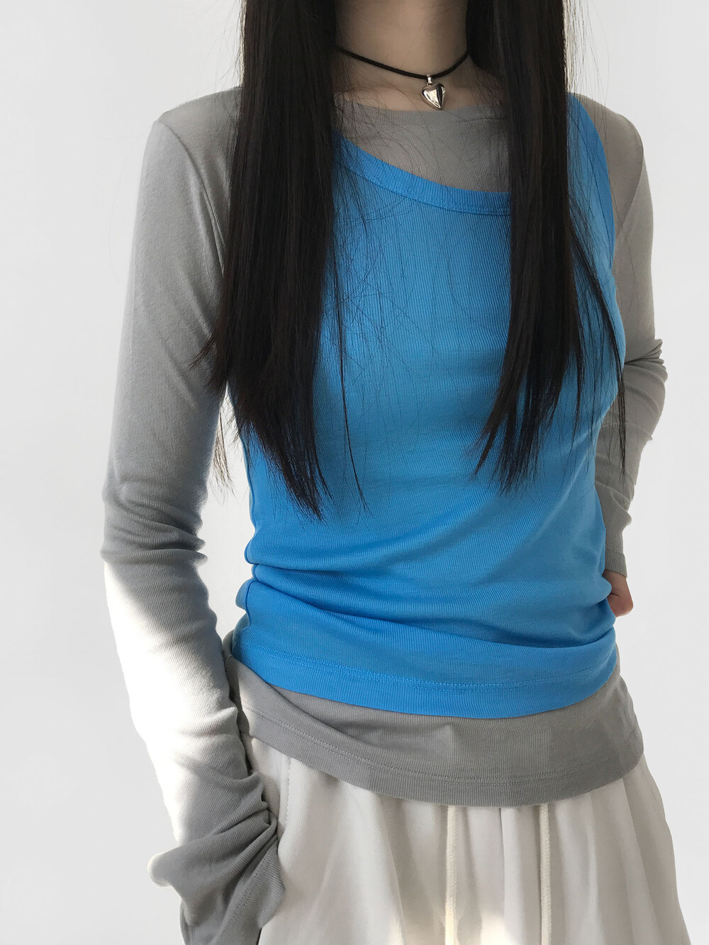 입었을 때 타이트하지 않고 그냥 부드럽게 몸을 감싸주는 소재로 레이어드를 좋아하는 분들에게 딱 알맞은 제품이에요. 요즘 쉬어한 소재의 이런 기본 탑들이 정말 트렌드에요. 컬렉션이나 하이엔드 브랜드들에서 정말 많이 보이는데, 우리 주변에서 찾으려면 은근히 이런 탑 찾기가 쉽지 않더라구요. 아까도 말씀드린 것처럼 너무 타이트 하지 않으면서도 바디라인을 못나보이지 않게 해주는 그런 기본티 찾기가 쉽지 않잖아요.