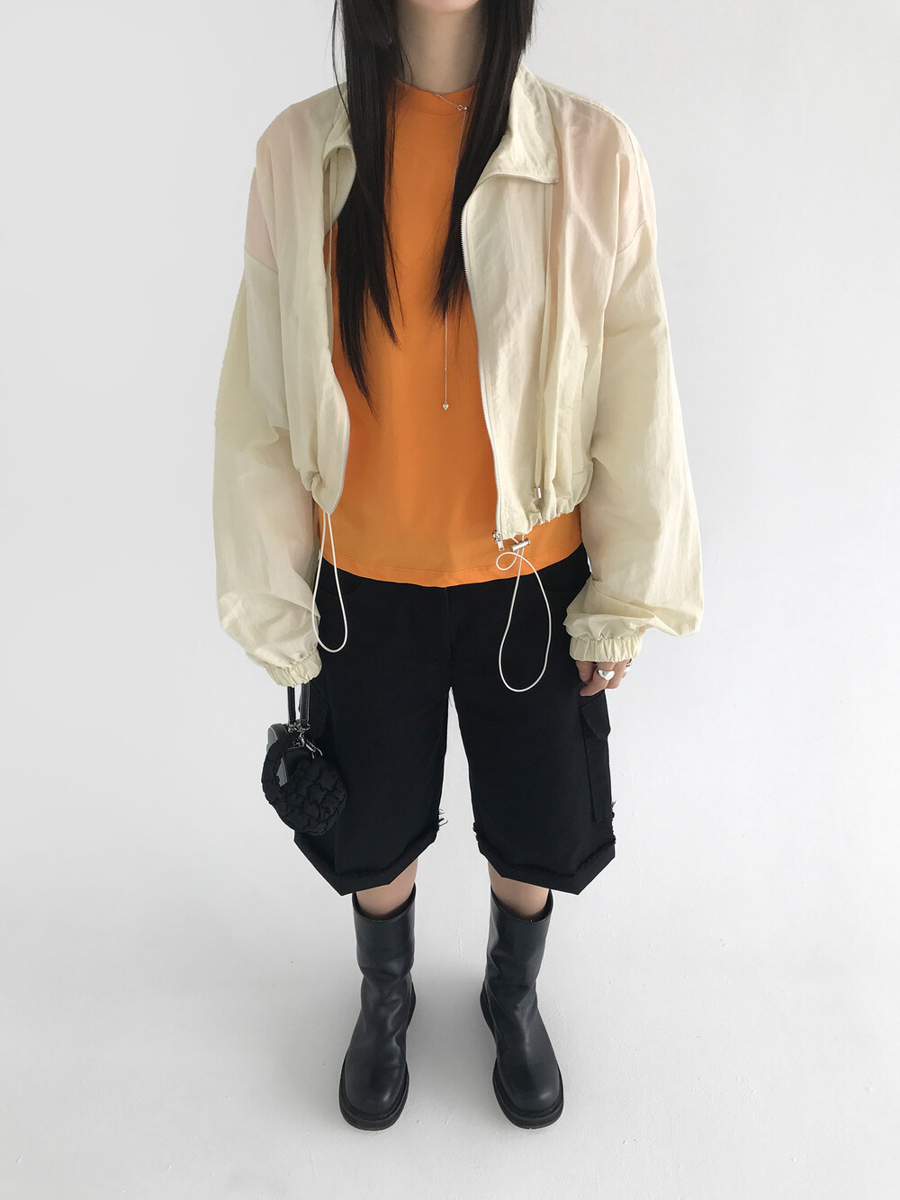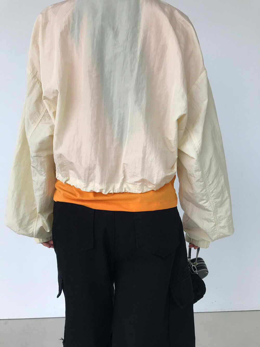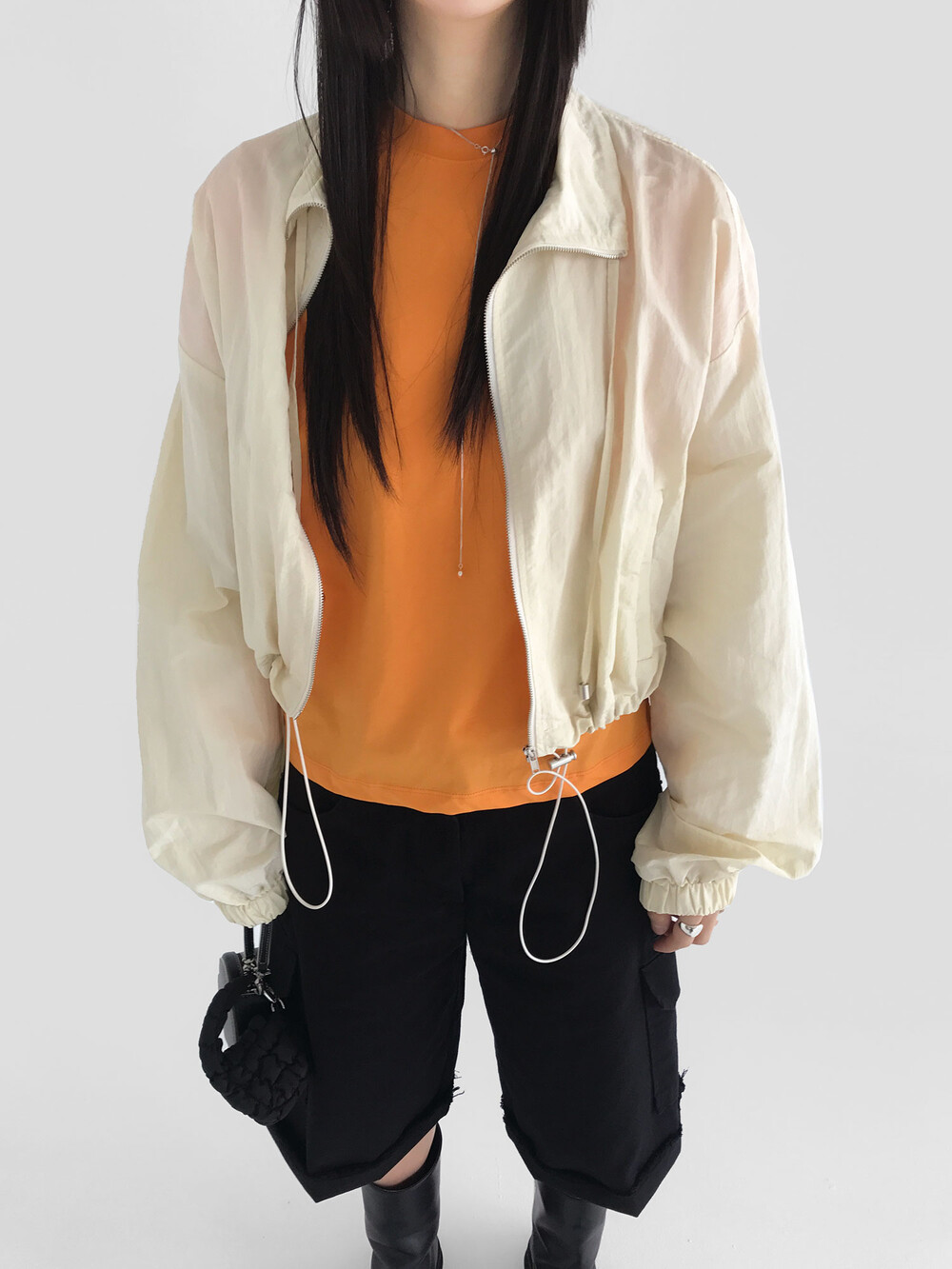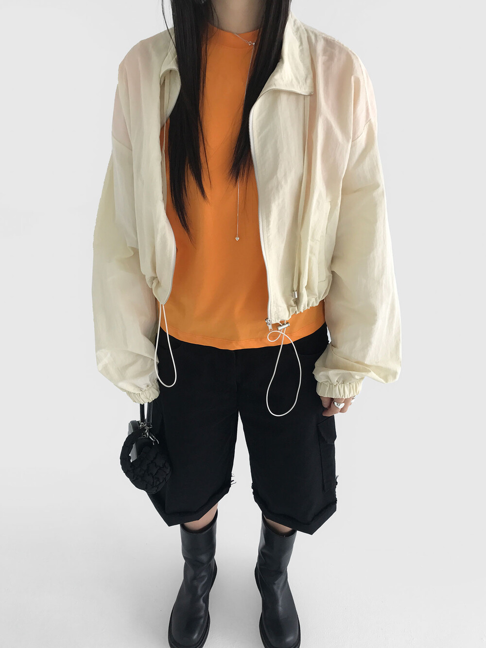 잘 접어서 가방에 넣기에도 좋은 그런 가벼운 크롭 바람막이 점퍼를 준비했어요.