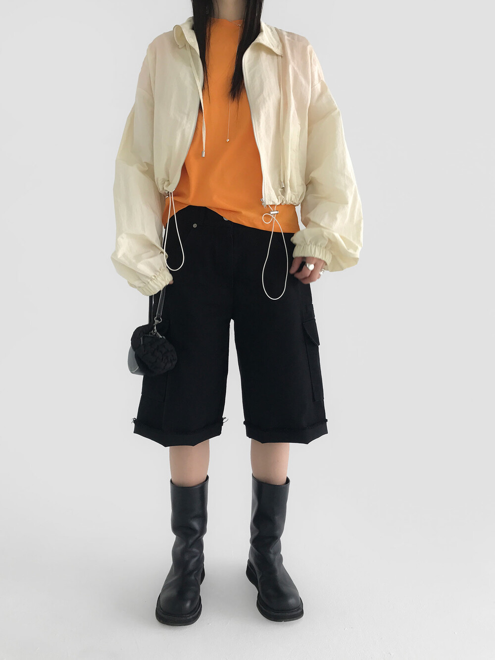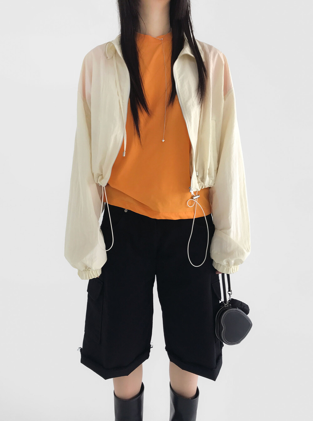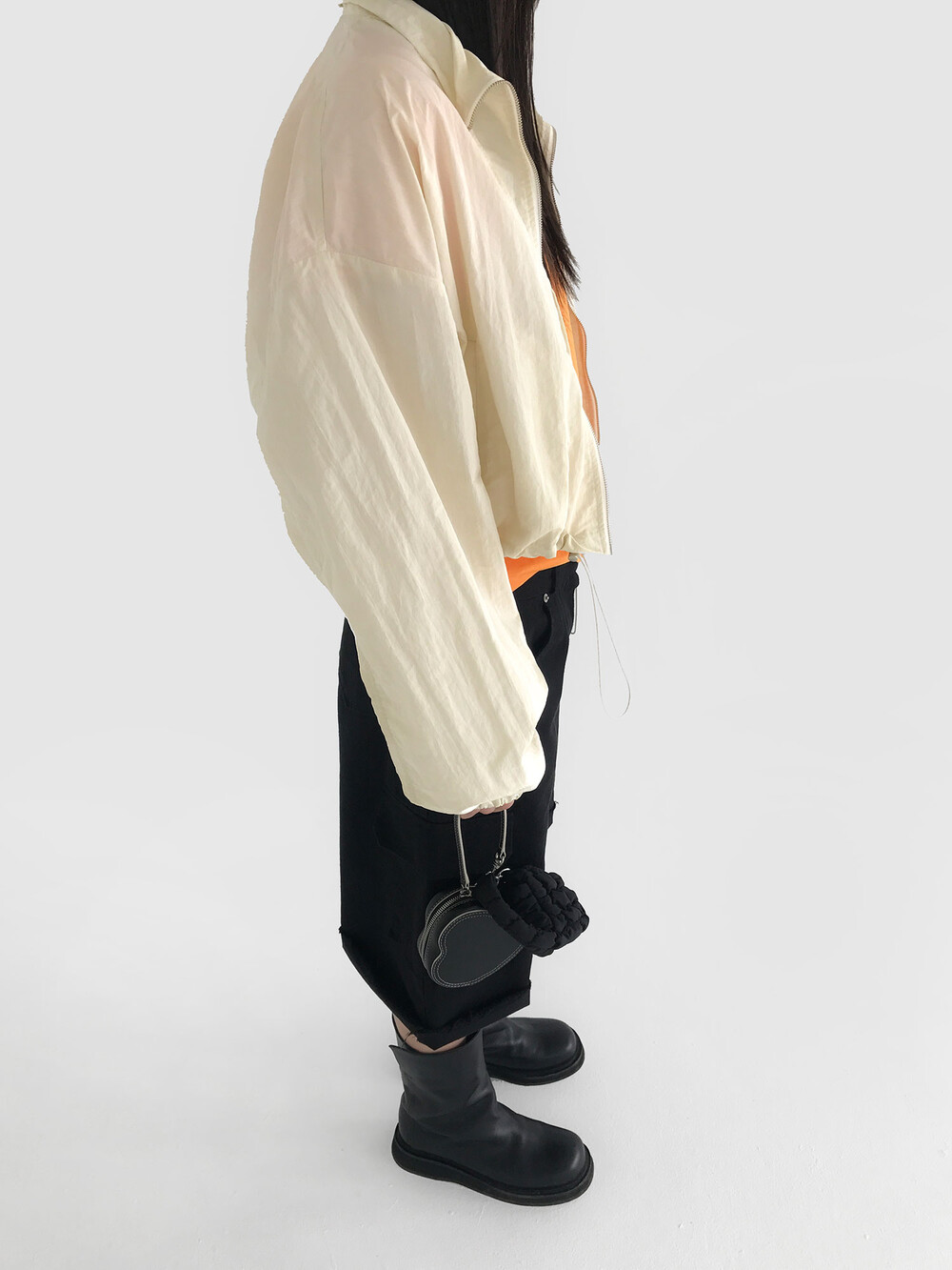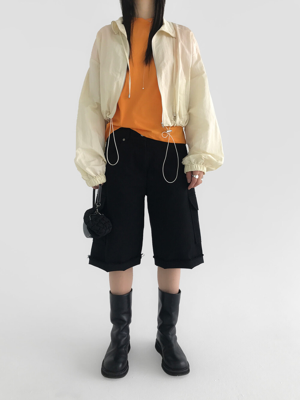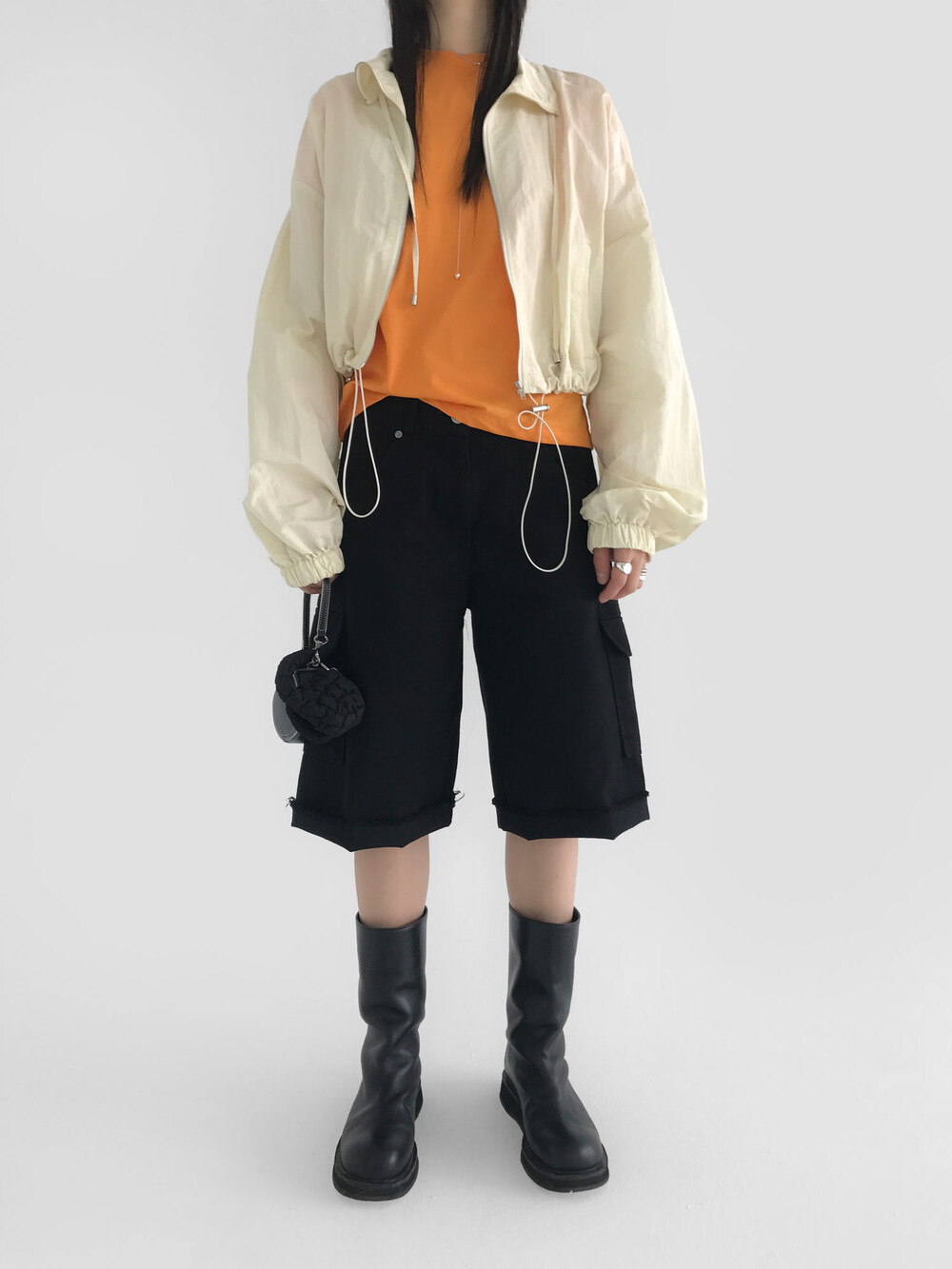 잘 접어서 가방에 넣기에도 좋은 그런 가벼운 크롭 바람막이 점퍼를 준비했어요.