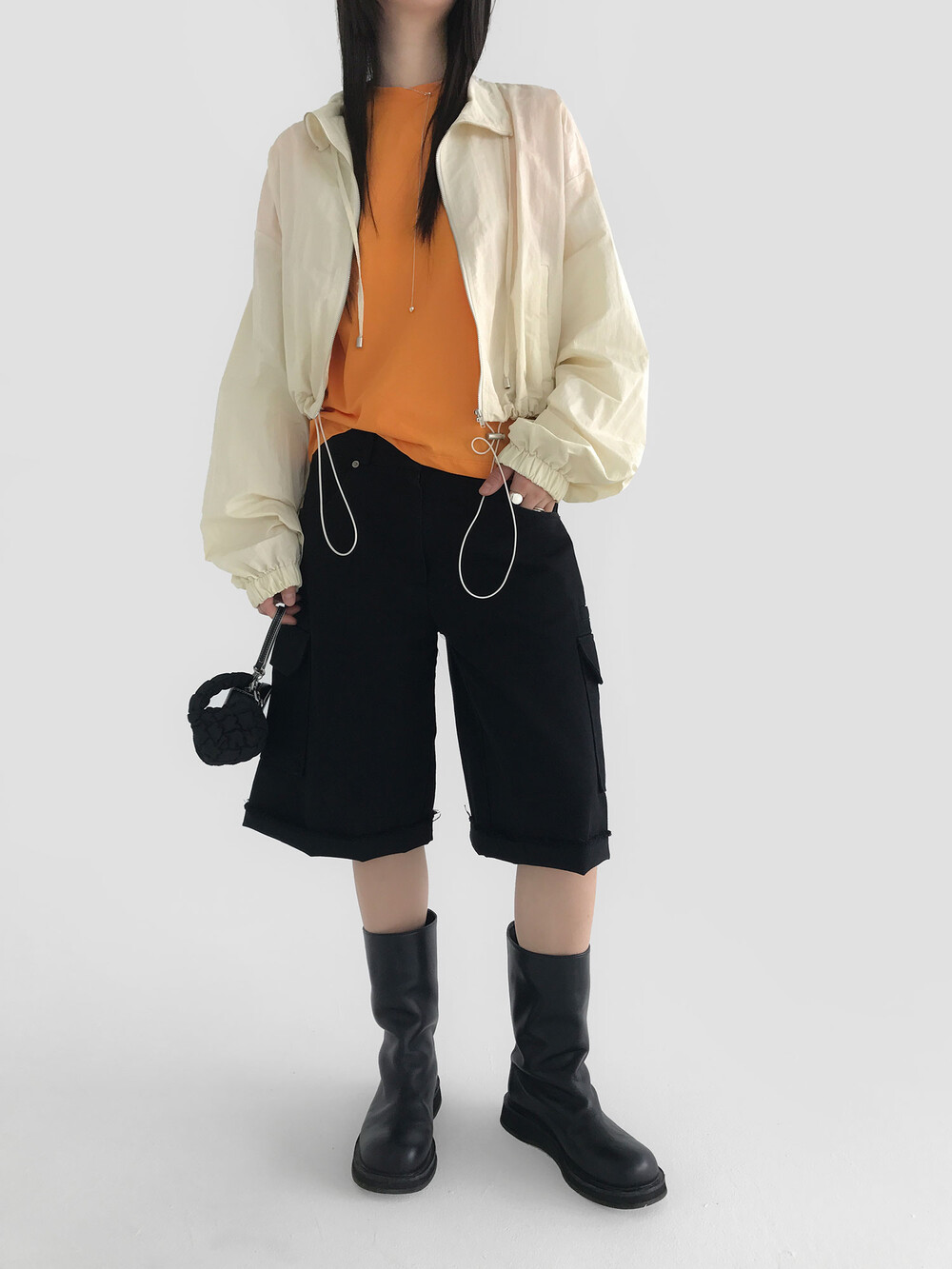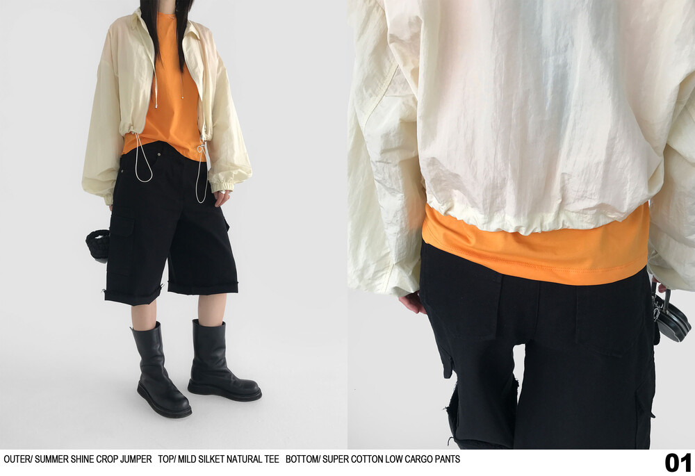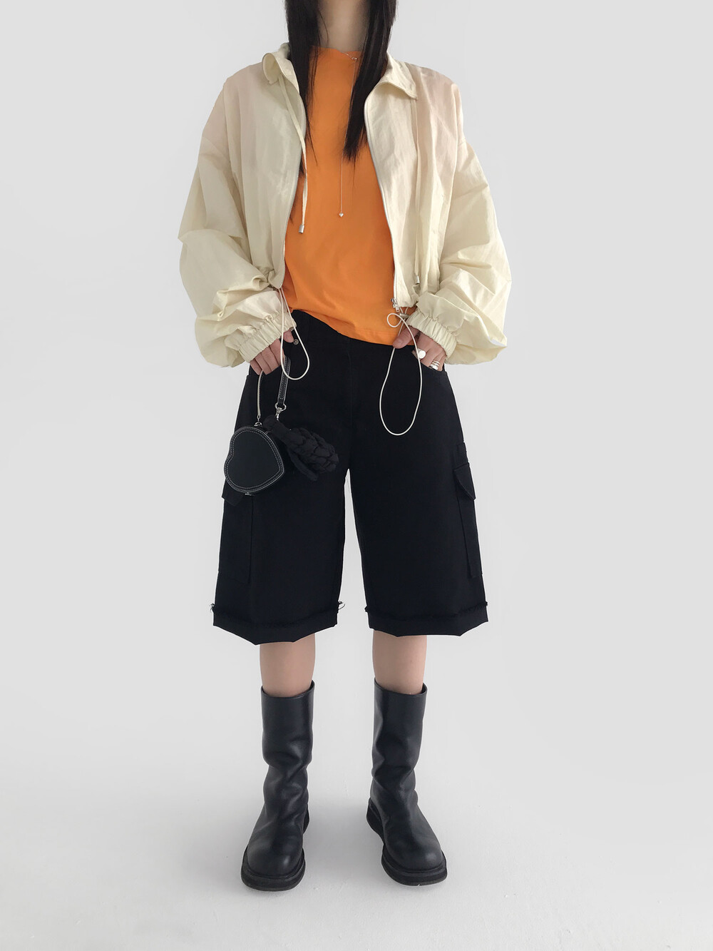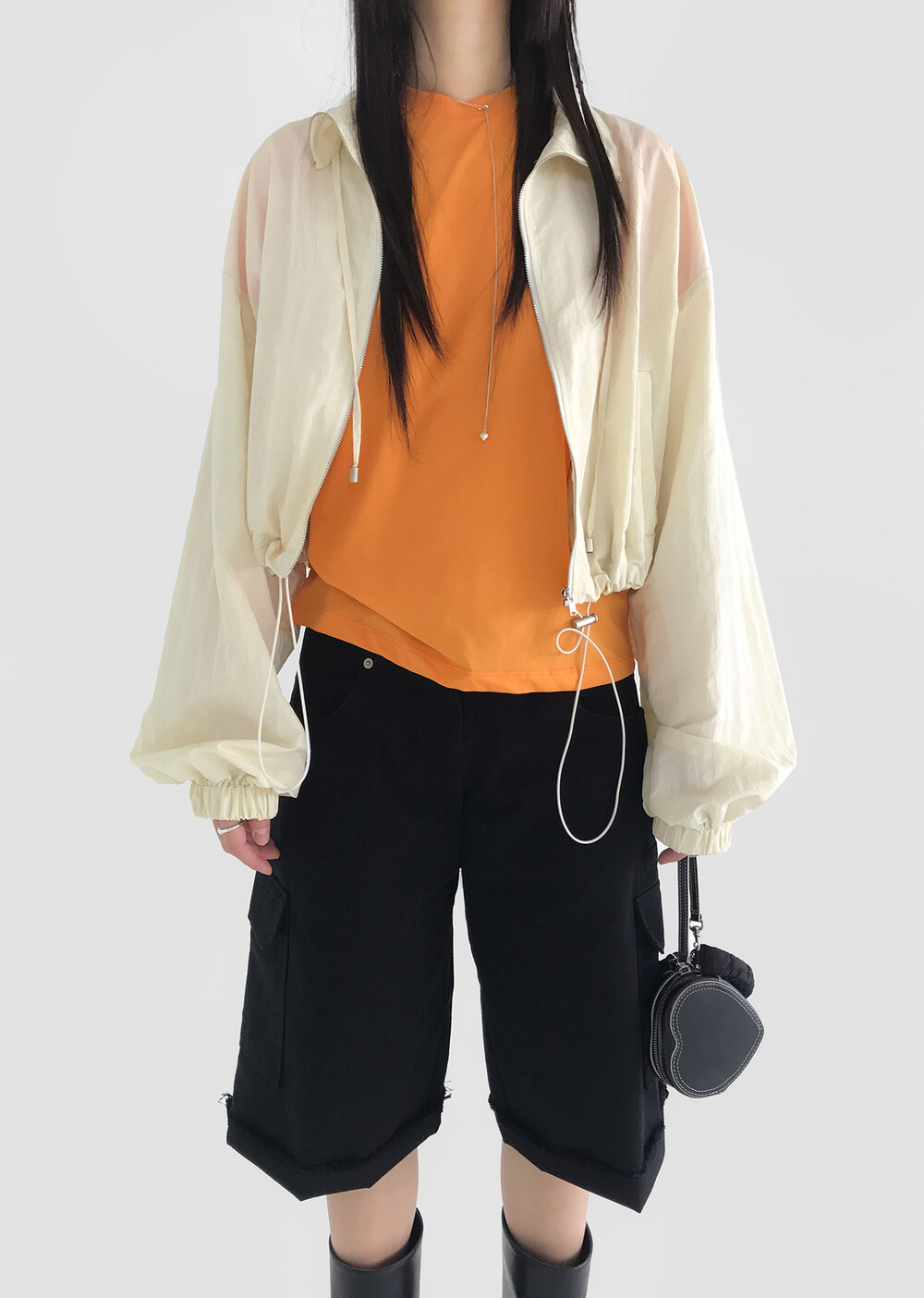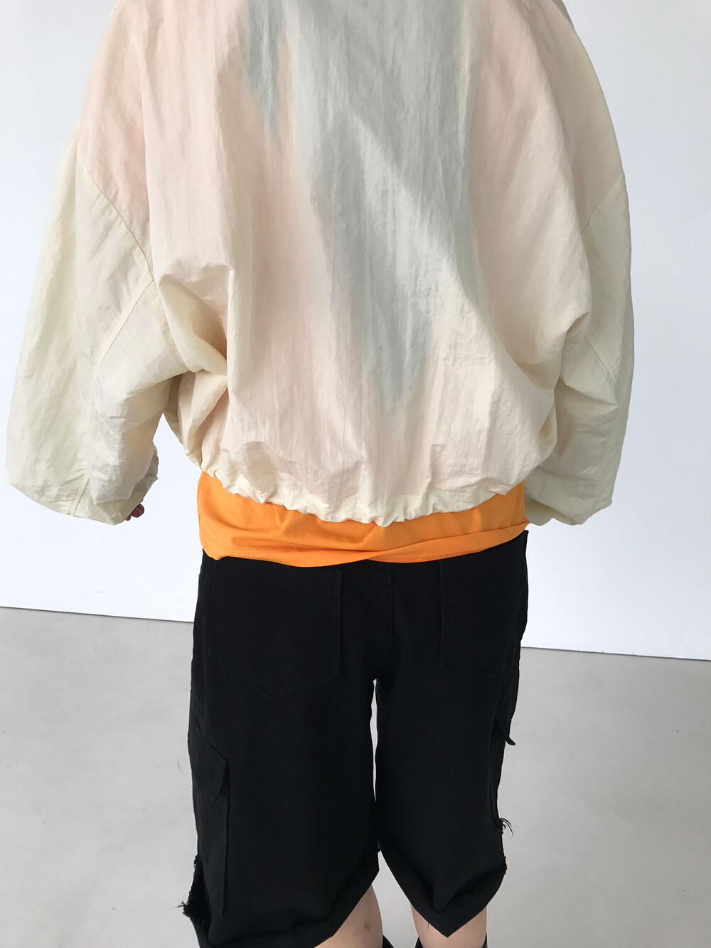 잘 접어서 가방에 넣기에도 좋은 그런 가벼운 크롭 바람막이 점퍼를 준비했어요.