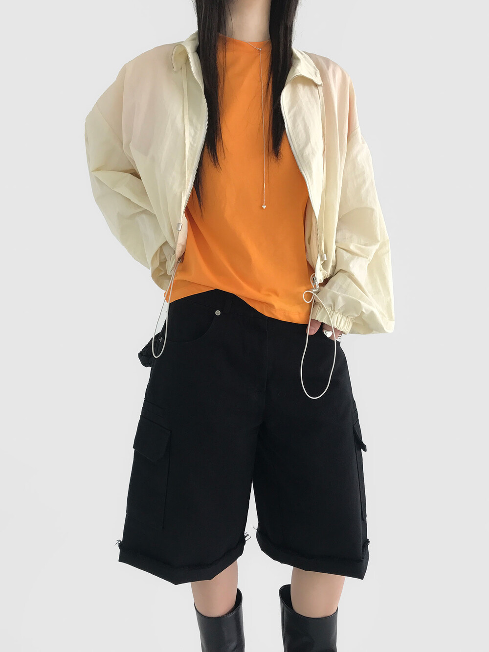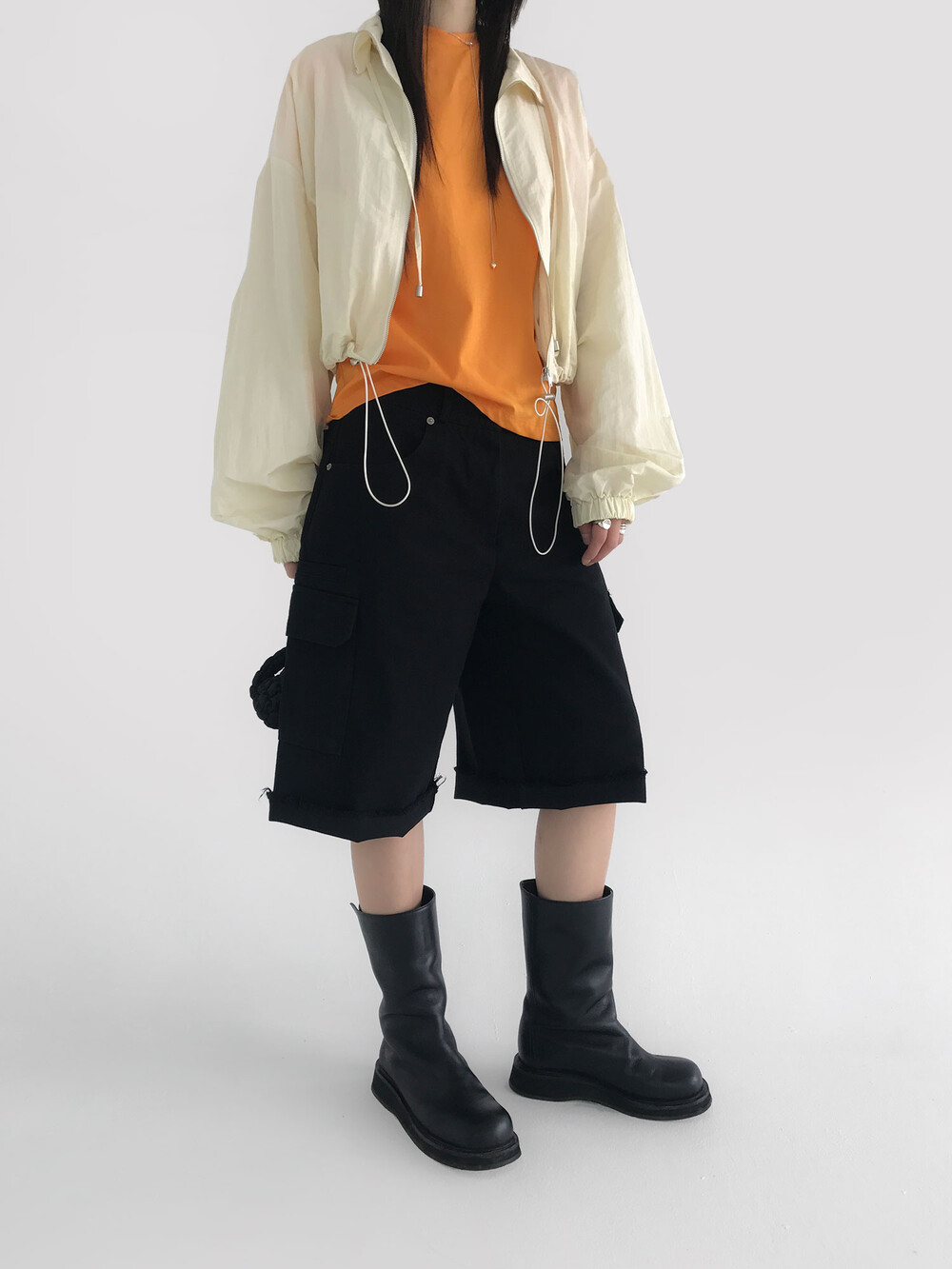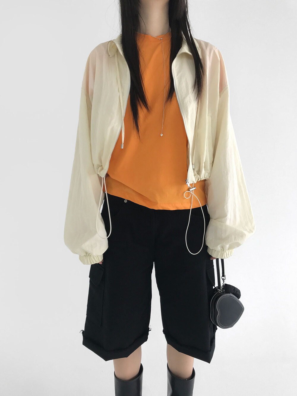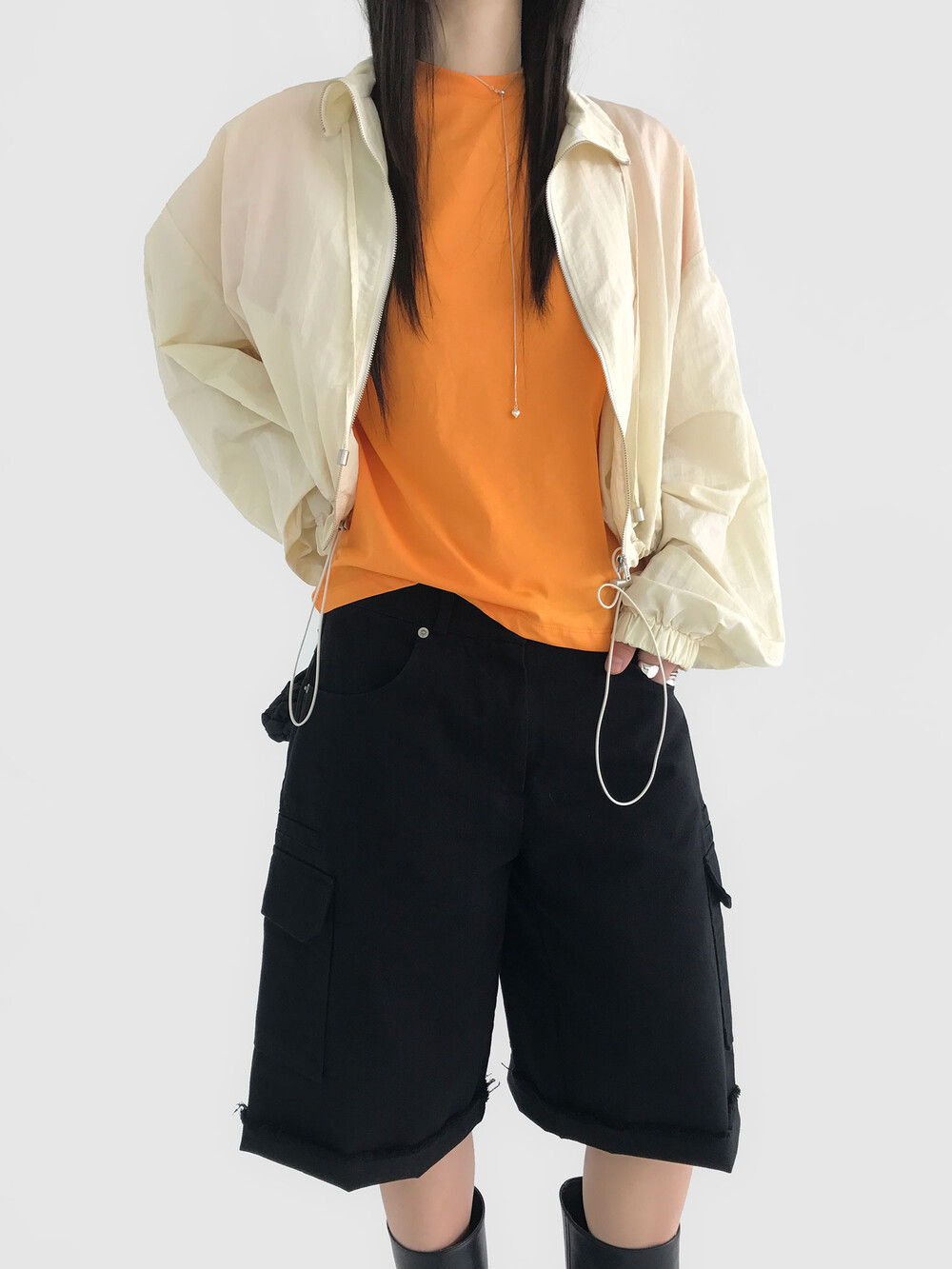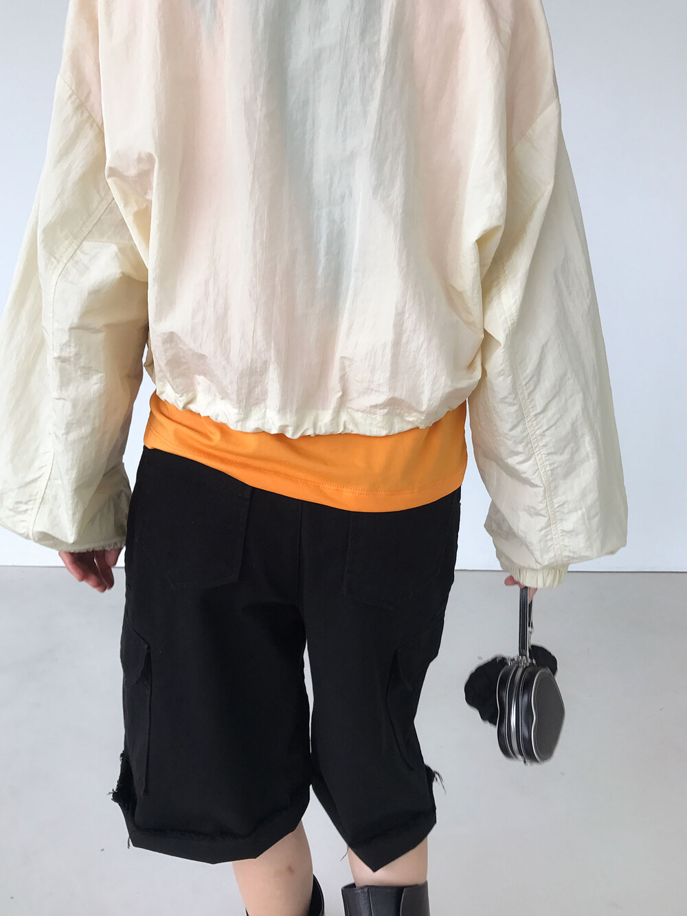 잘 접어서 가방에 넣기에도 좋은 그런 가벼운 크롭 바람막이 점퍼를 준비했어요.