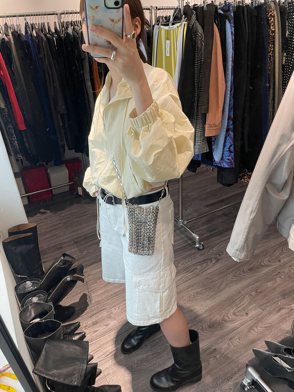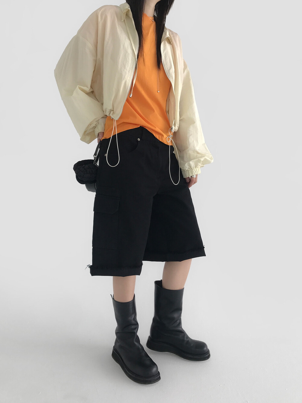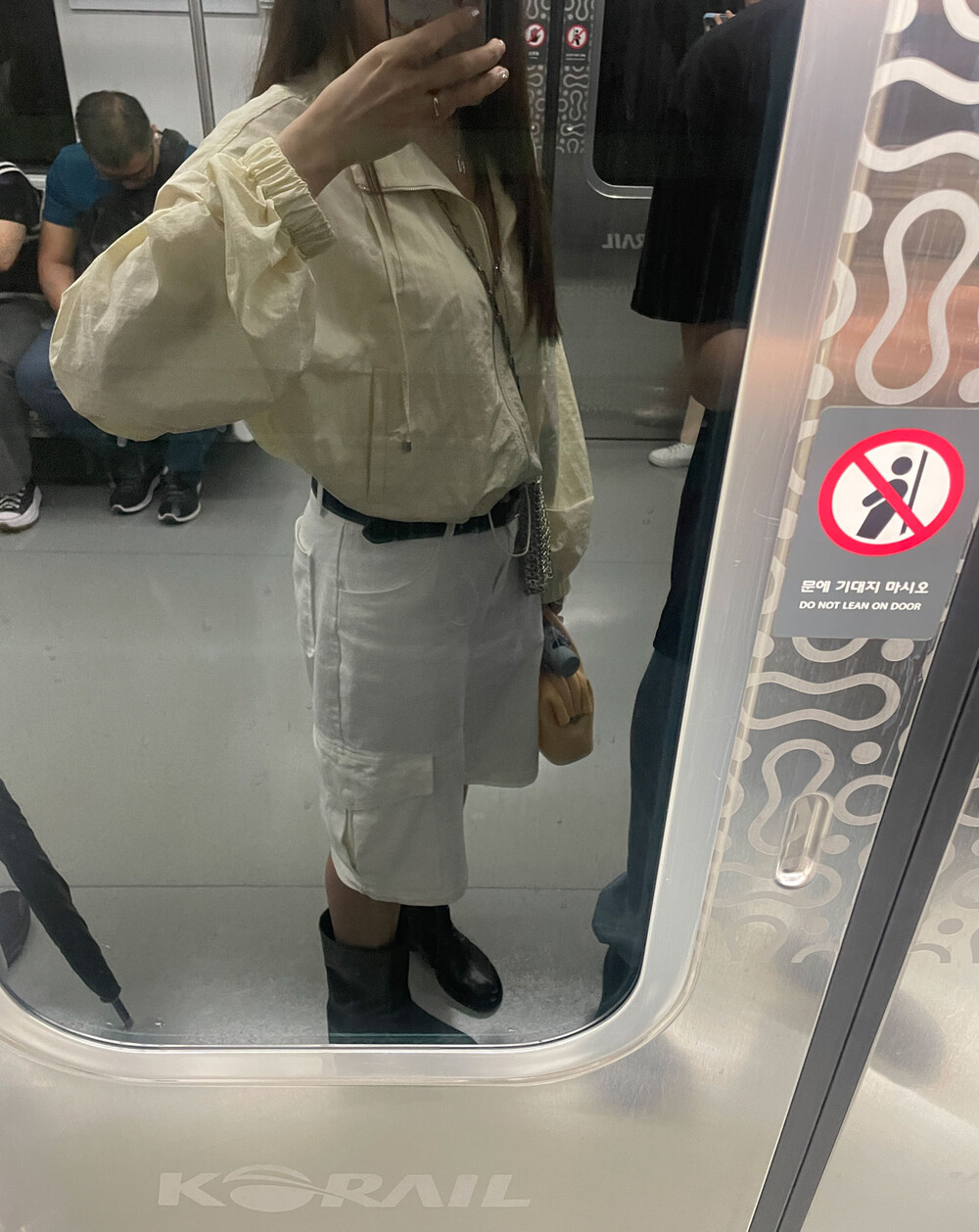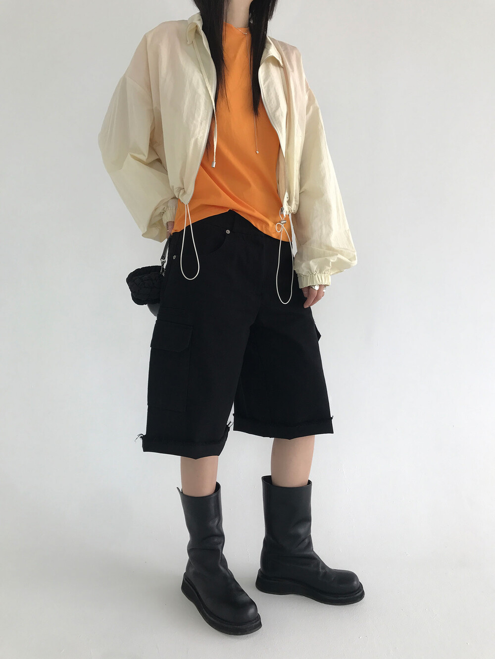 잘 접어서 가방에 넣기에도 좋은 그런 가벼운 크롭 바람막이 점퍼를 준비했어요.