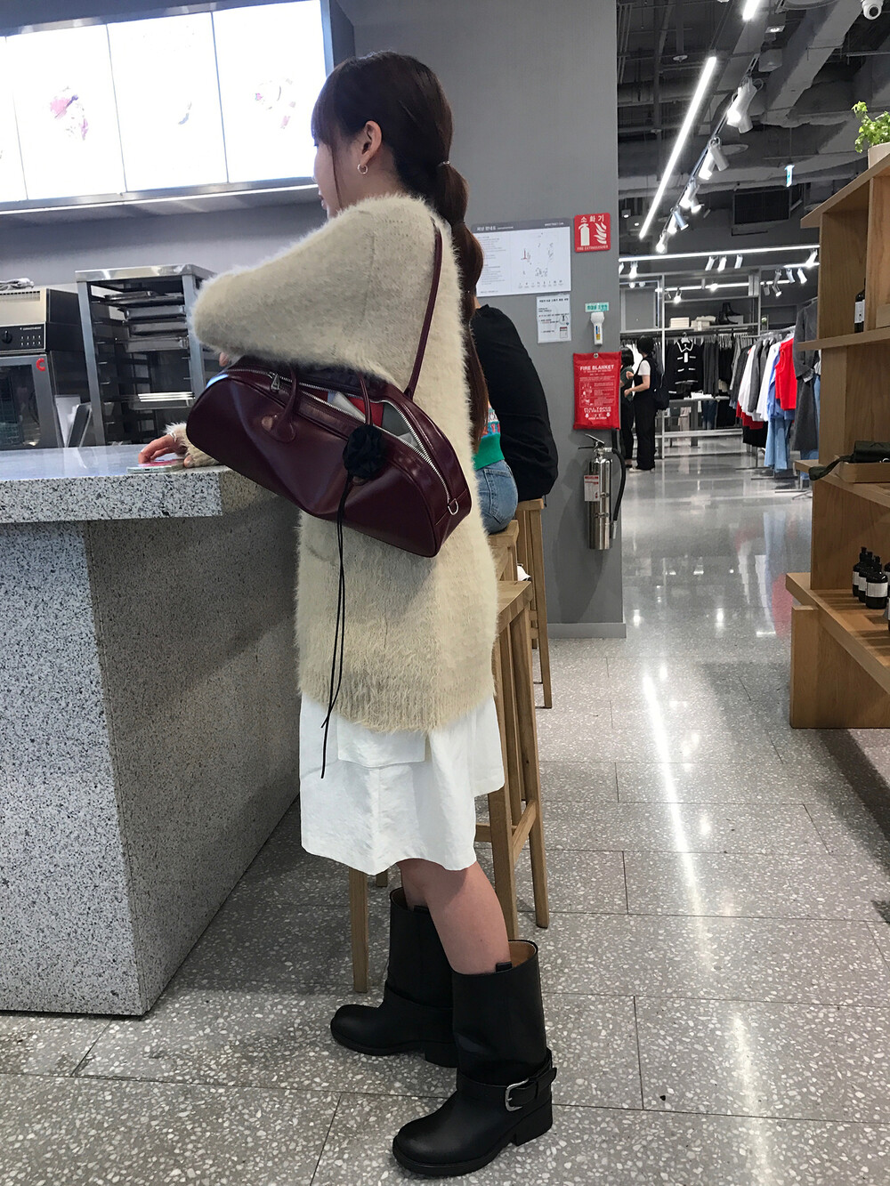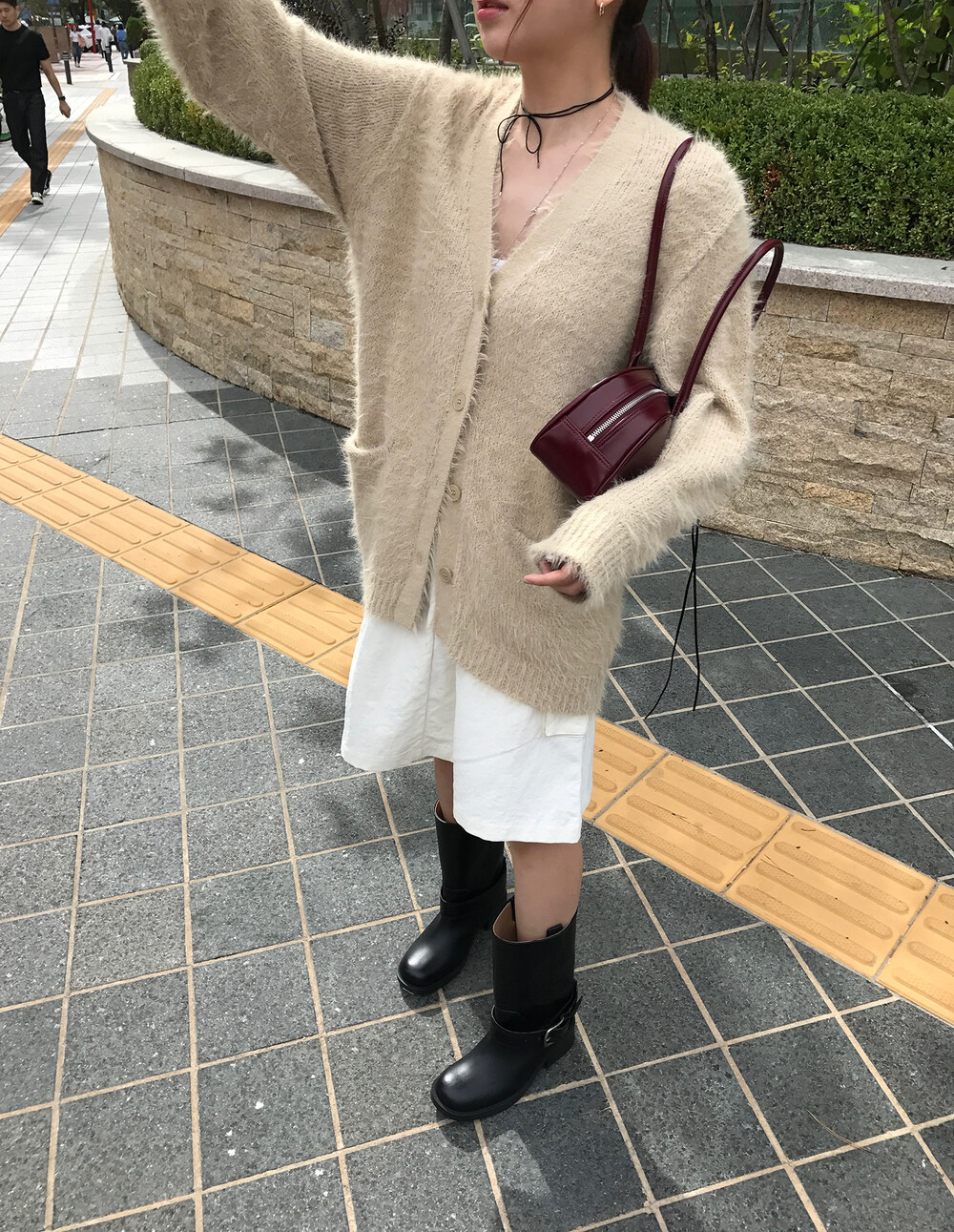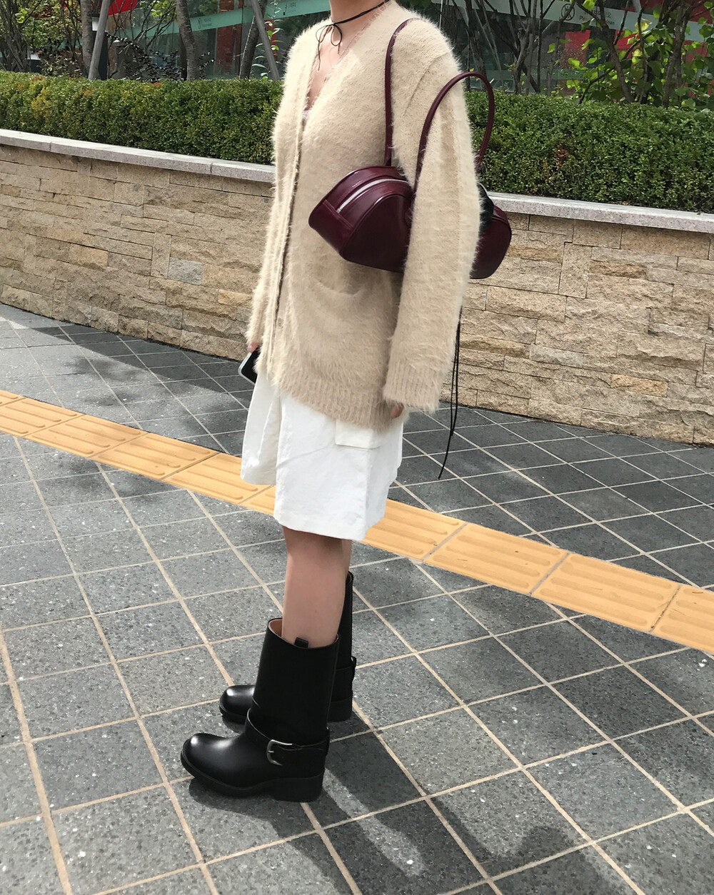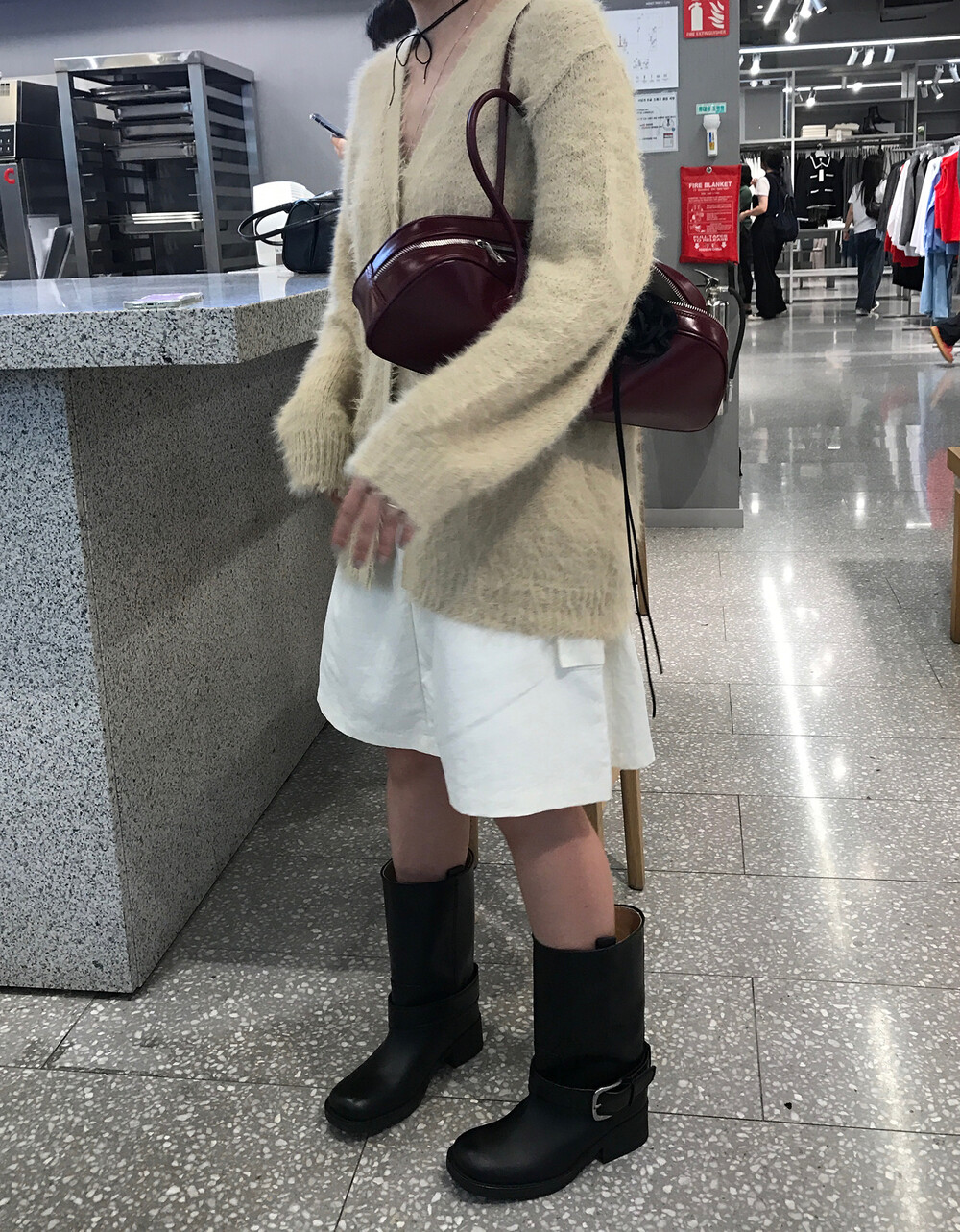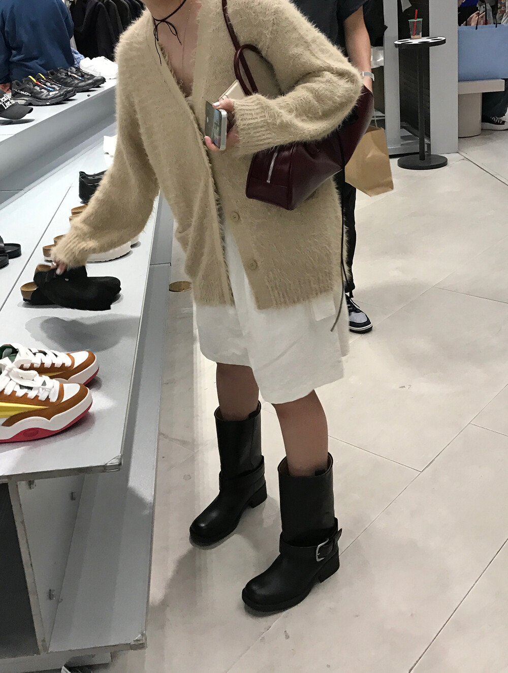 스포티한 짧은 반바지를 매치해서 부츠랑 연출하고 있는데