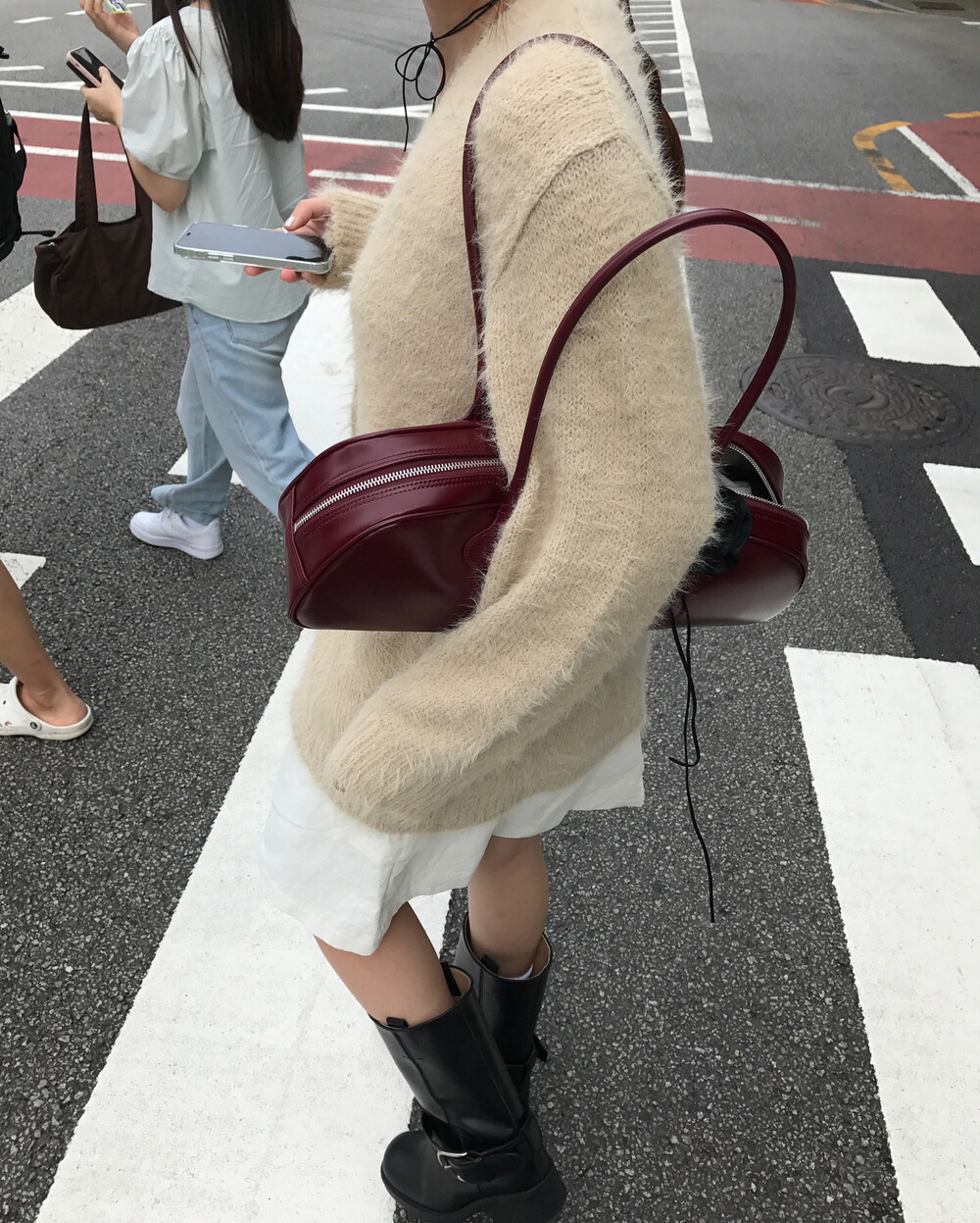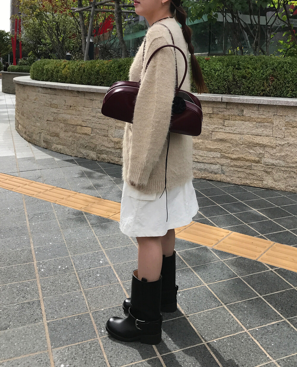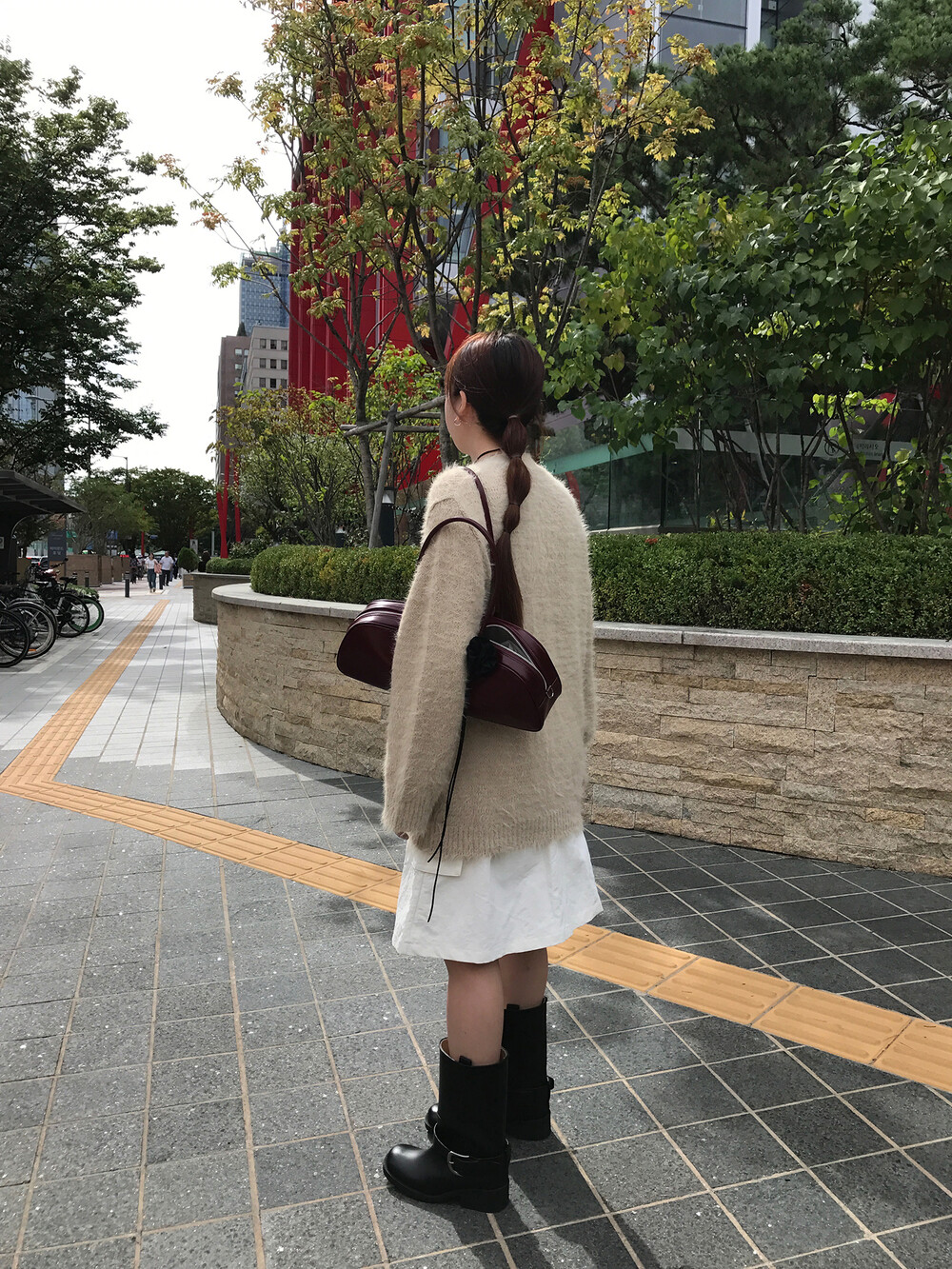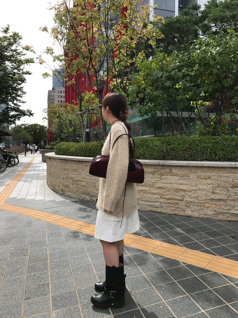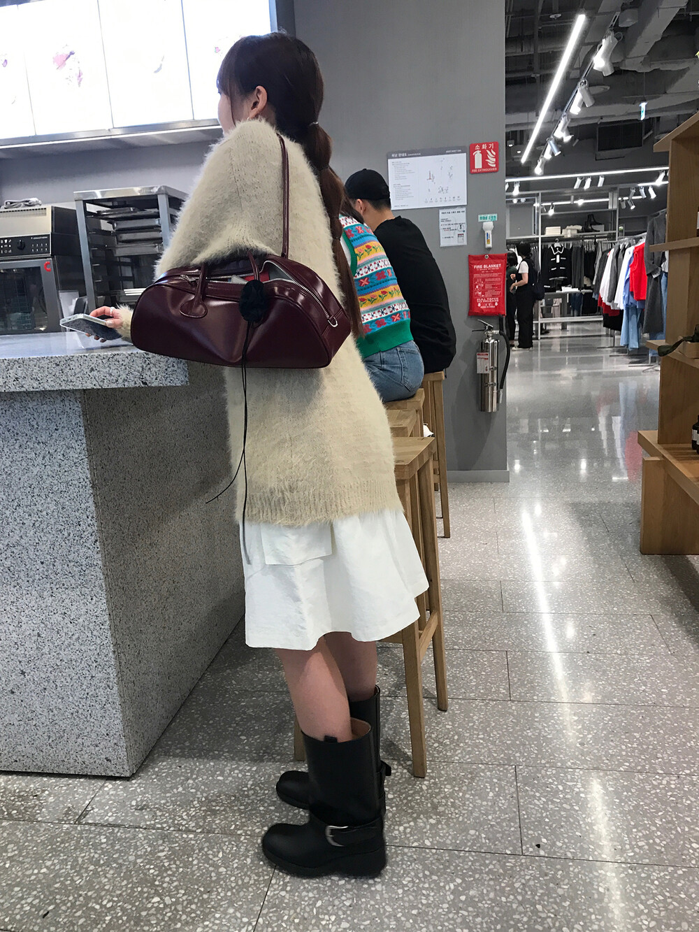 스포티한 짧은 반바지를 매치해서 부츠랑 연출하고 있는데
