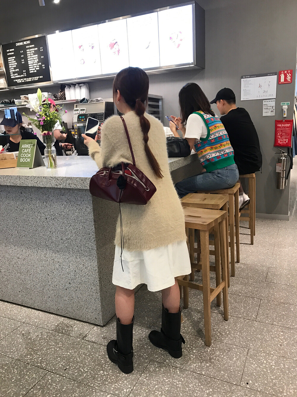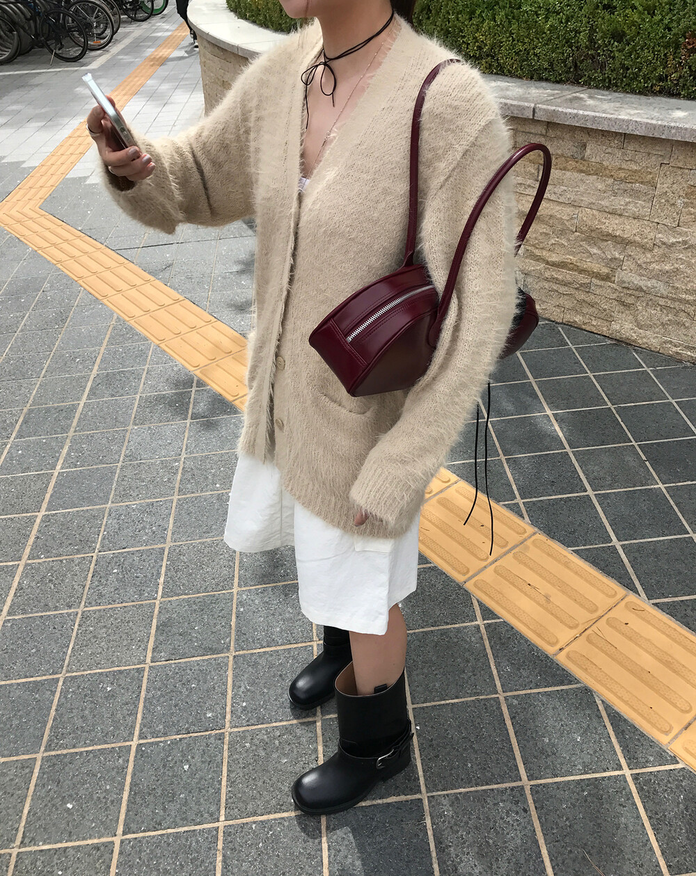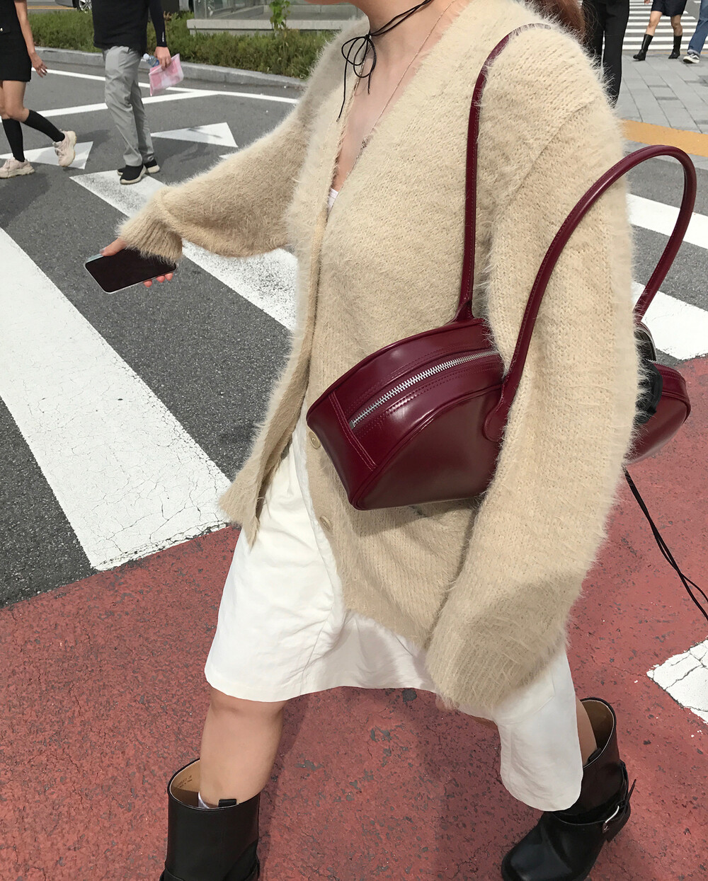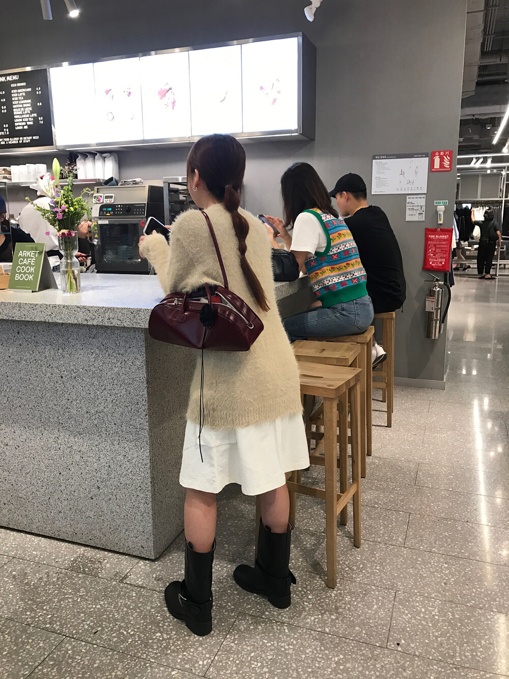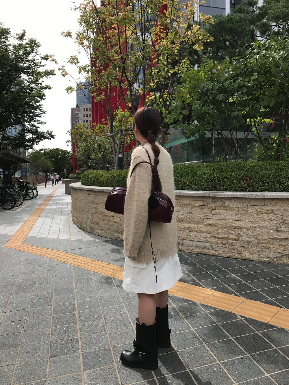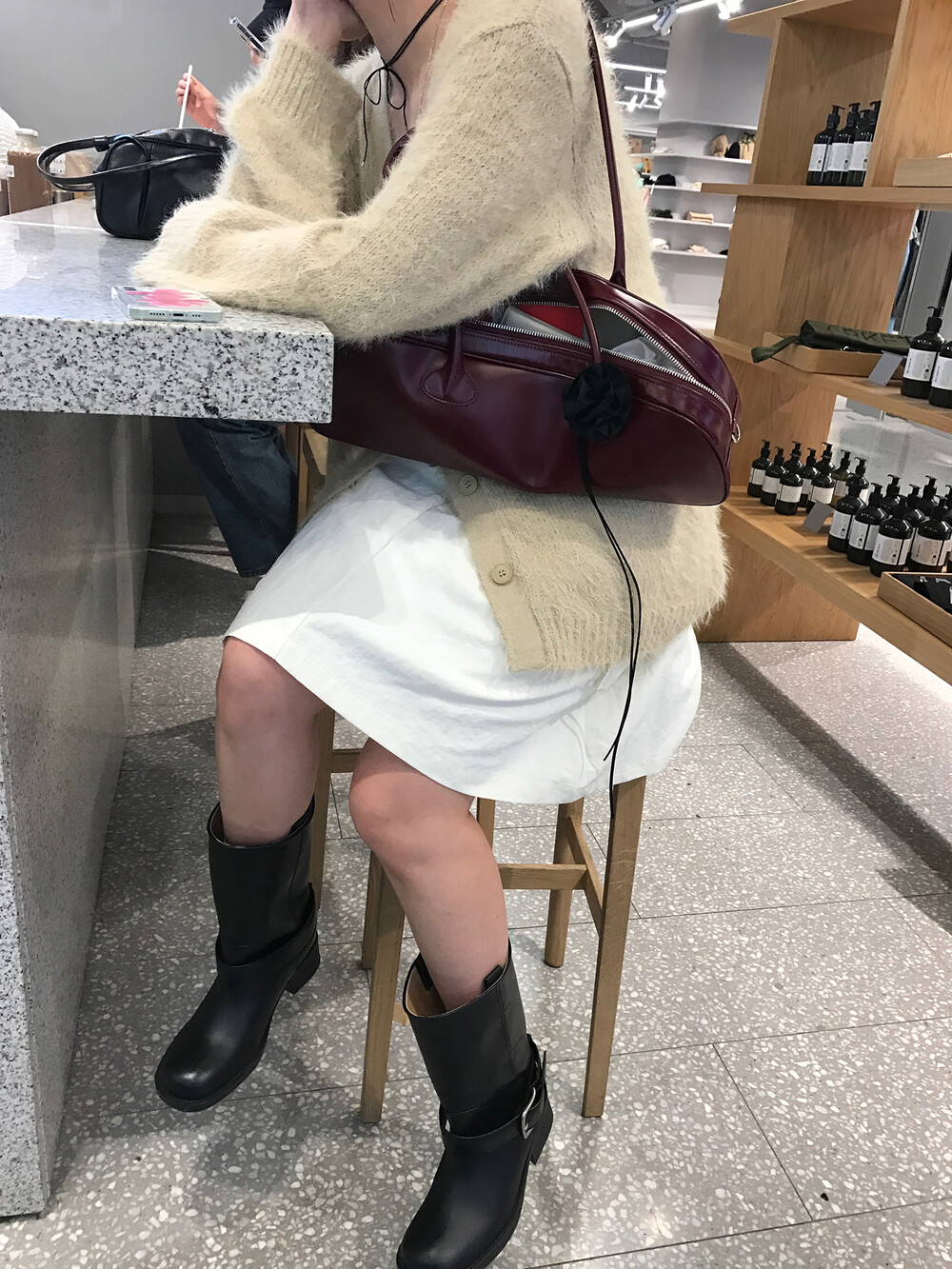 스포티한 짧은 반바지를 매치해서 부츠랑 연출하고 있는데