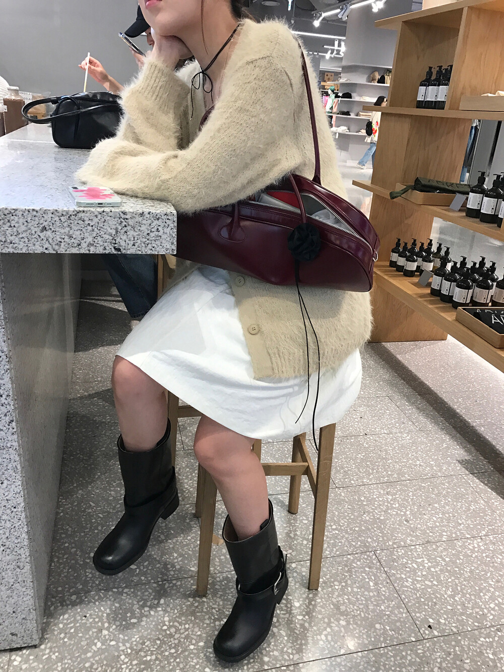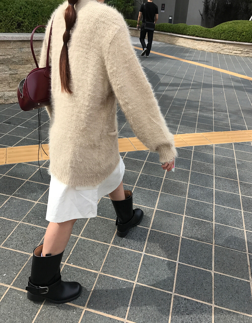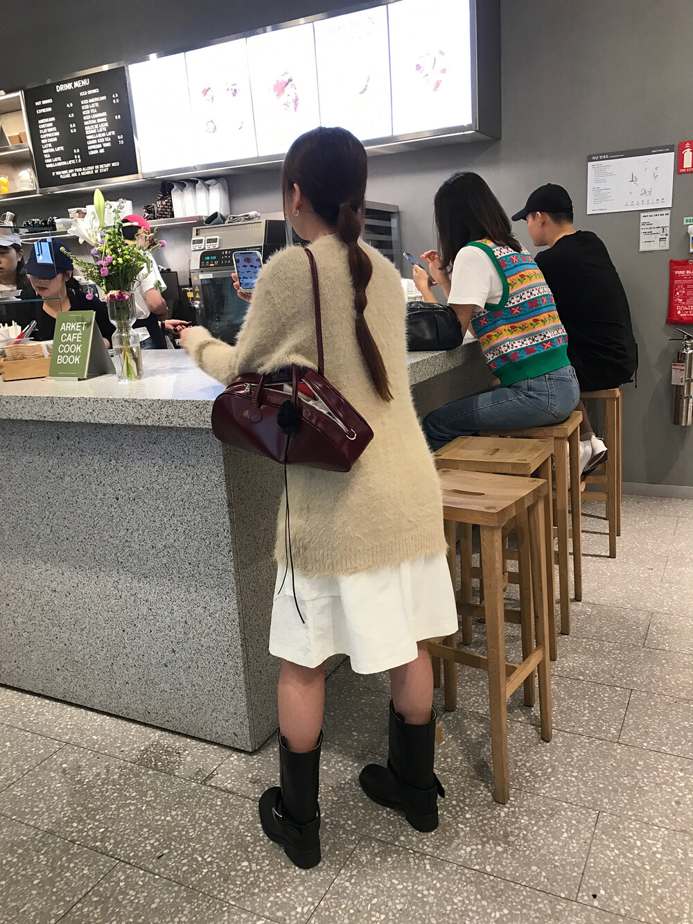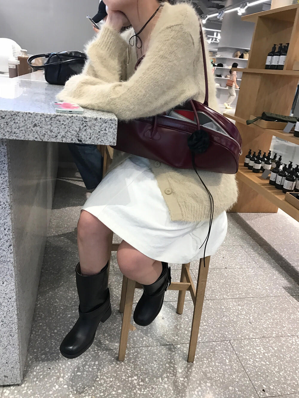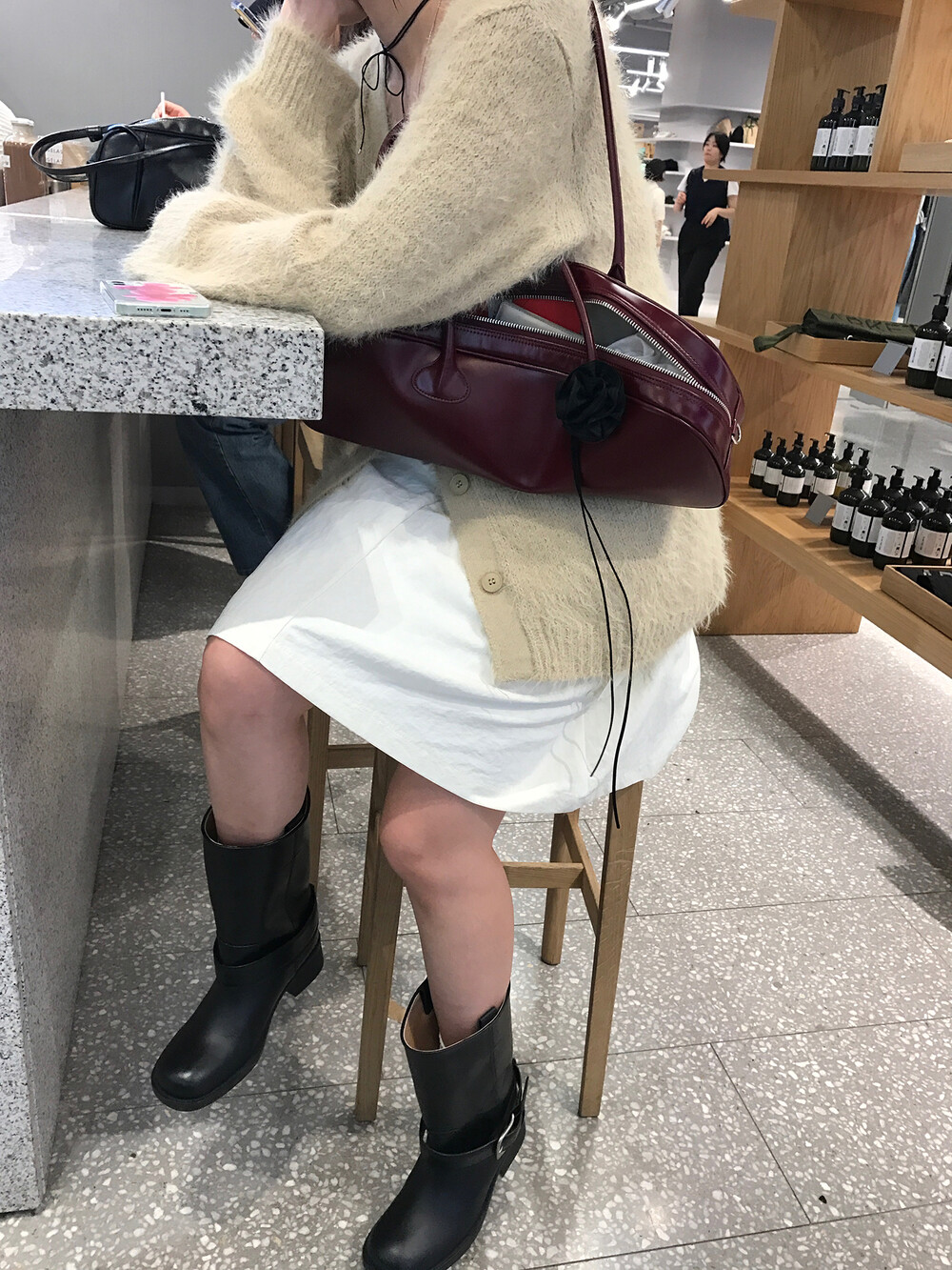 스포티한 짧은 반바지를 매치해서 부츠랑 연출하고 있는데