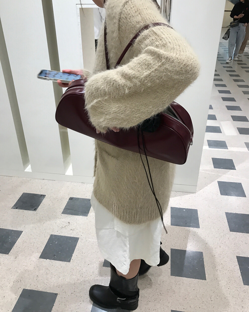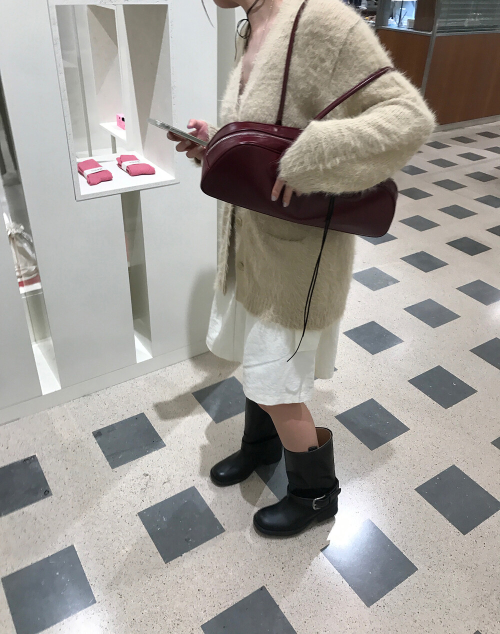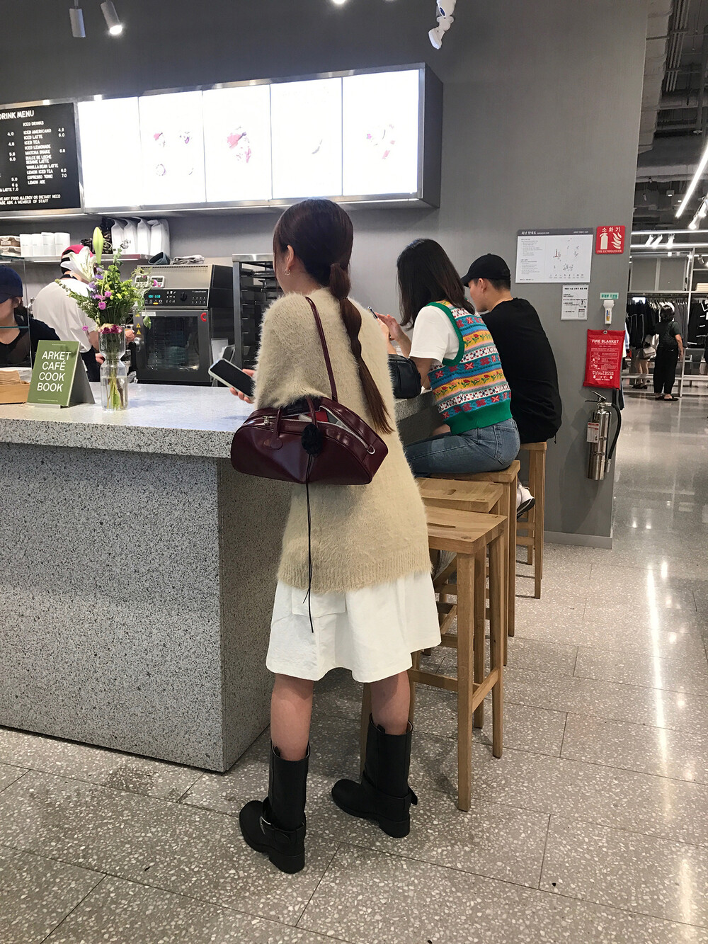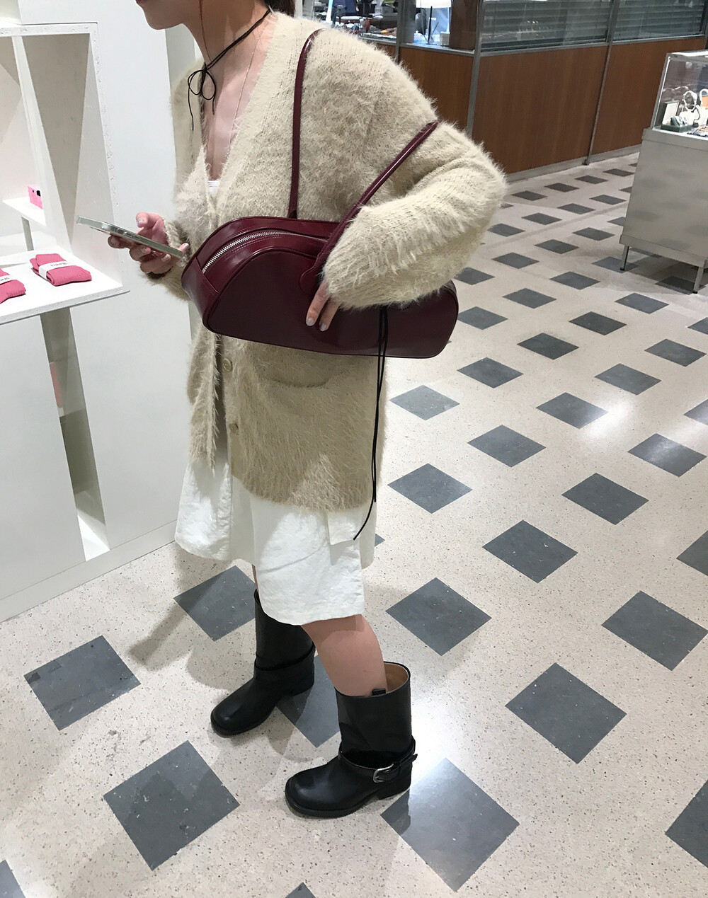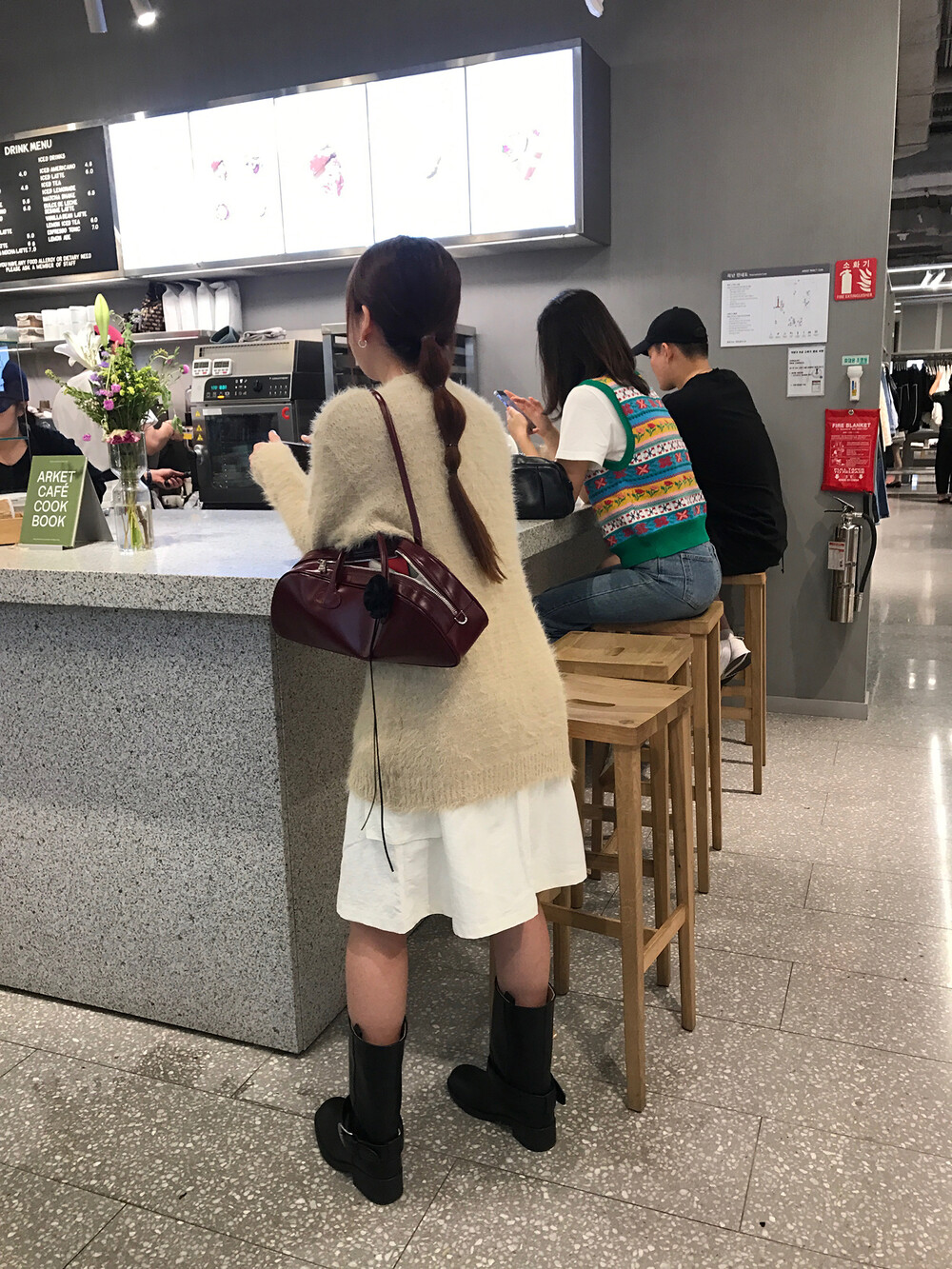 스포티한 짧은 반바지를 매치해서 부츠랑 연출하고 있는데