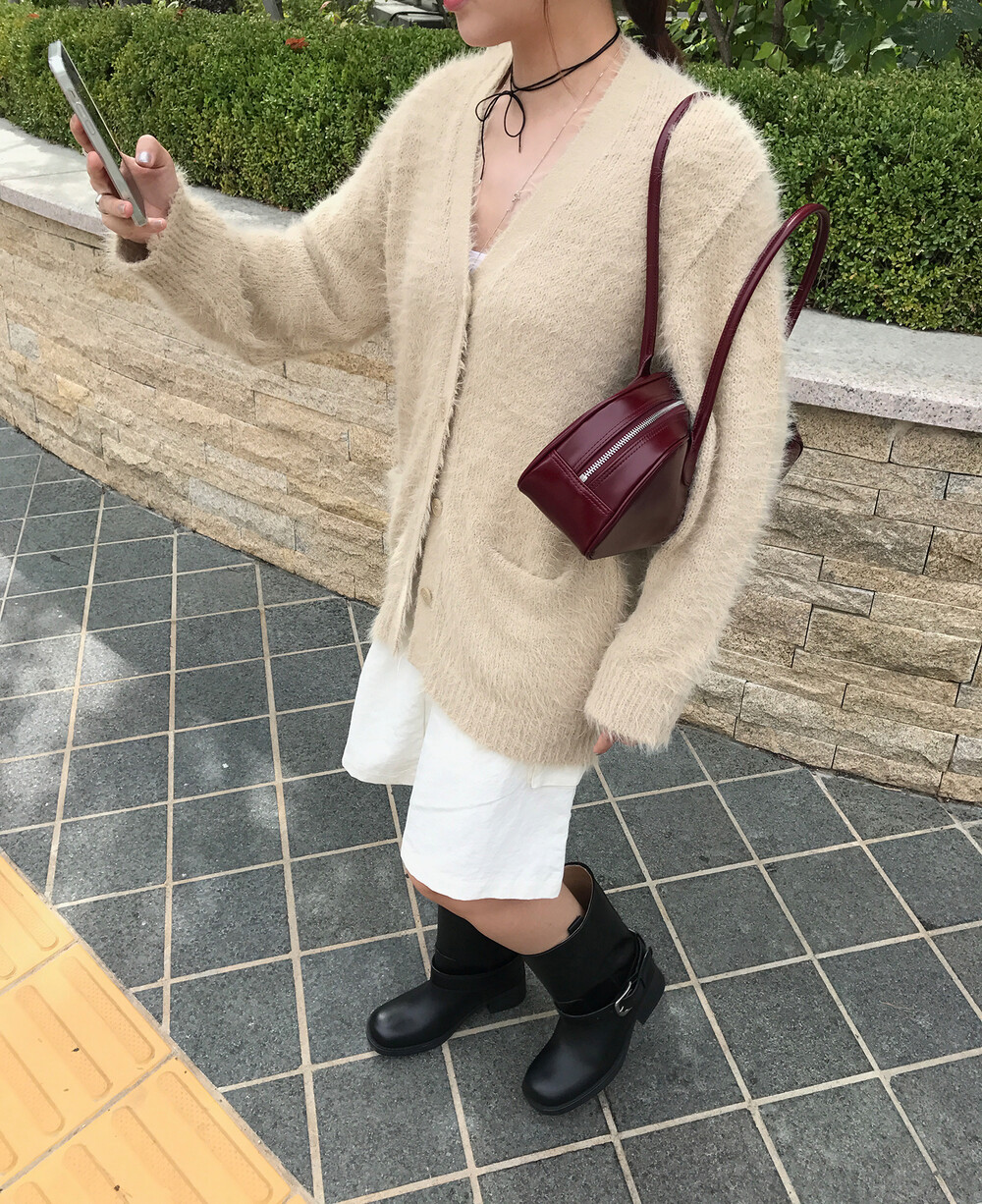 이 가디건은 잠궈서 입었을 때는 반바지나 짧은 스커트에 매치하면