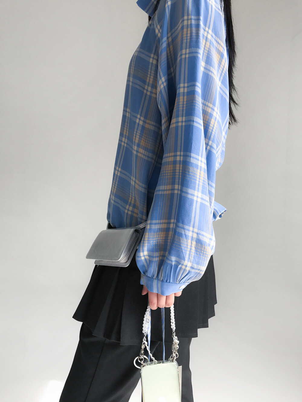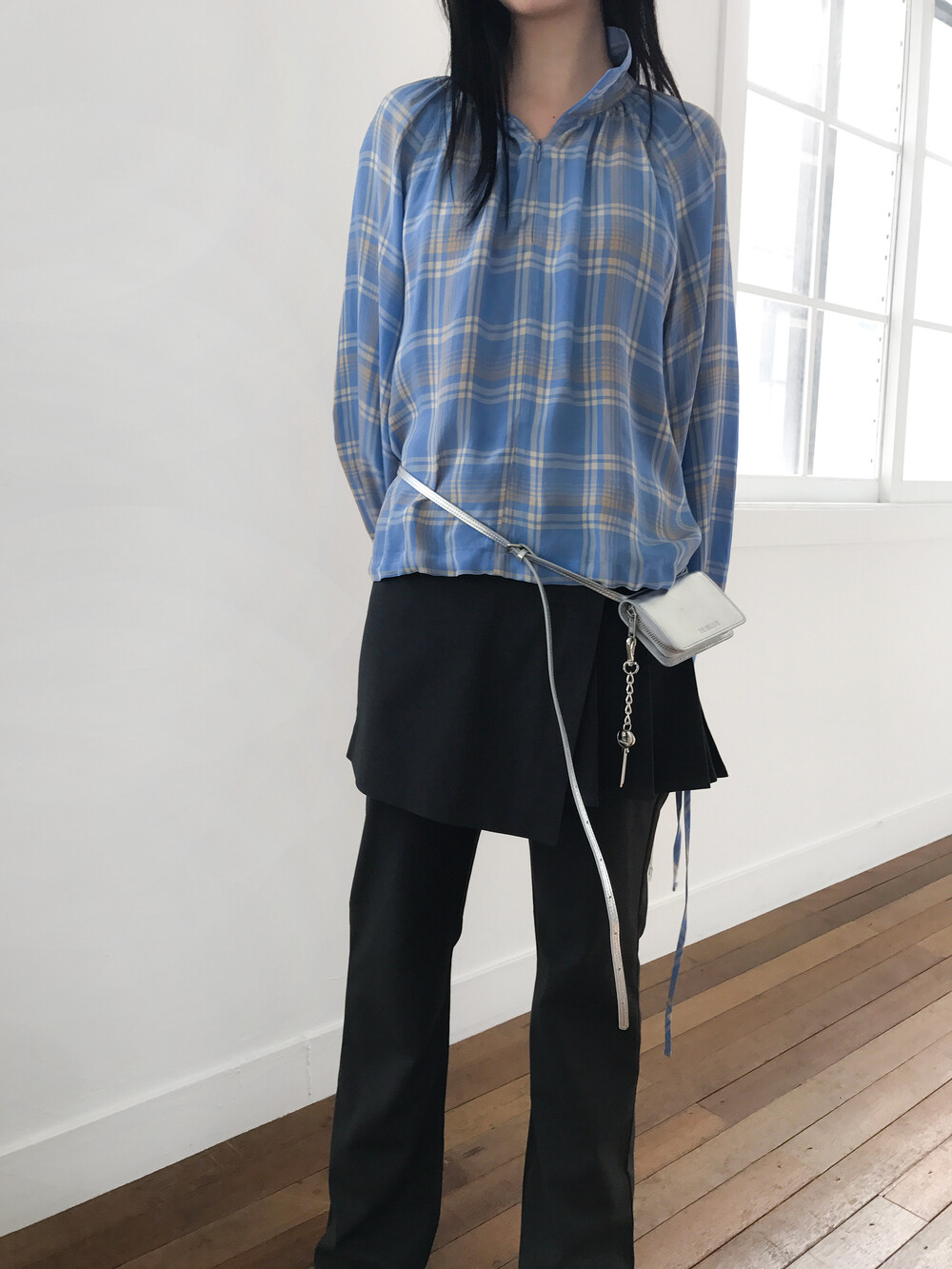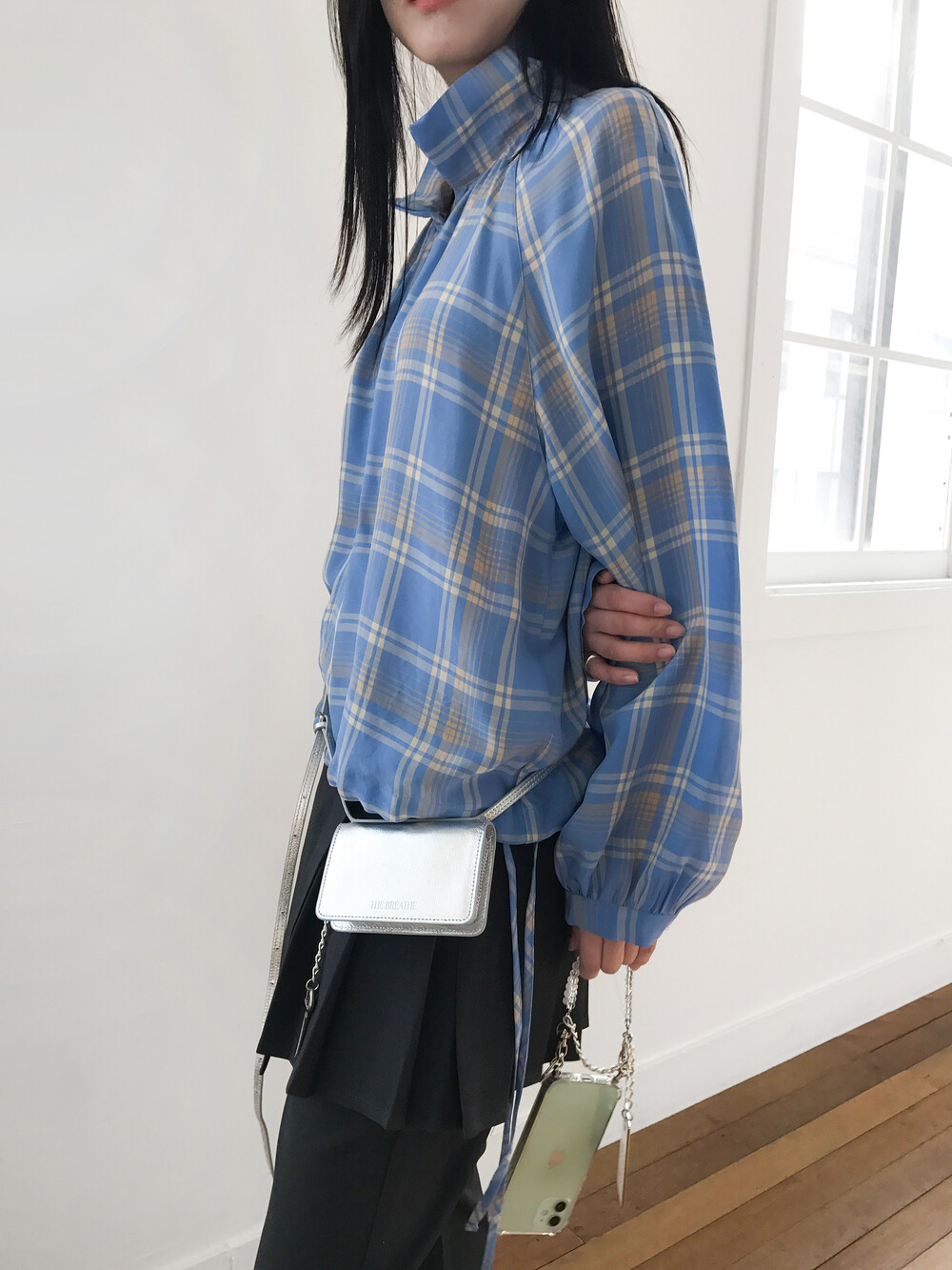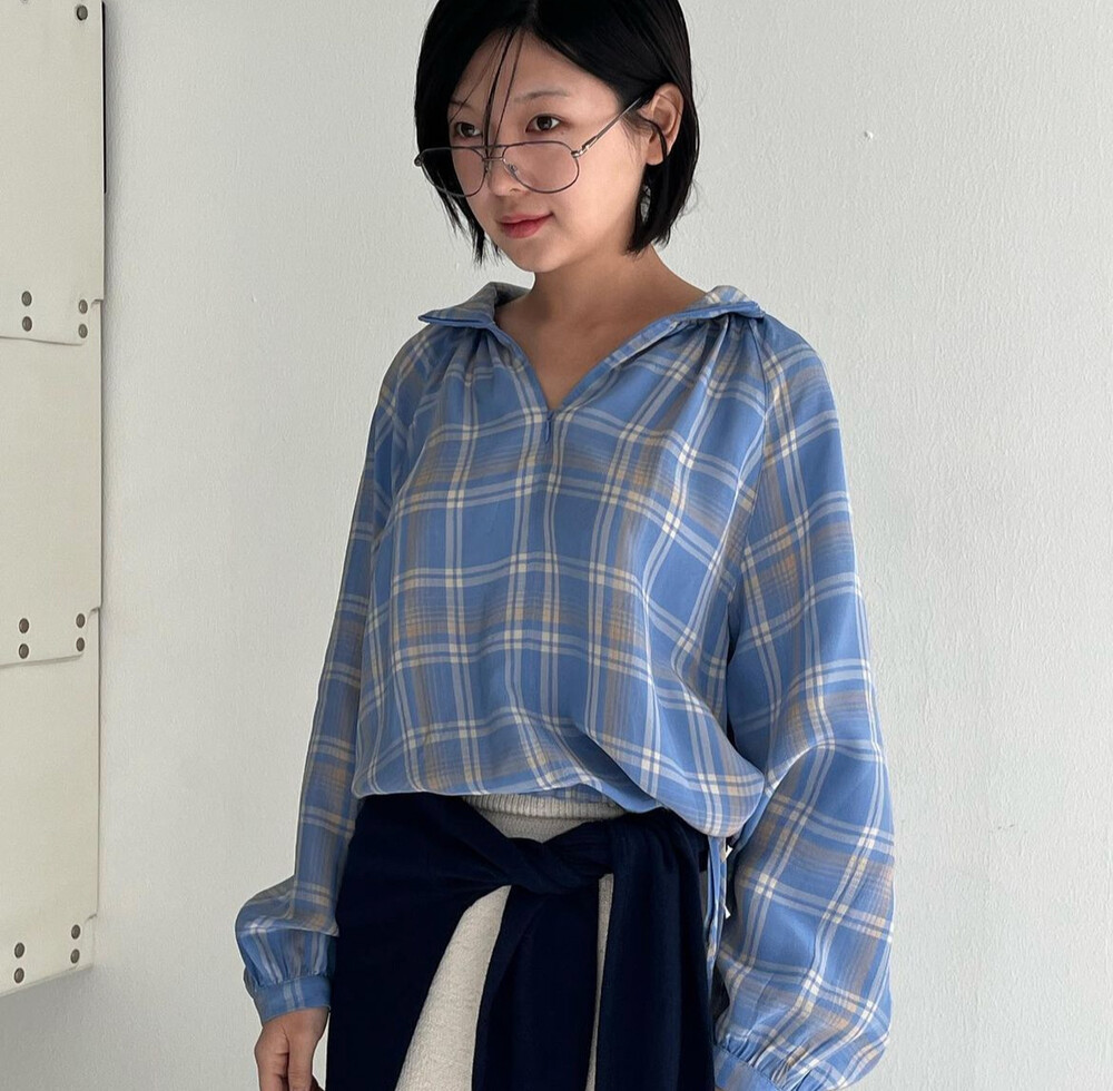 바로 제가 가장 사랑하는 체크+파우더블루컬러+블라우스 소재인데