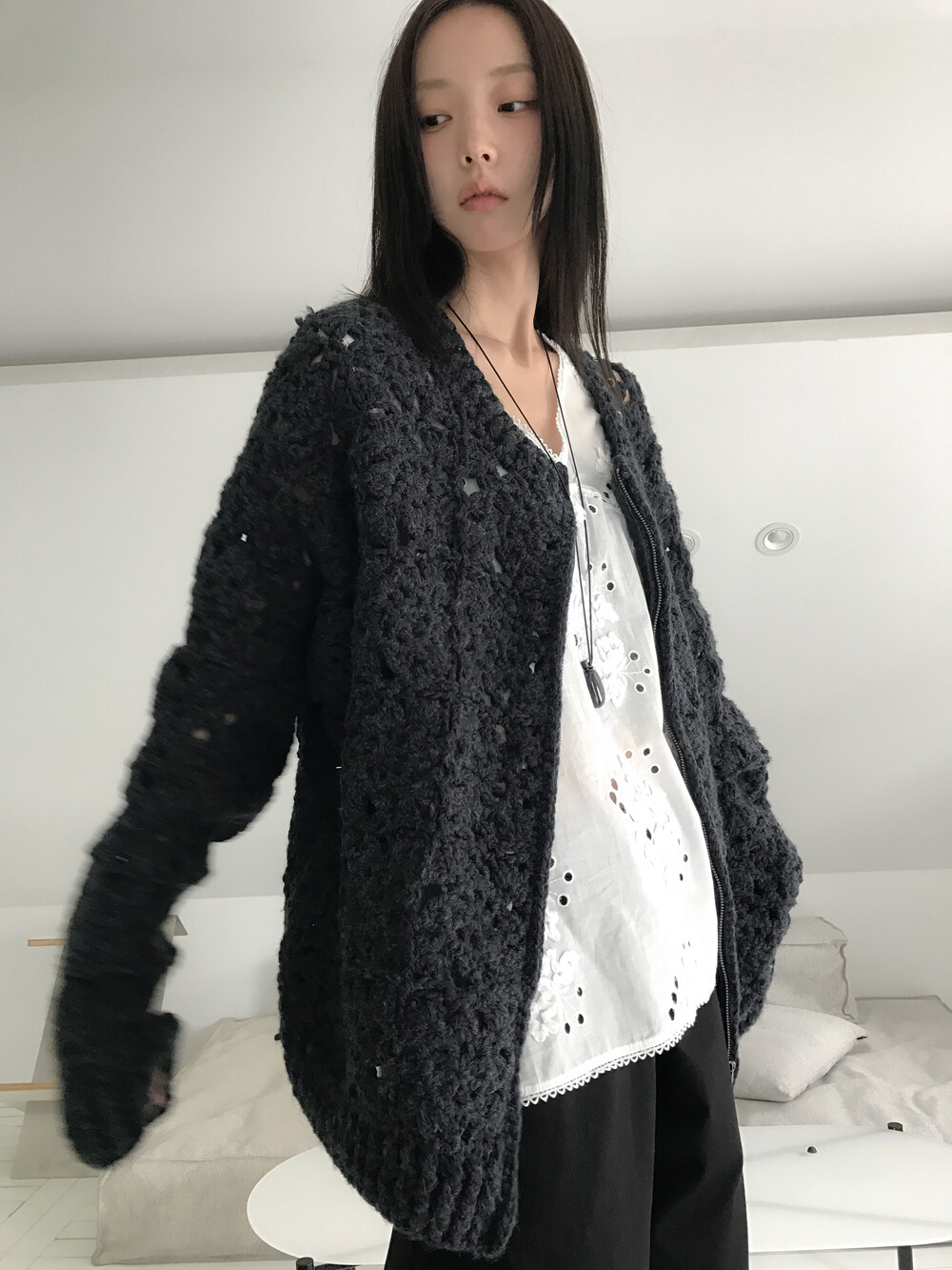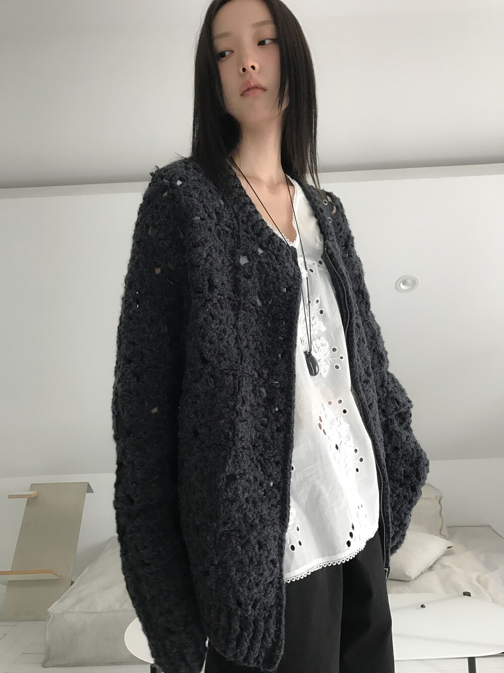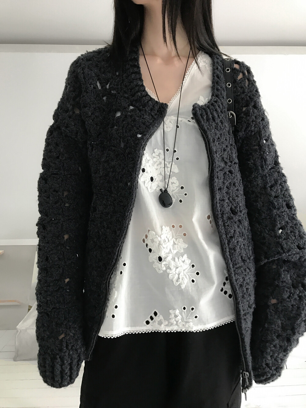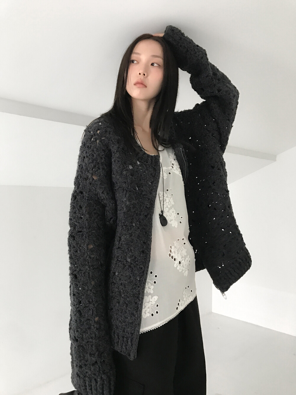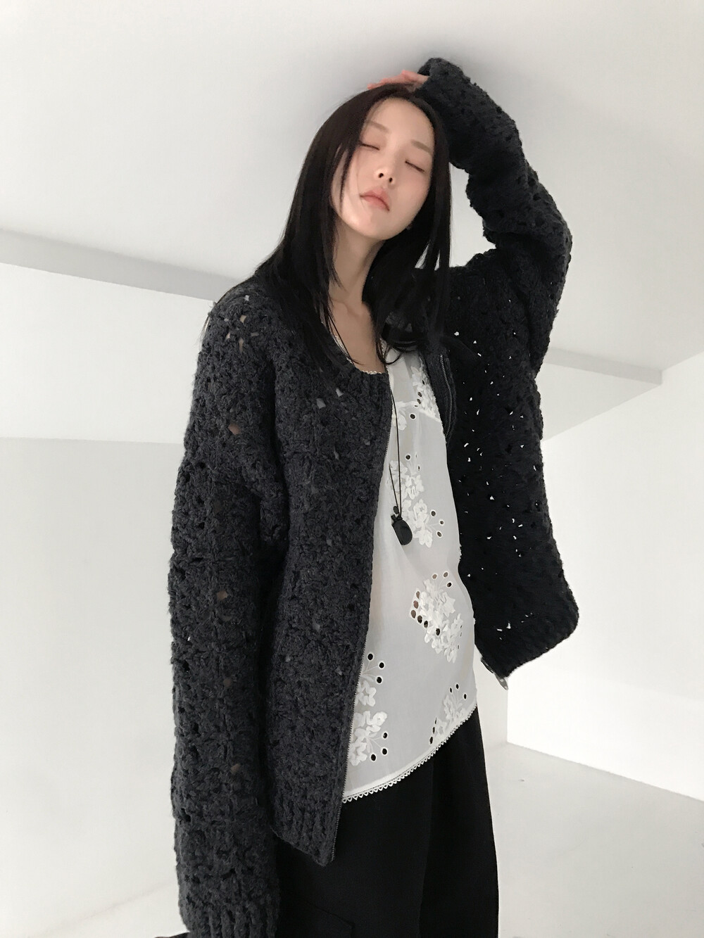 Blooming Crochet Knit Cardigan, Charcoal (2c)