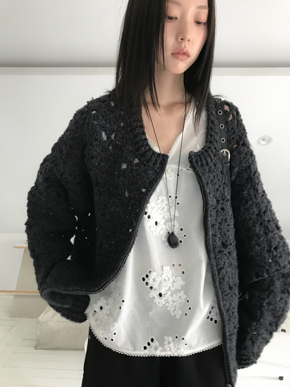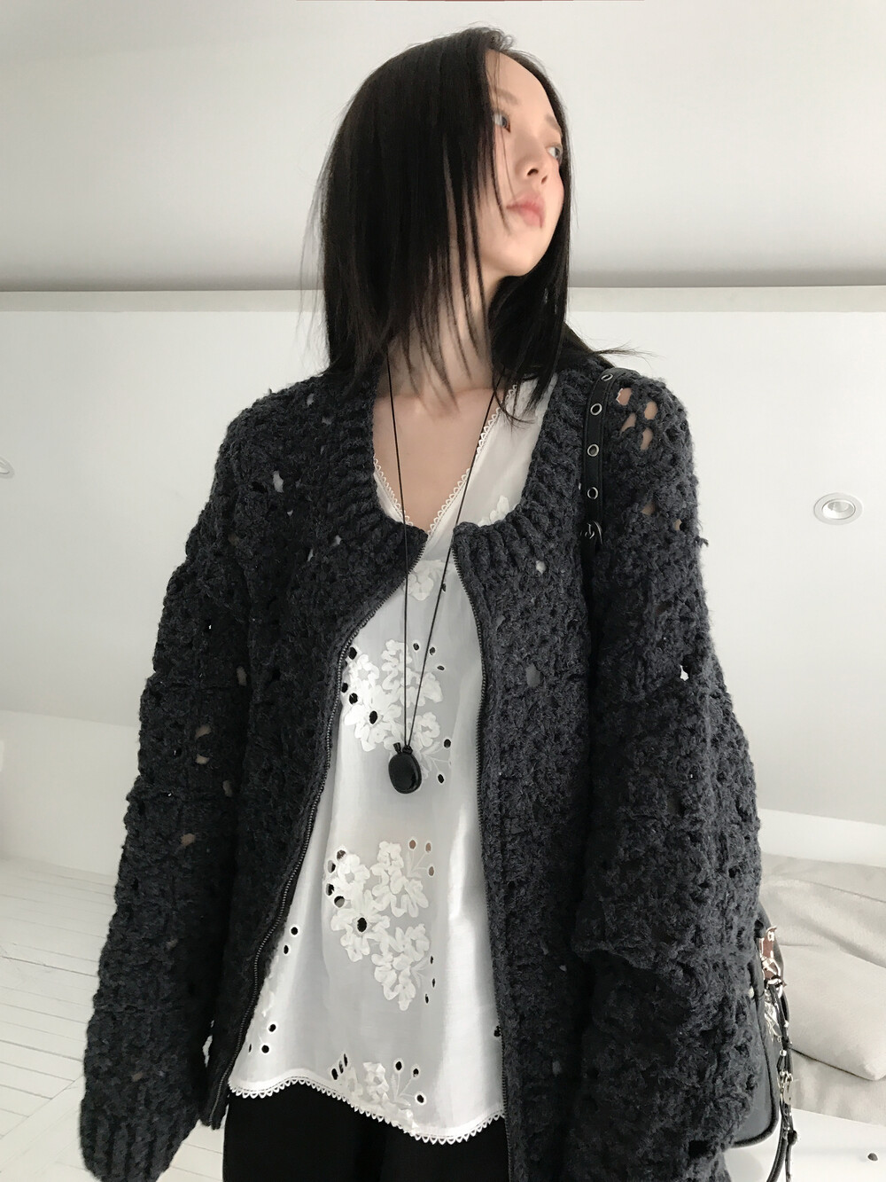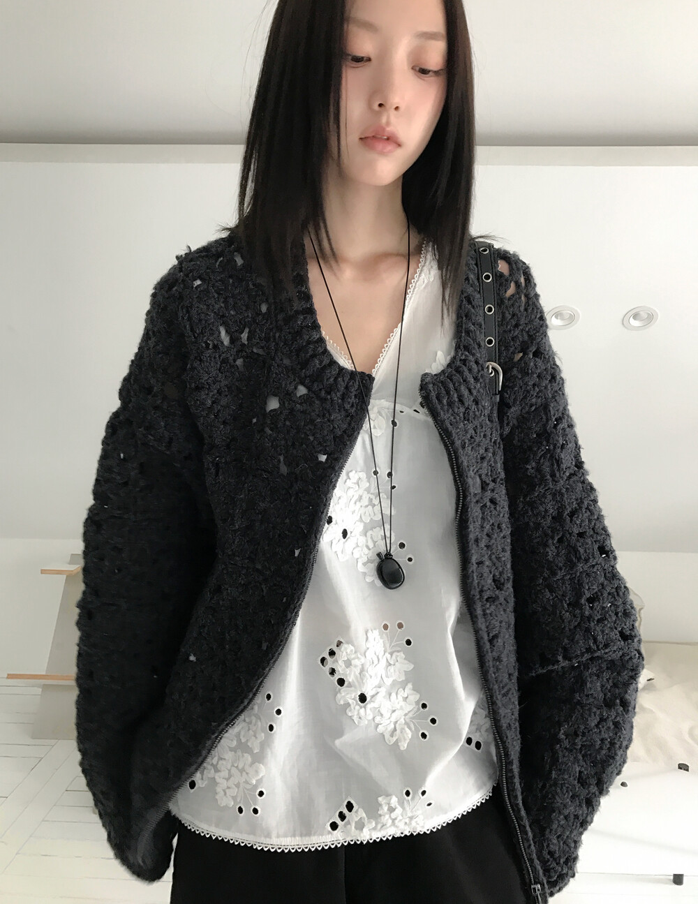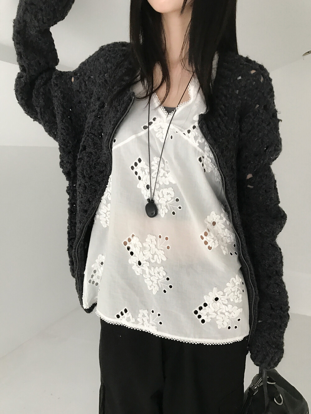 Blooming Crochet Knit Cardigan, Charcoal (2c)