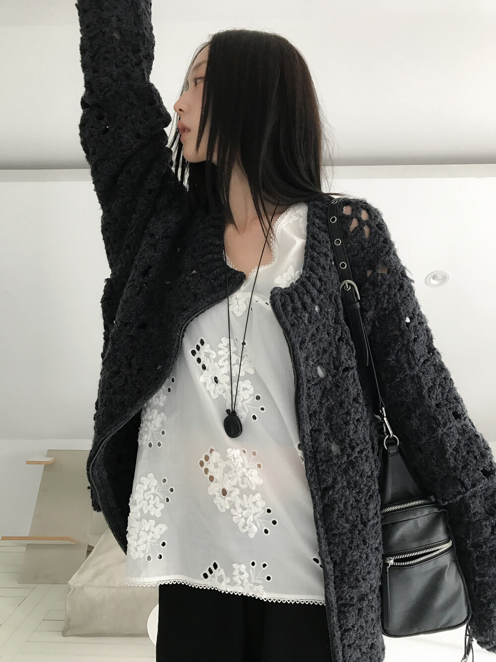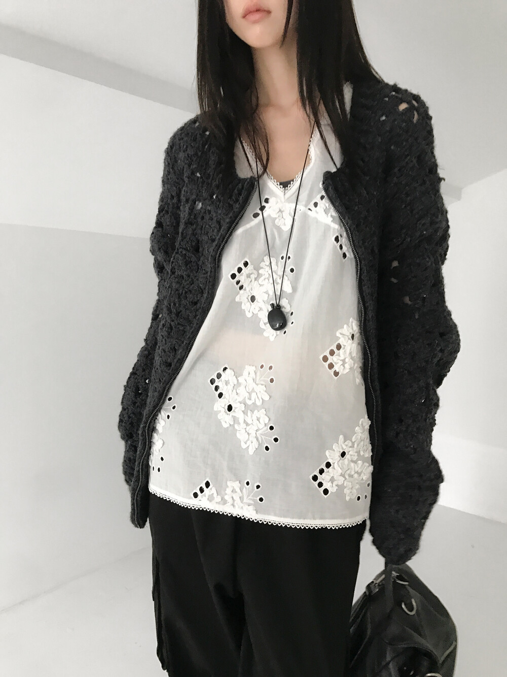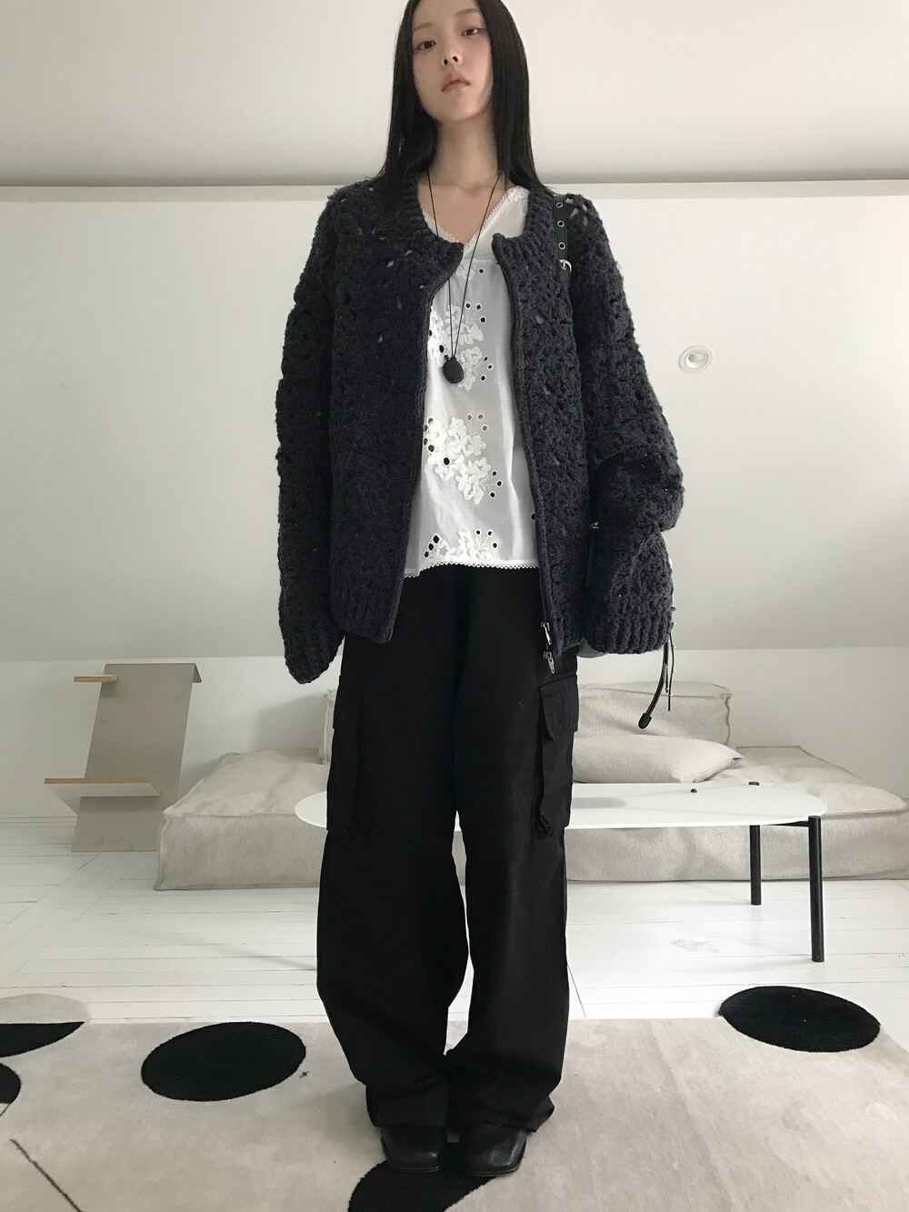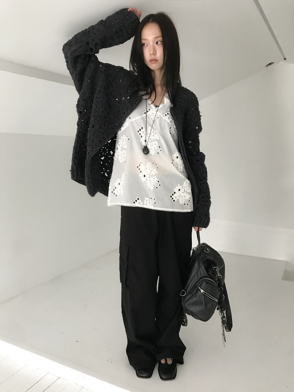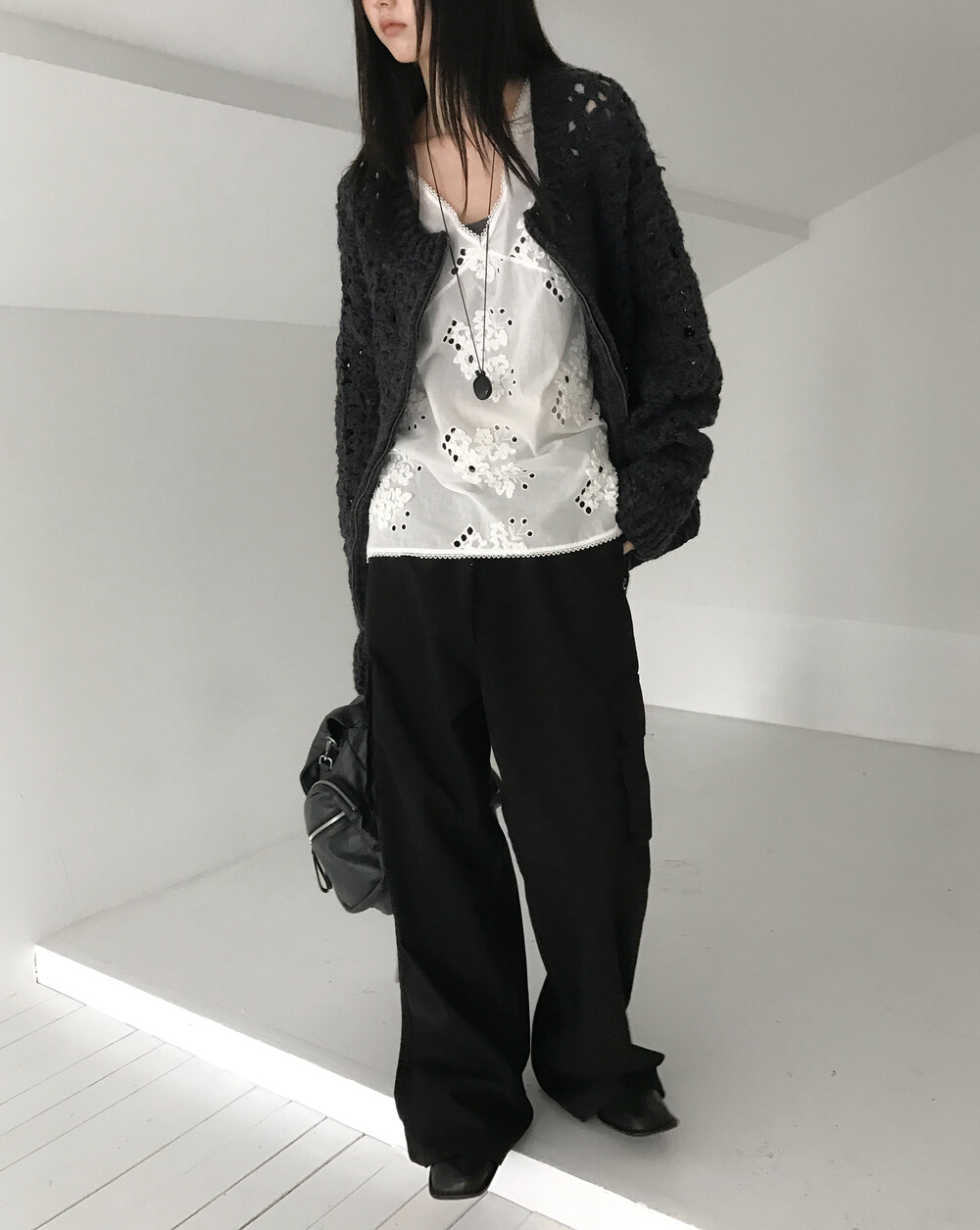 Blooming Crochet Knit Cardigan, Charcoal (2c)