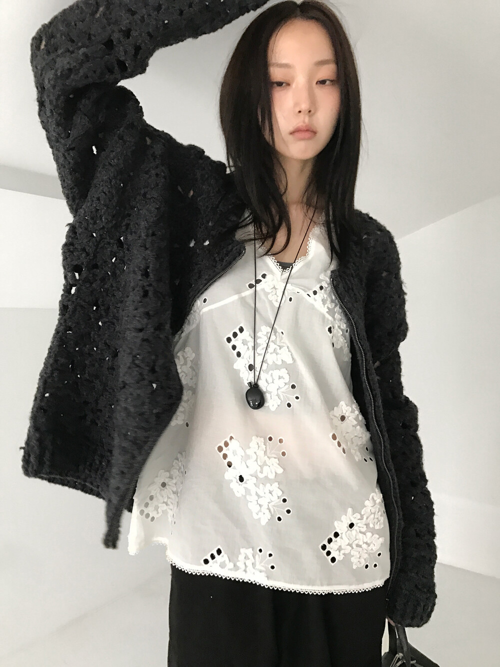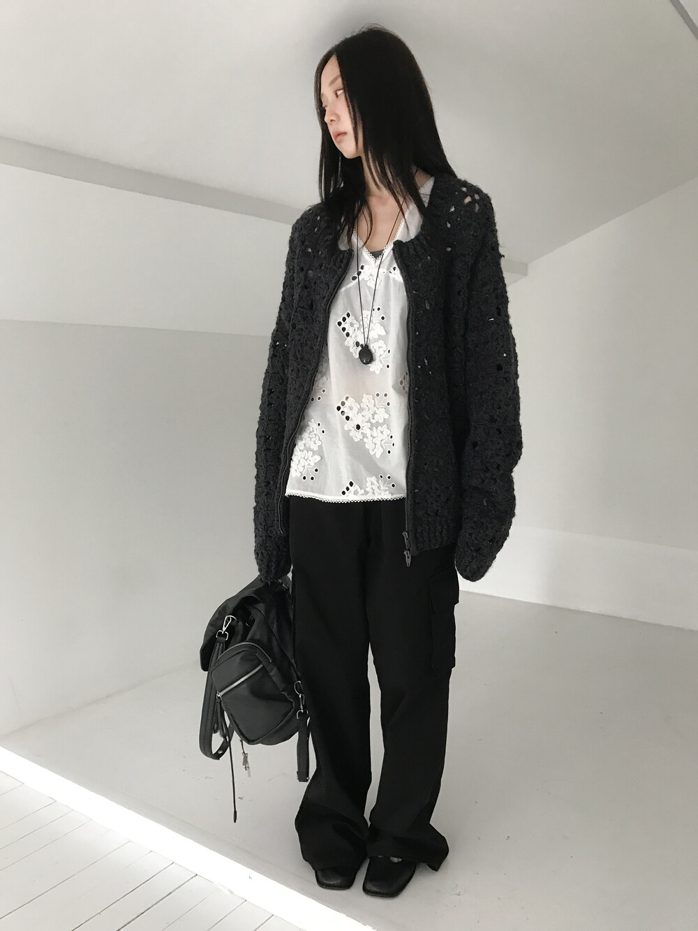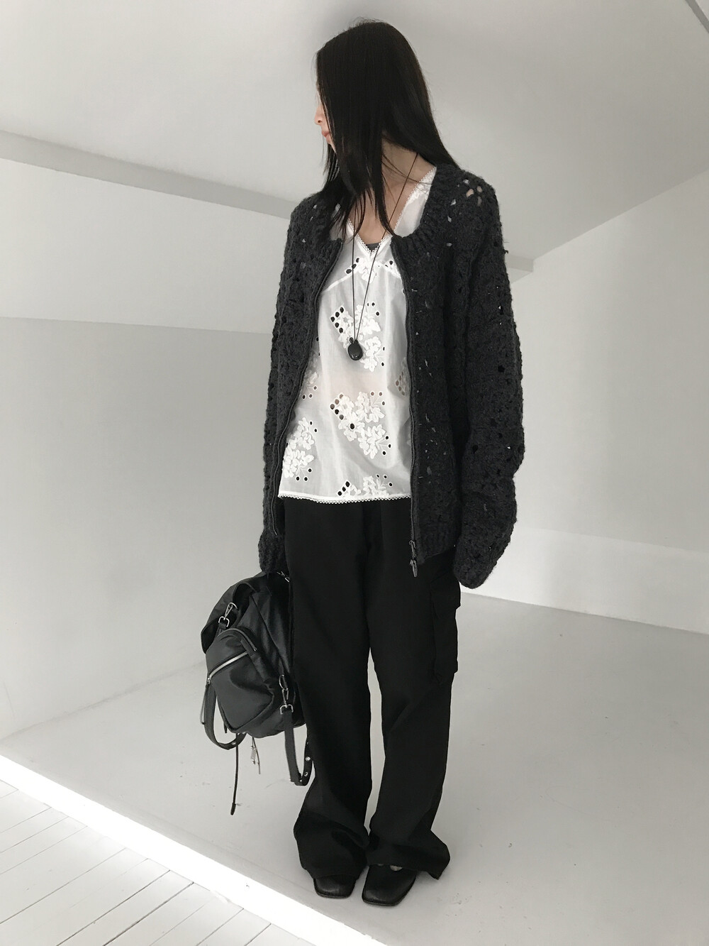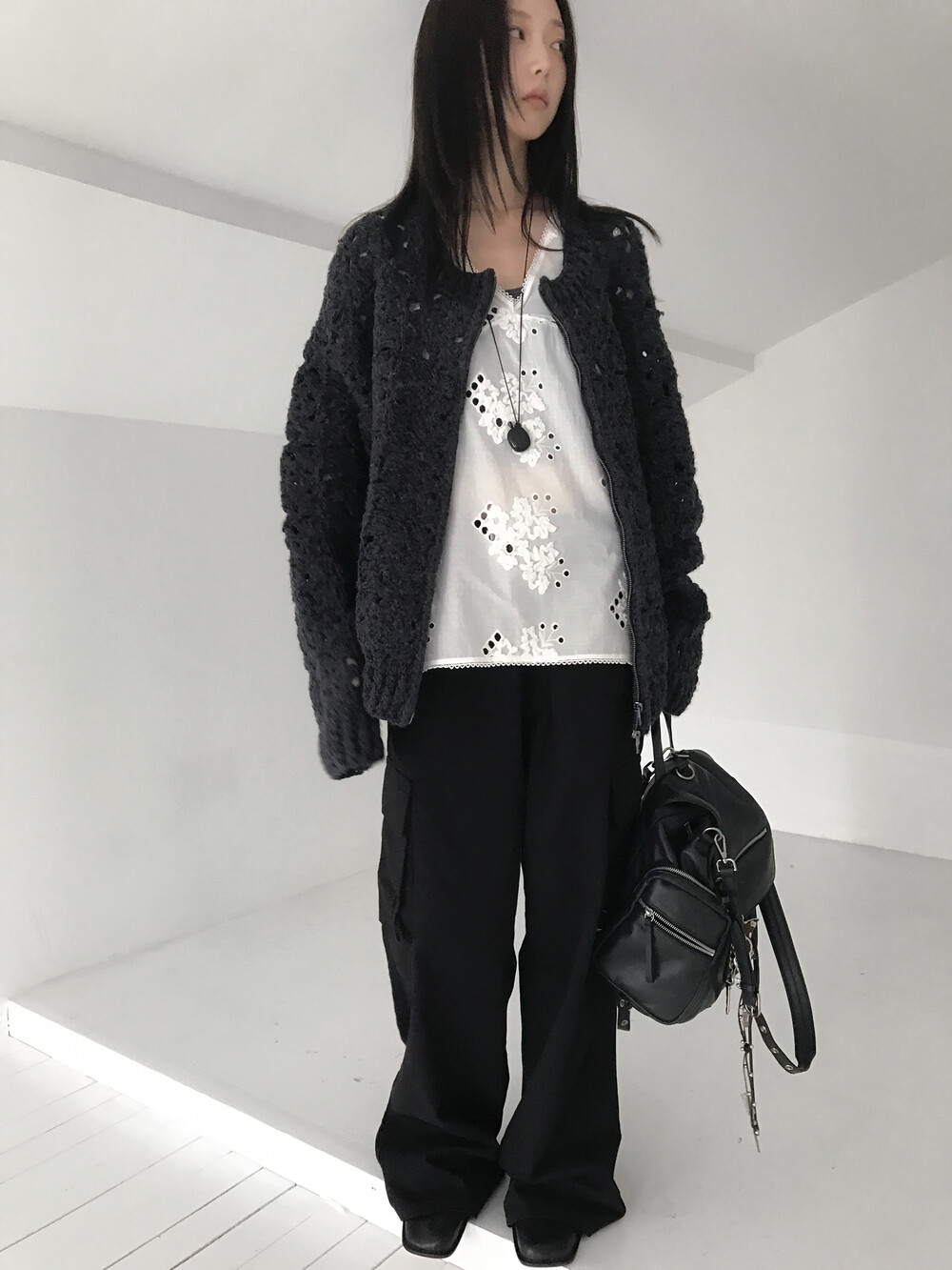 Blooming Crochet Knit Cardigan, Charcoal (2c)