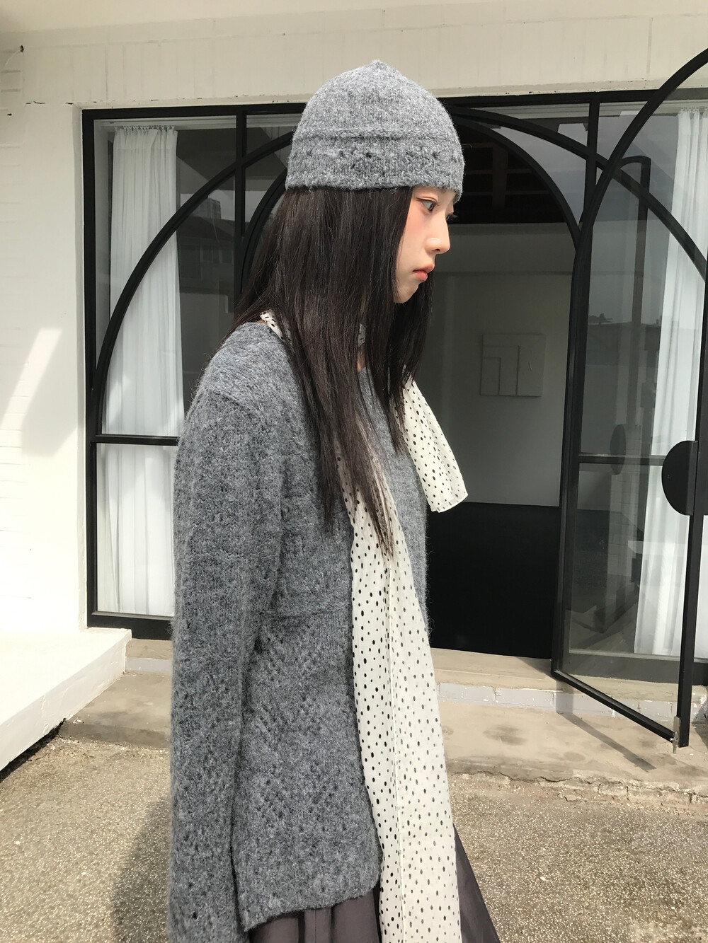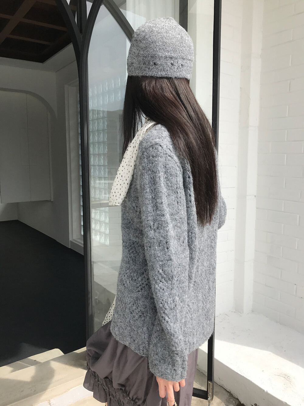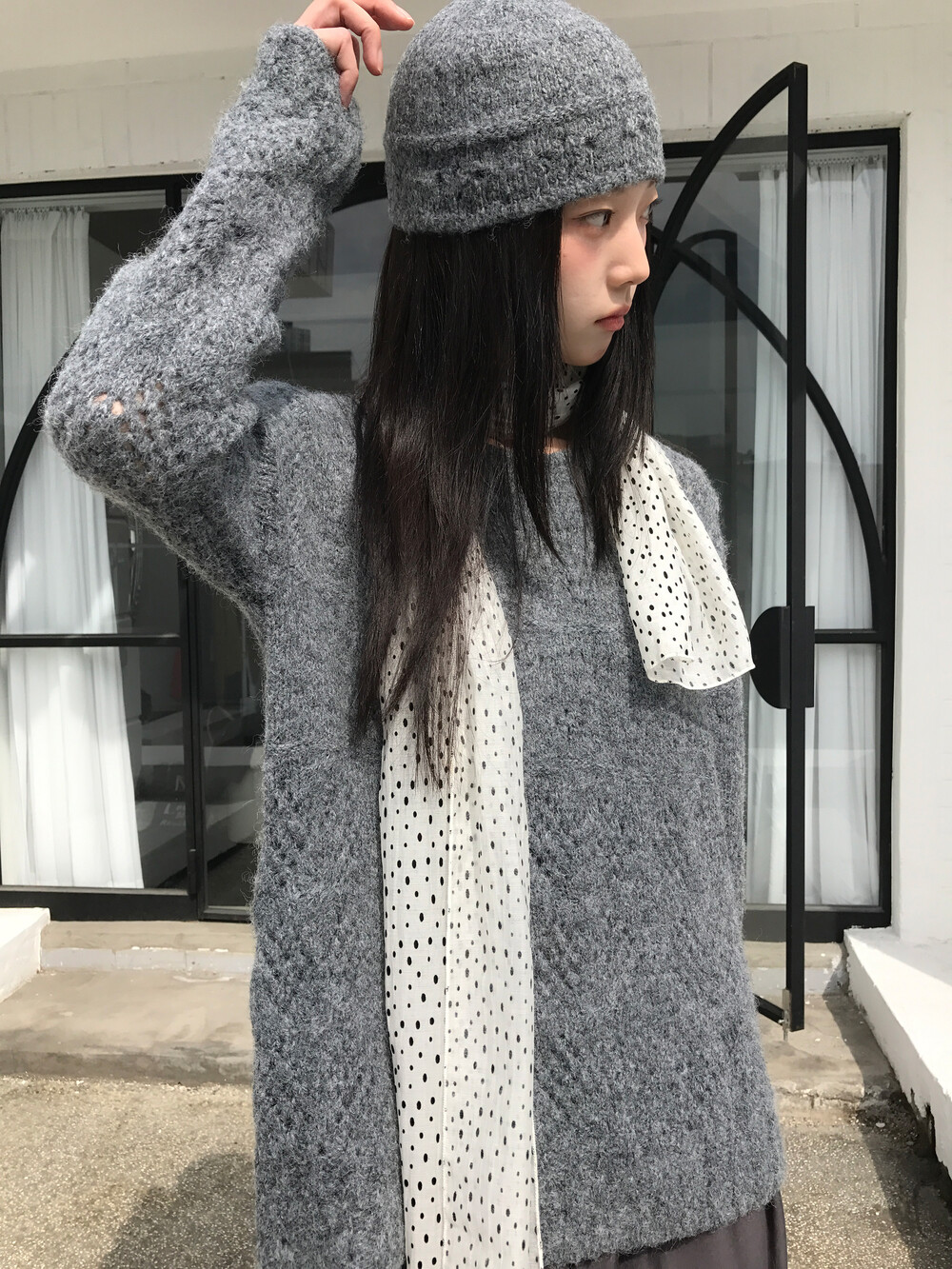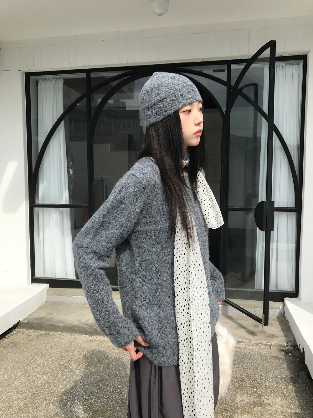 울 혼방의 가볍고 부드러운 펀칭 패턴 니트 + 비니 세트로, 세트 구성이라 스타일링이 훨씬 손쉽고, 따뜻하면서도 러블리한 무드의 니트.