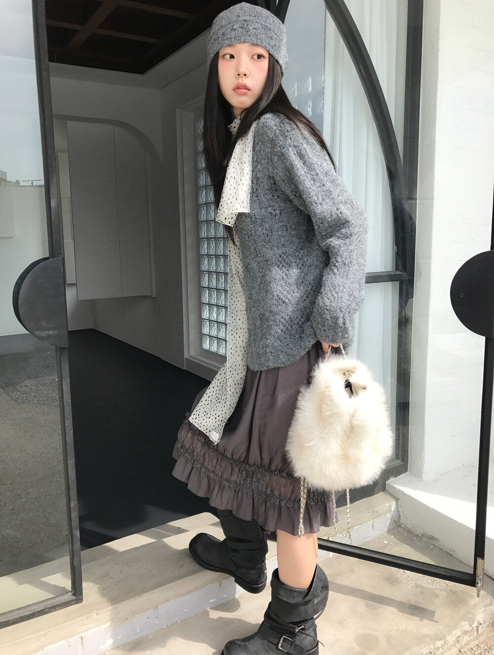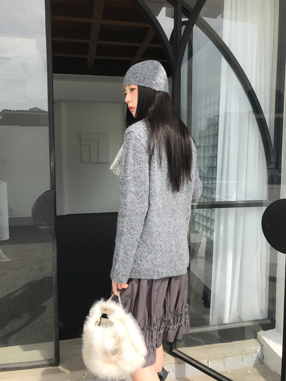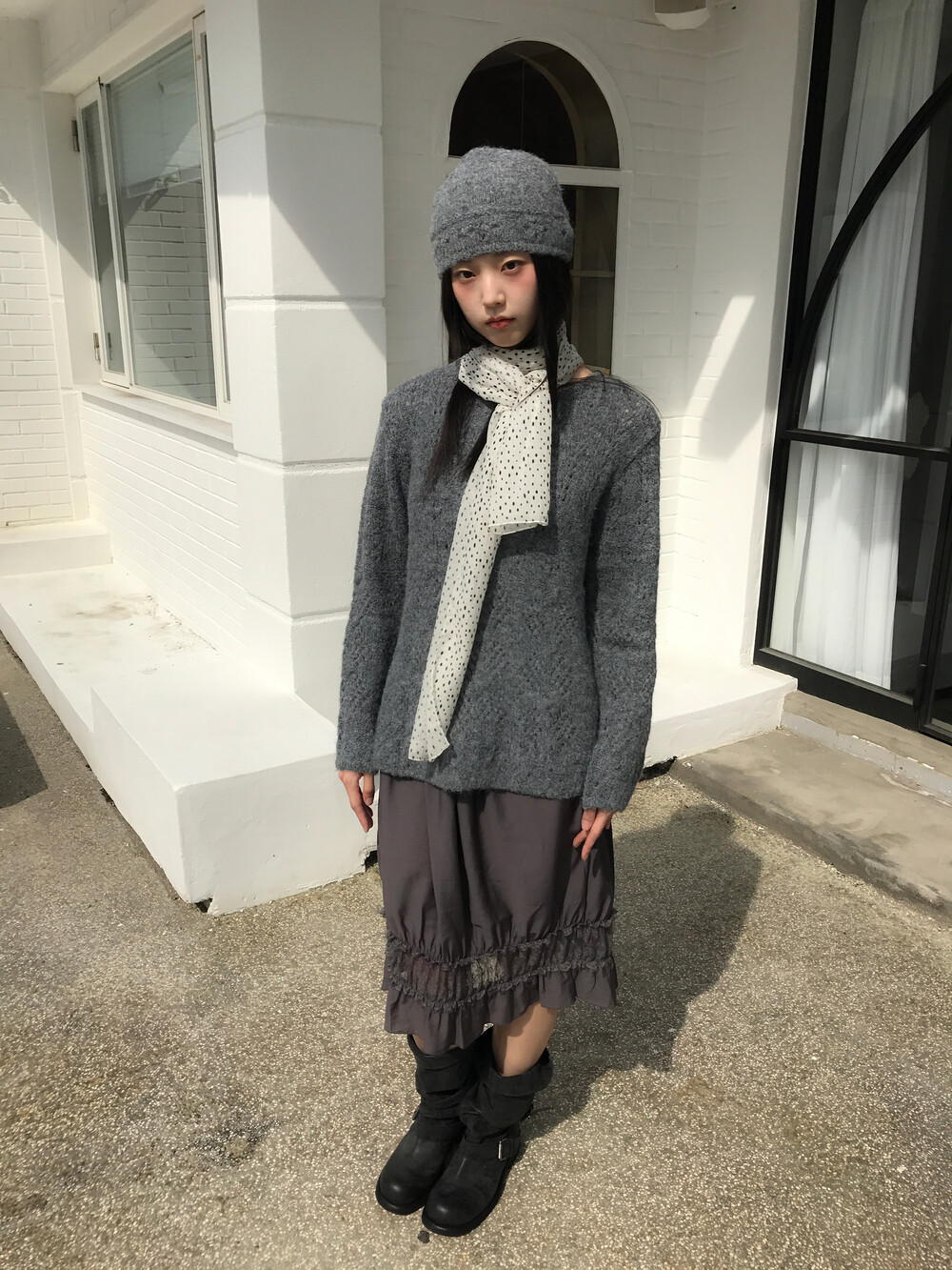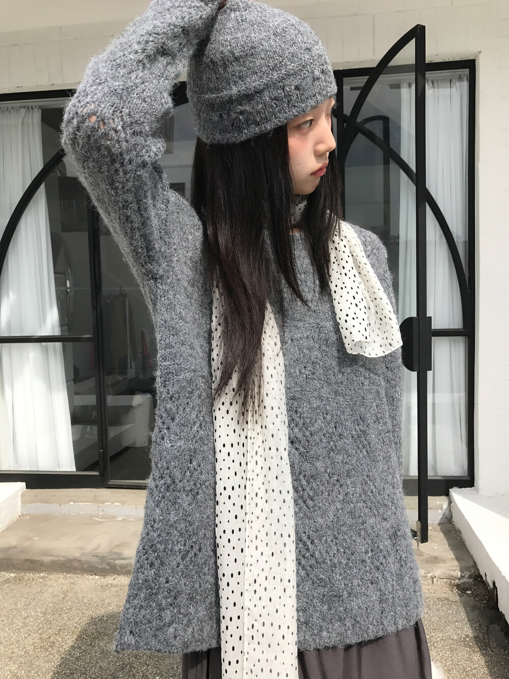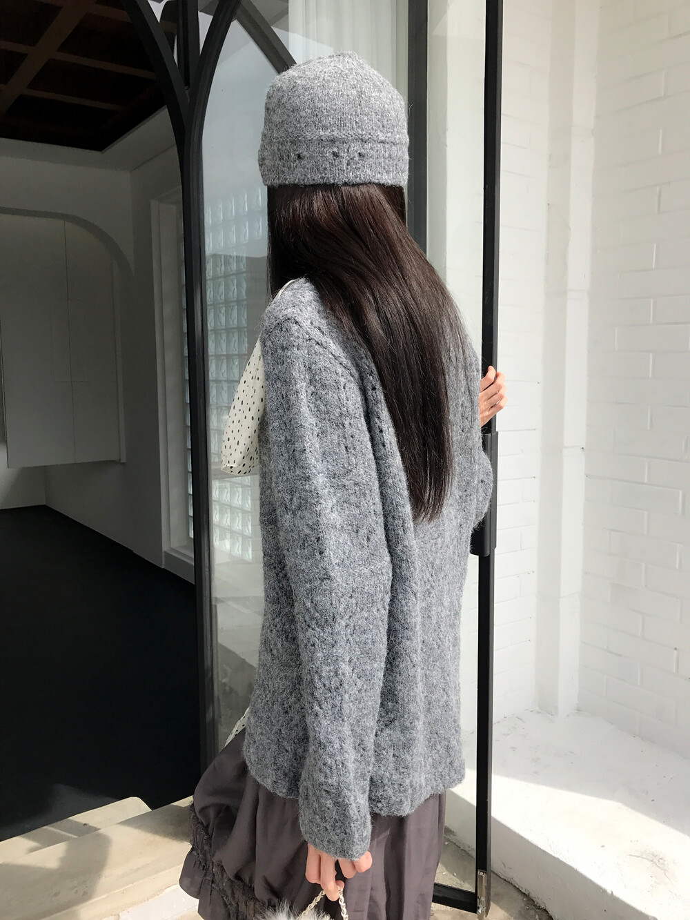울 혼방의 가볍고 부드러운 펀칭 패턴 니트 + 비니 세트로, 세트 구성이라 스타일링이 훨씬 손쉽고, 따뜻하면서도 러블리한 무드의 니트.