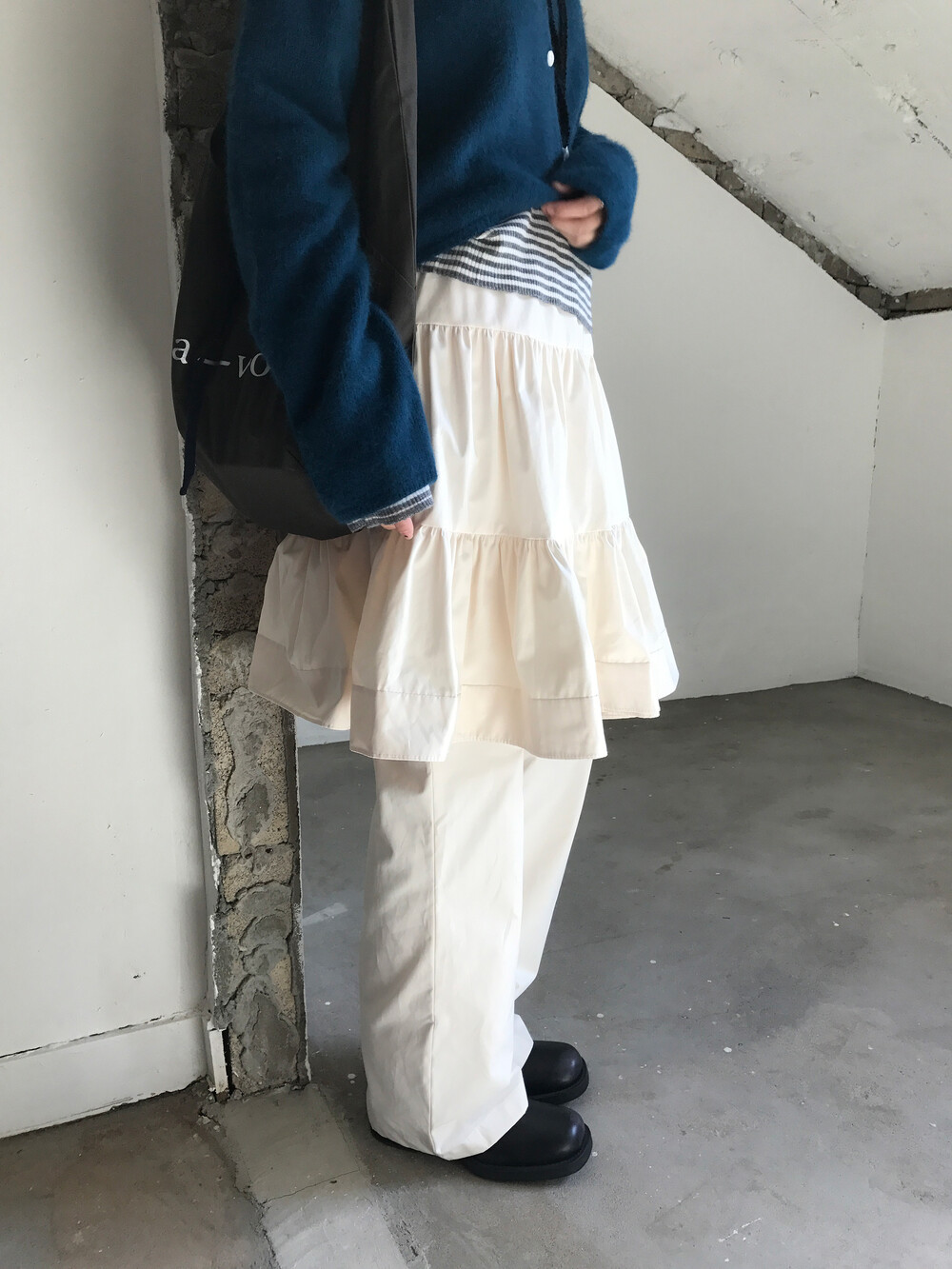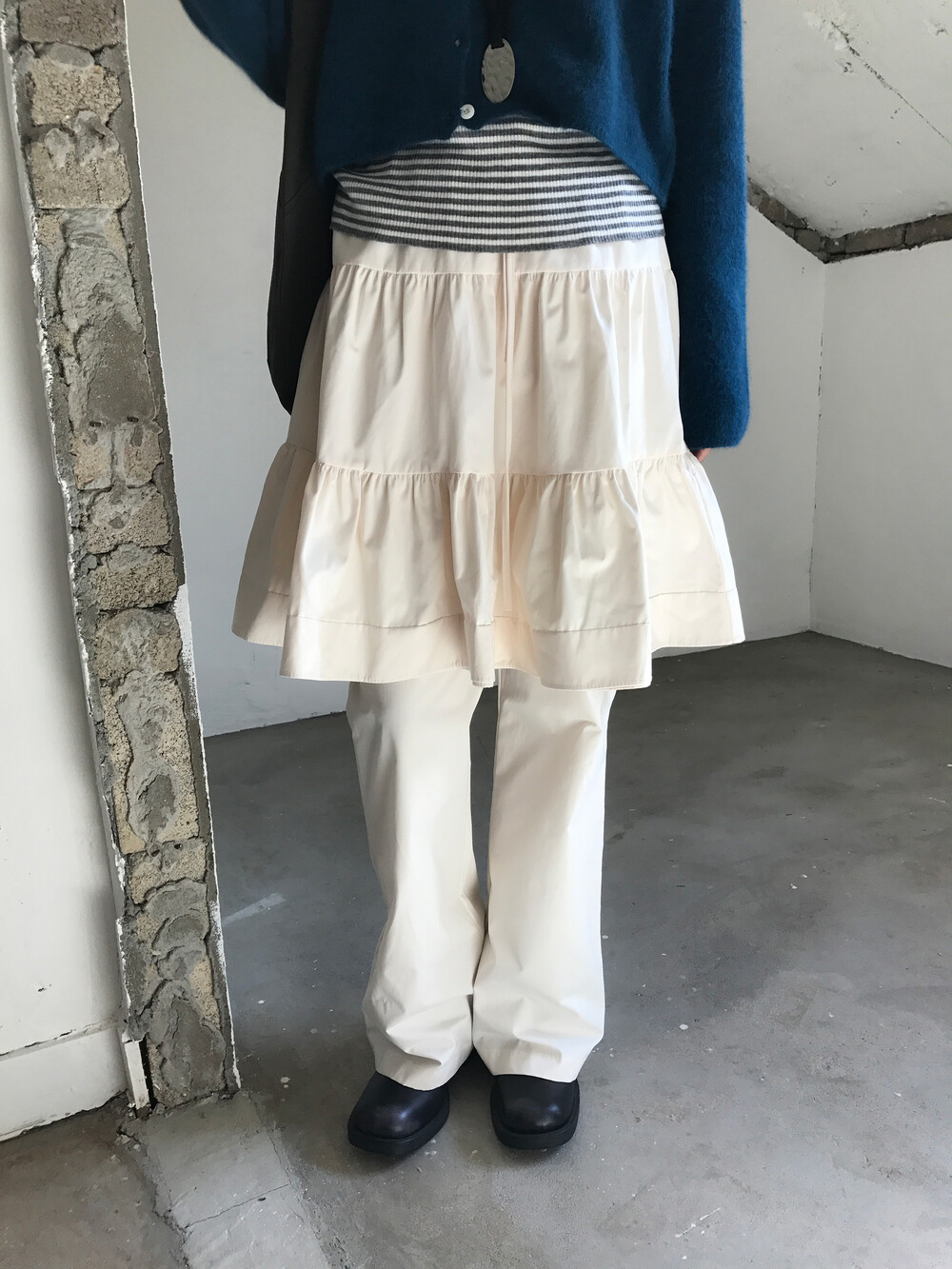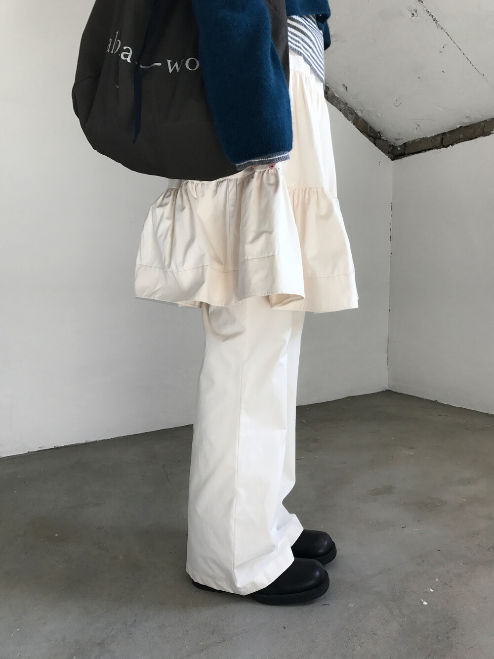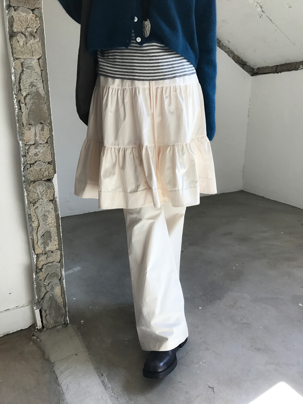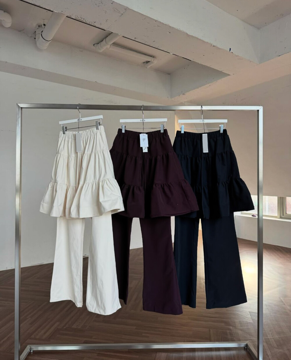 FW 시즌에 맞는 소재감으로 제작되었습니다. 캉캉스커트와 부츠컷 디자인 팬츠가 함께 레이어드 된 스커트팬츠입니다. 나일론이 혼방되어 포멀한 무드의 룩으로도 연출이 가능합니다.