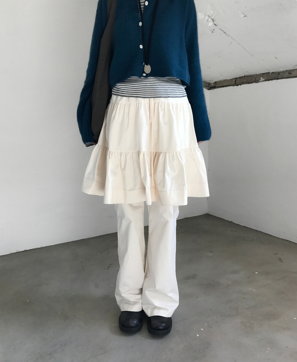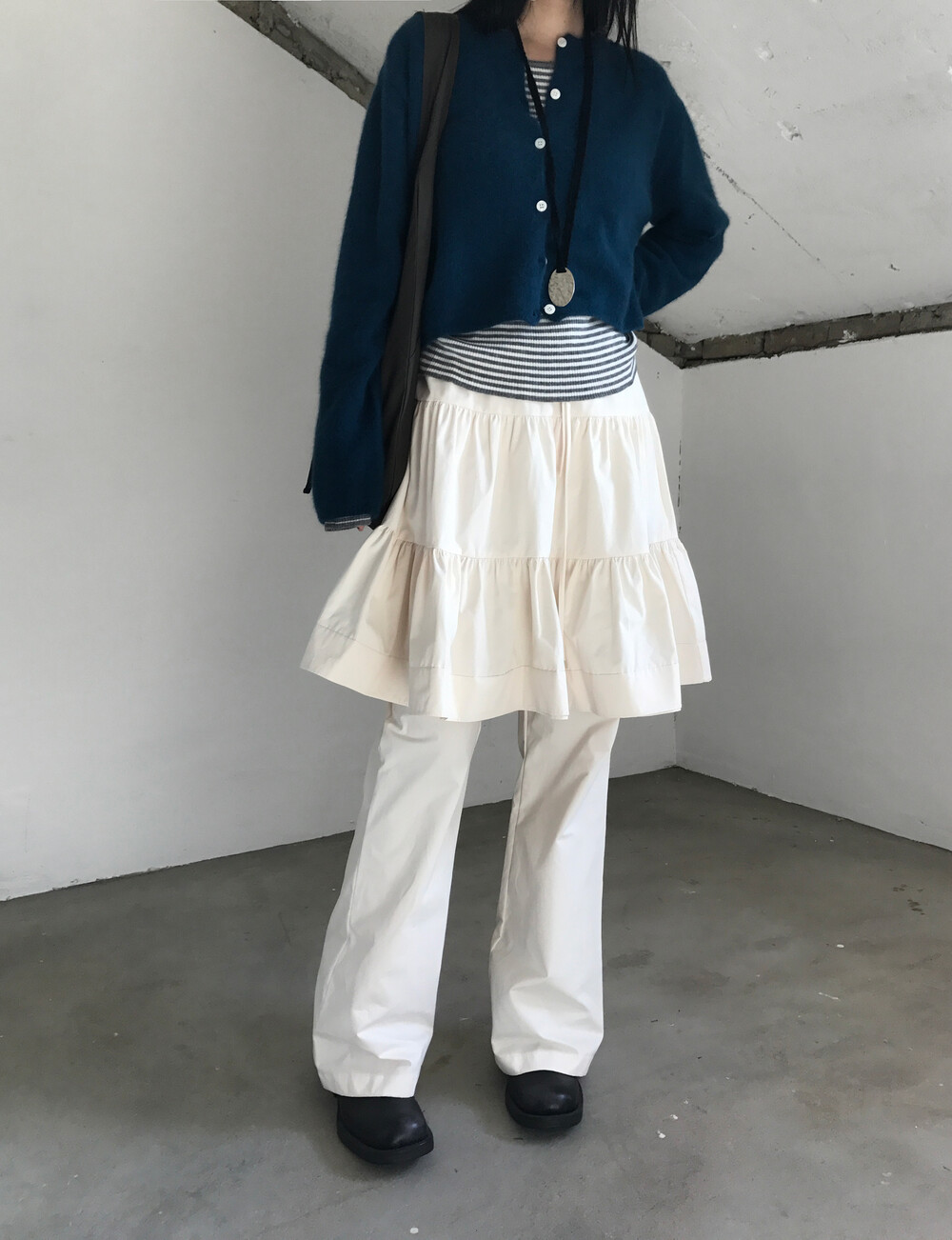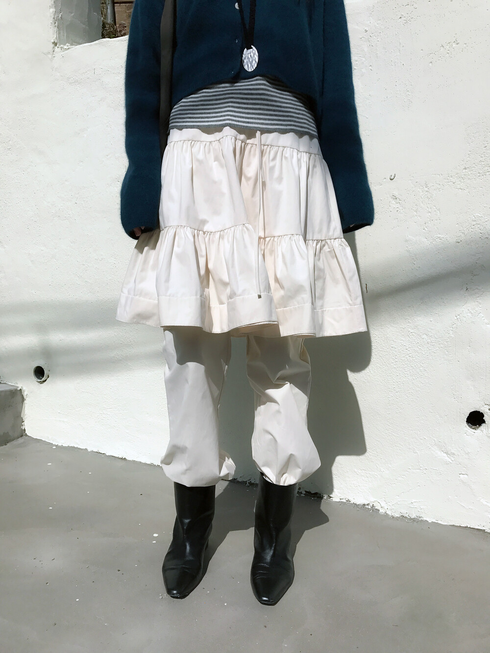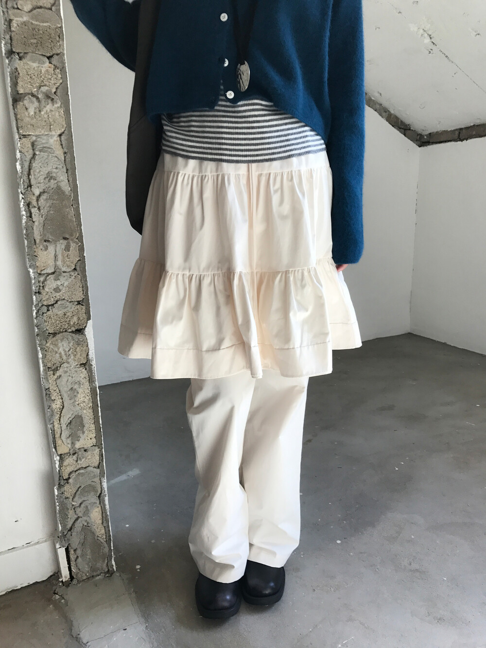 FW 시즌에 맞는 소재감으로 제작되었습니다. 캉캉스커트와 부츠컷 디자인 팬츠가 함께 레이어드 된 스커트팬츠입니다. 나일론이 혼방되어 포멀한 무드의 룩으로도 연출이 가능합니다.