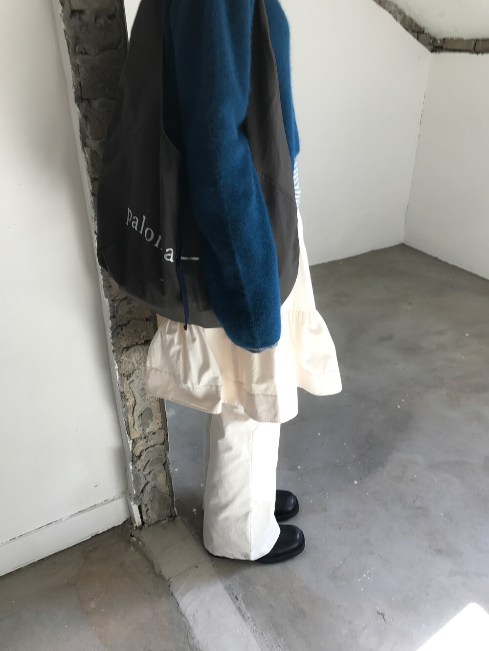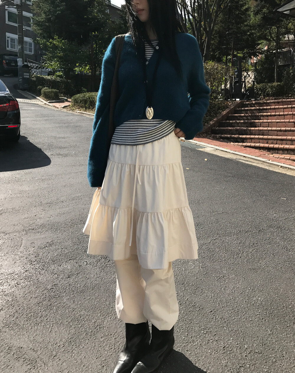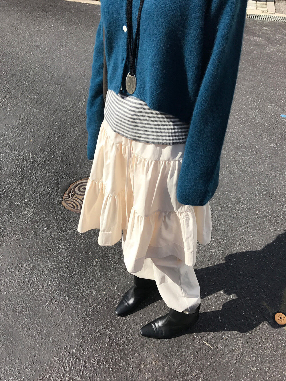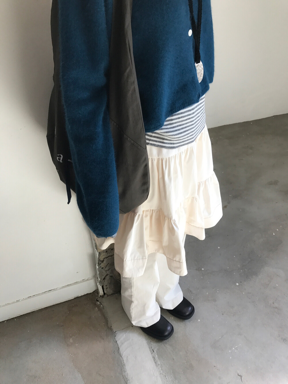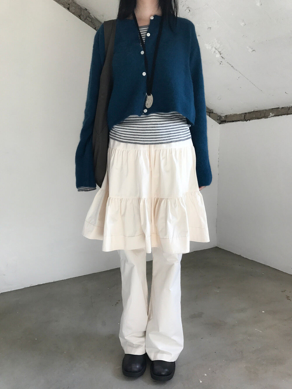 FW 시즌에 맞는 소재감으로 제작되었습니다. 캉캉스커트와 부츠컷 디자인 팬츠가 함께 레이어드 된 스커트팬츠입니다. 나일론이 혼방되어 포멀한 무드의 룩으로도 연출이 가능합니다.