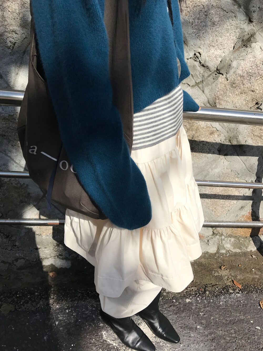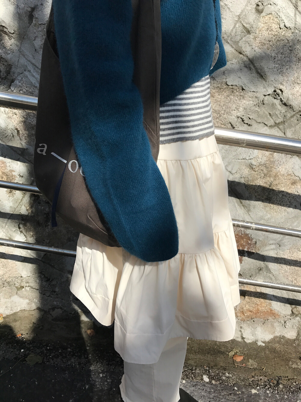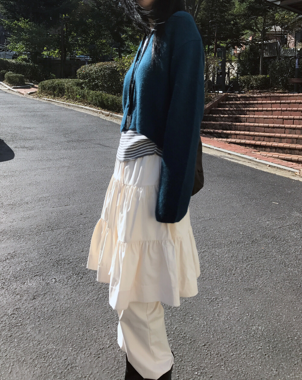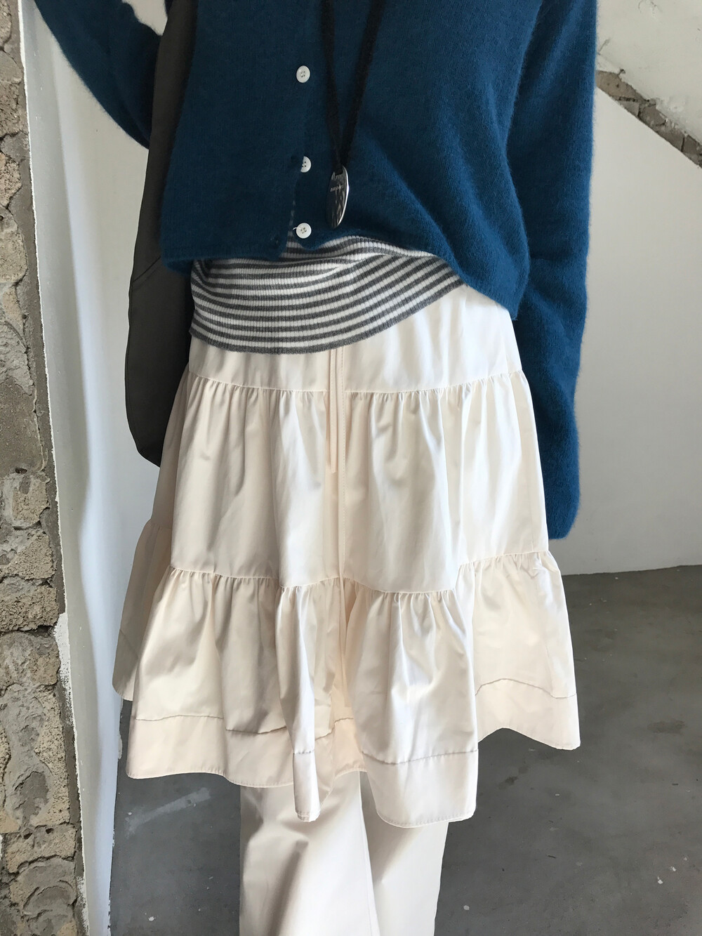 FW 시즌에 맞는 소재감으로 제작되었습니다. 캉캉스커트와 부츠컷 디자인 팬츠가 함께 레이어드 된 스커트팬츠입니다. 나일론이 혼방되어 포멀한 무드의 룩으로도 연출이 가능합니다.