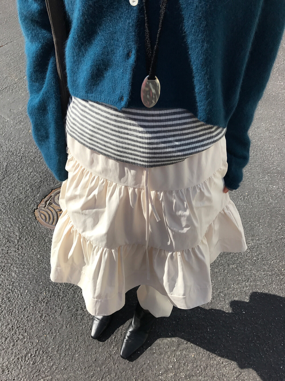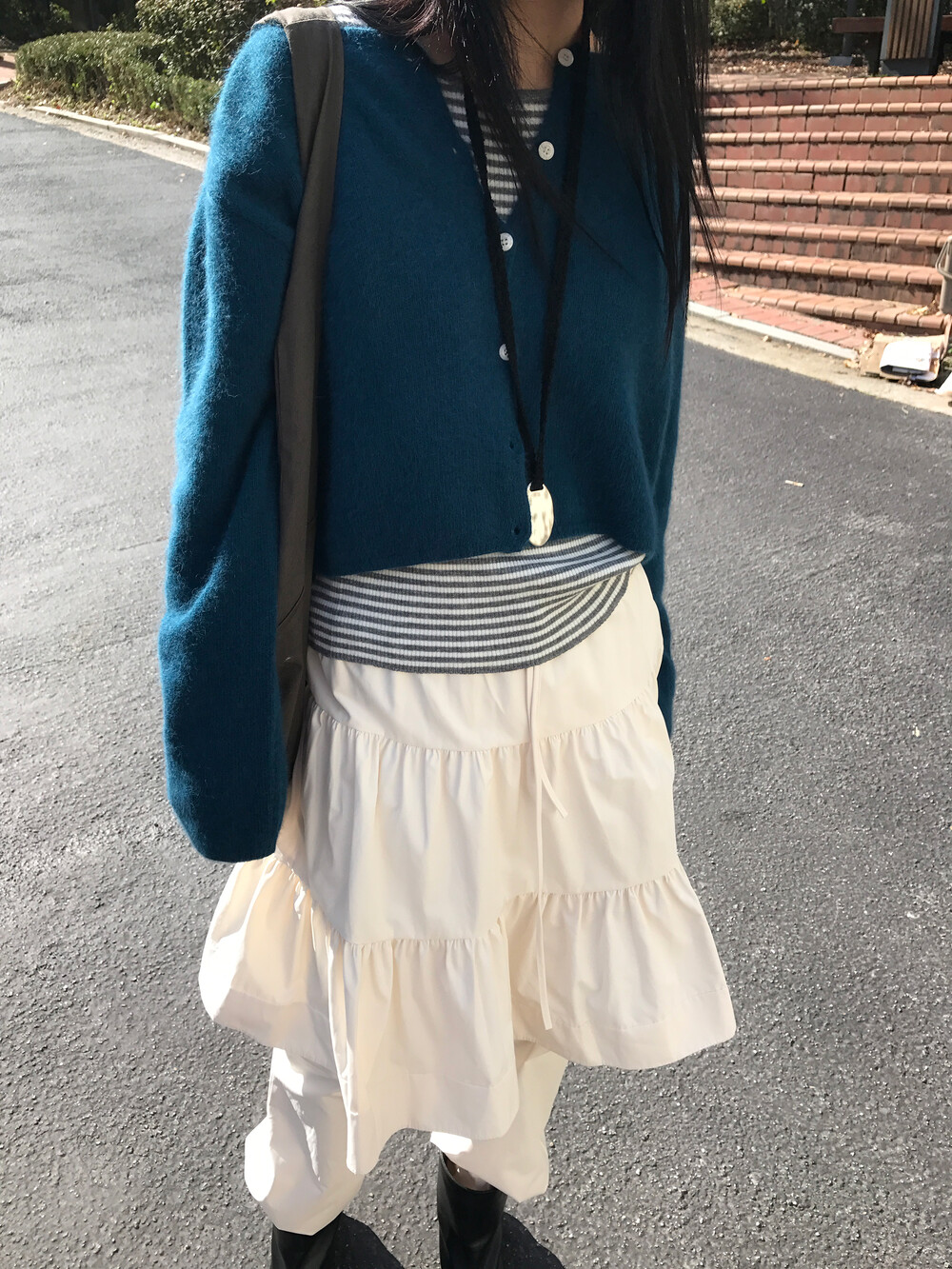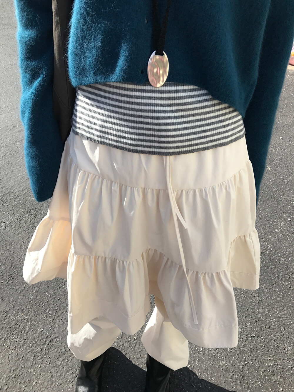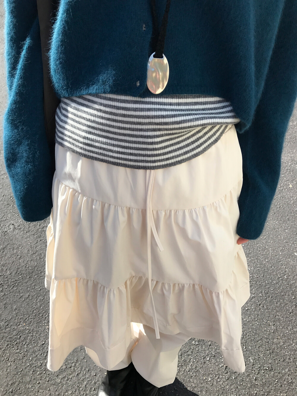 바스락거리는 나일론과 톡톡한 코튼이 만나 독특한 텍스쳐로 제작된 스커트 팬츠입니다.