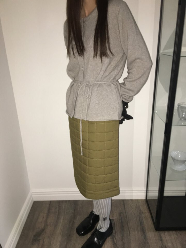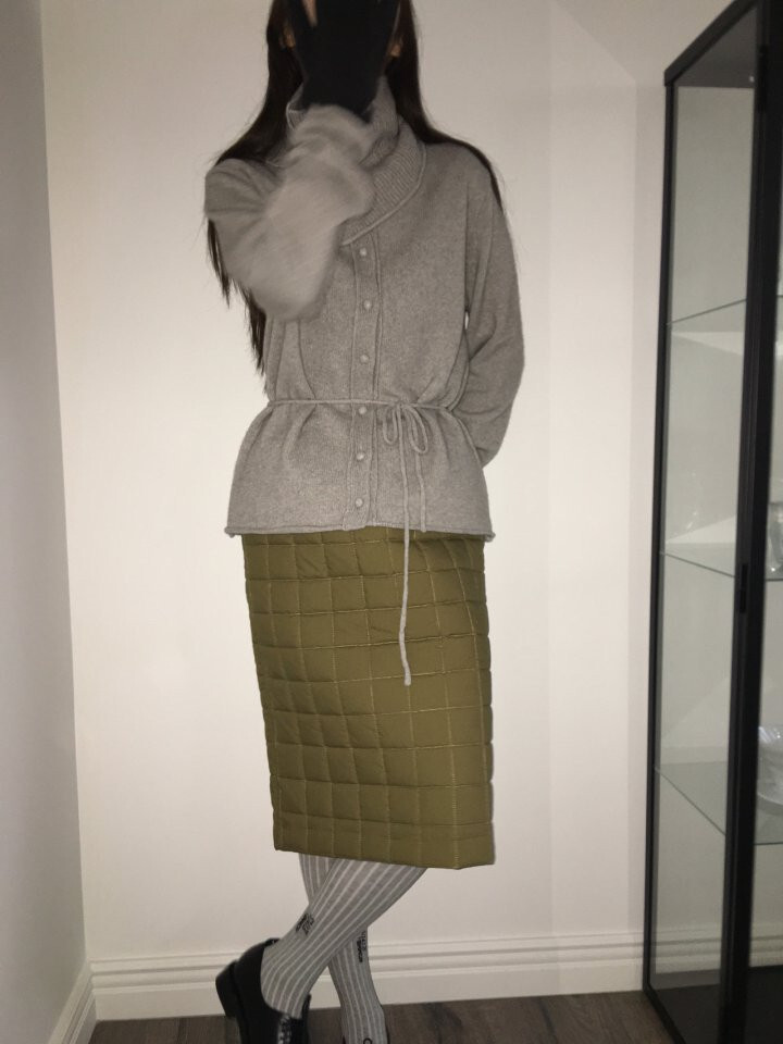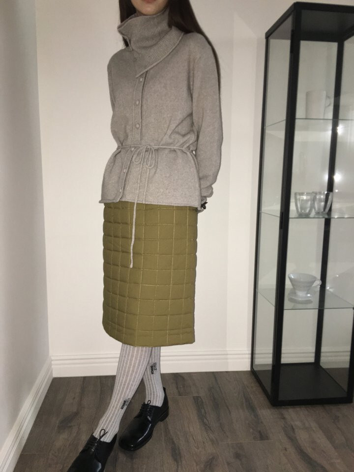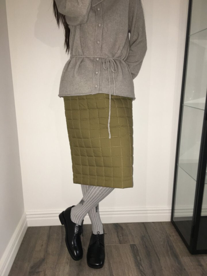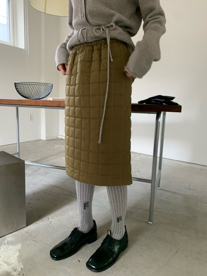 스퀘어 퀼팅을 한 원단을 사용하여 제작된 스커트.