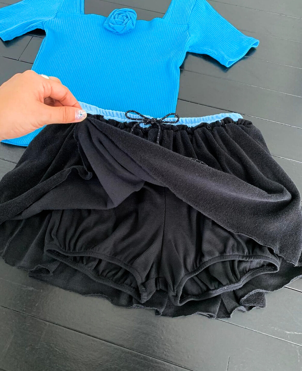 코튼혼방소재의 후들후들한 텍스쳐 허리 레이어드 배색밴딩 디테일 포인트 허리 밴딩 디자인 스커트 안 쪽 속바지 내장 러플 디테일
