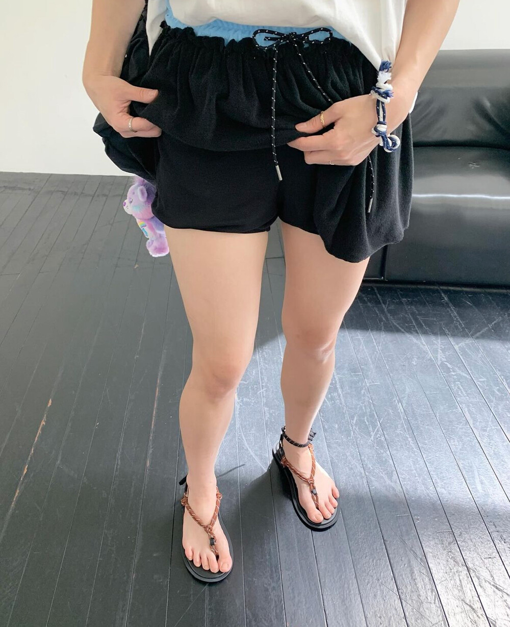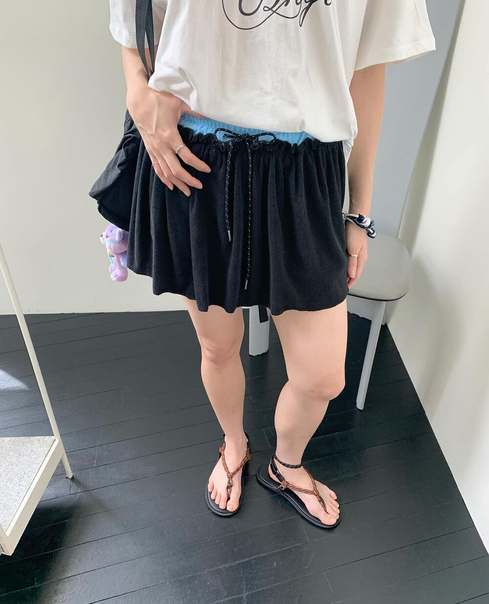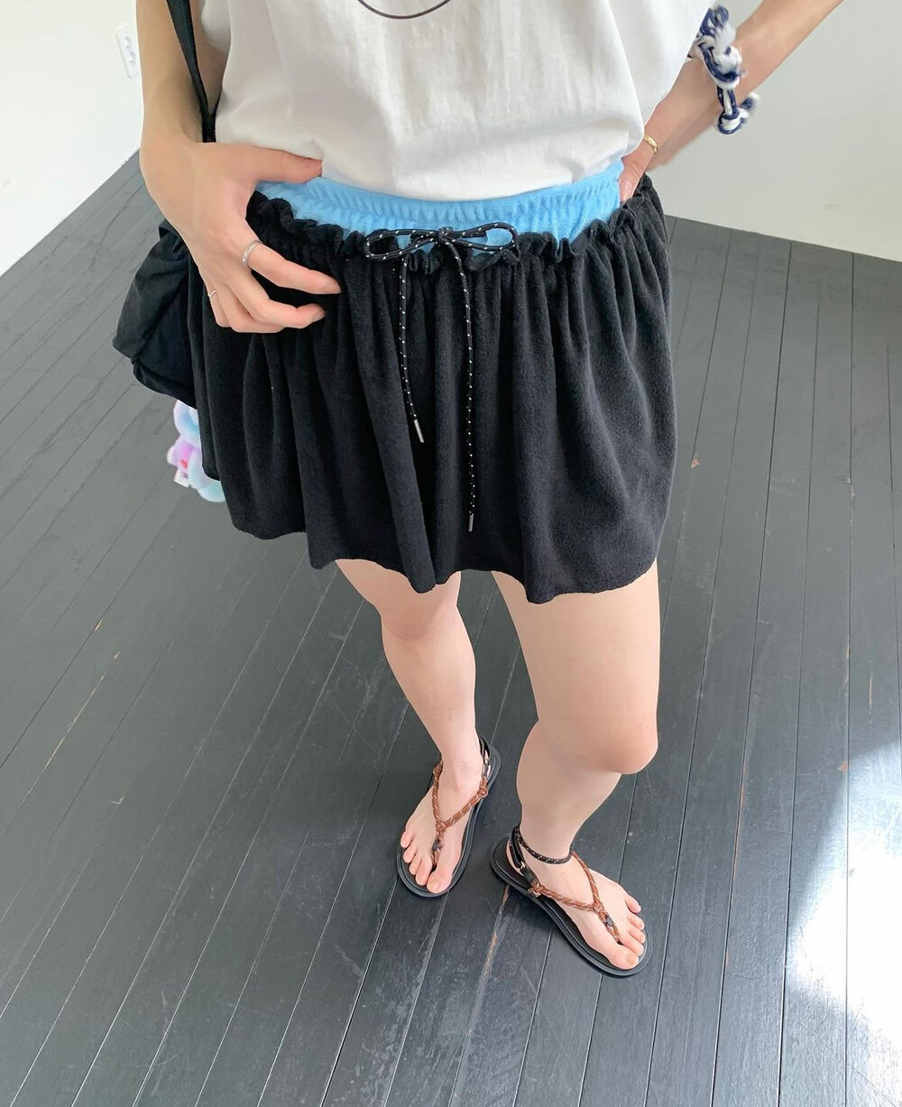 PRODUCT INFO ――――――――――――――――――――――――――――――――― 디테일과 특징이 많은 스커트입니다. 타월소재로 소재의 특징도 있지만, 허리 부분은 두가지 팬츠를 레이어링한 듯한 디테일과 겉으로는 스커트지만 안쪽에 속바지를 덧대어 불편함없이 착용할 수 있도록 제작하였습니다. 속바지 밑단은 밴딩으로 되어있어 말려올라가지 않습니다. 또한 허리부분에 스포티한 스포츠스트랩을 사용하여 포인트를 주었습니다.