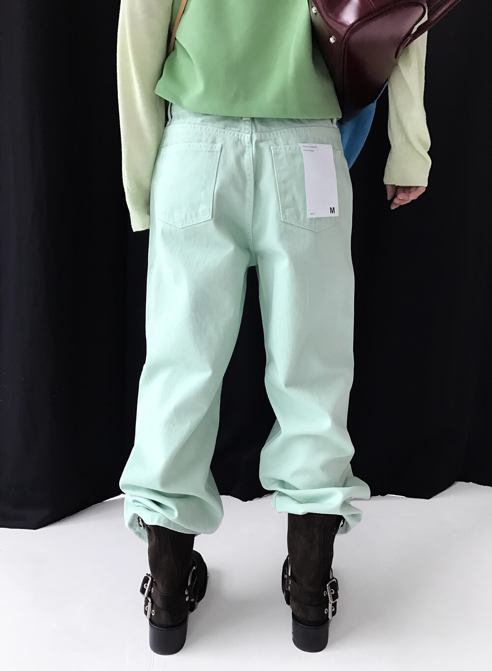 - 세미 루즈핏과 미드 웨이스트 디자인의 컬러 데님 팬츠입니다.