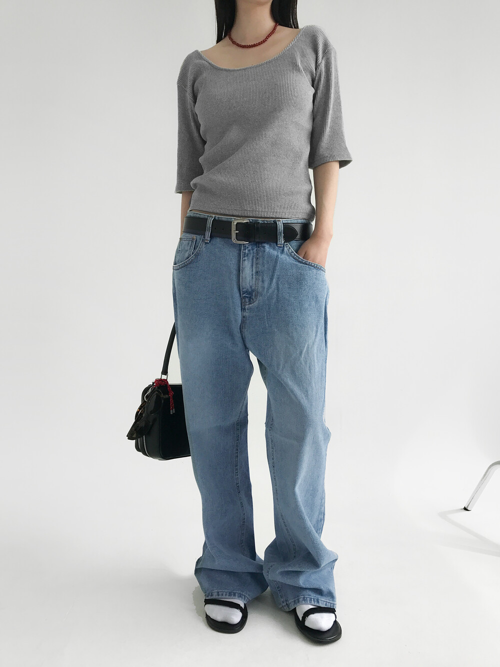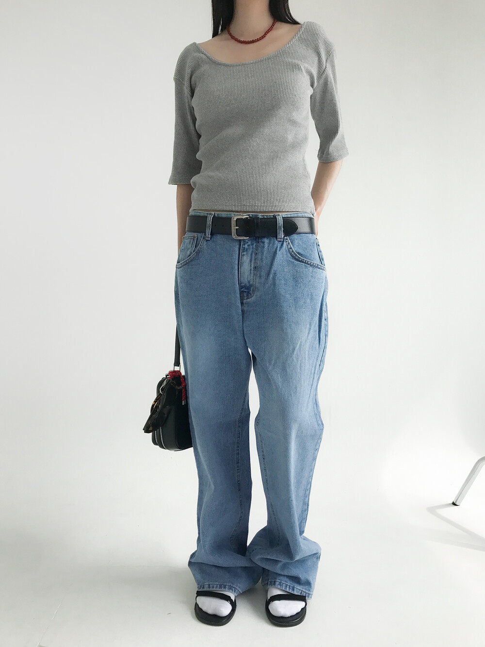- 세미 와이드 핏과 미드 웨이스트 디자인의 데님 팬츠입니다.