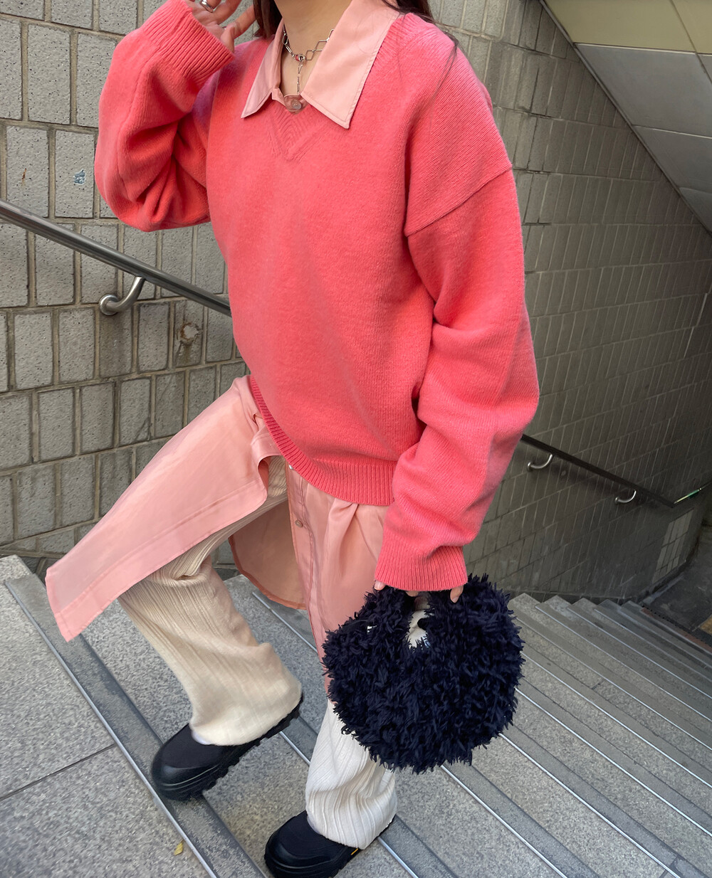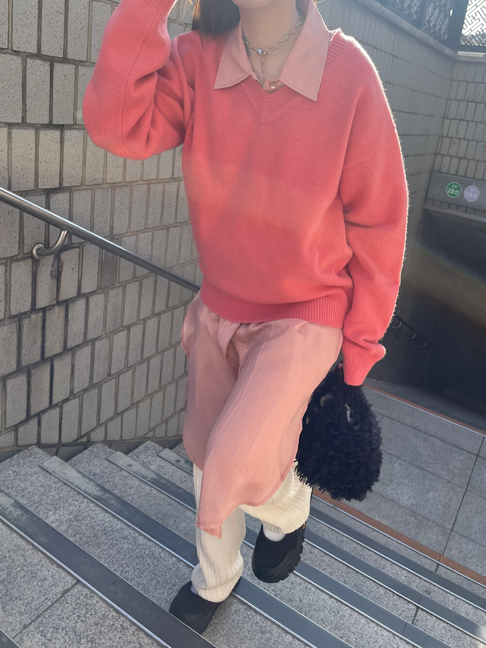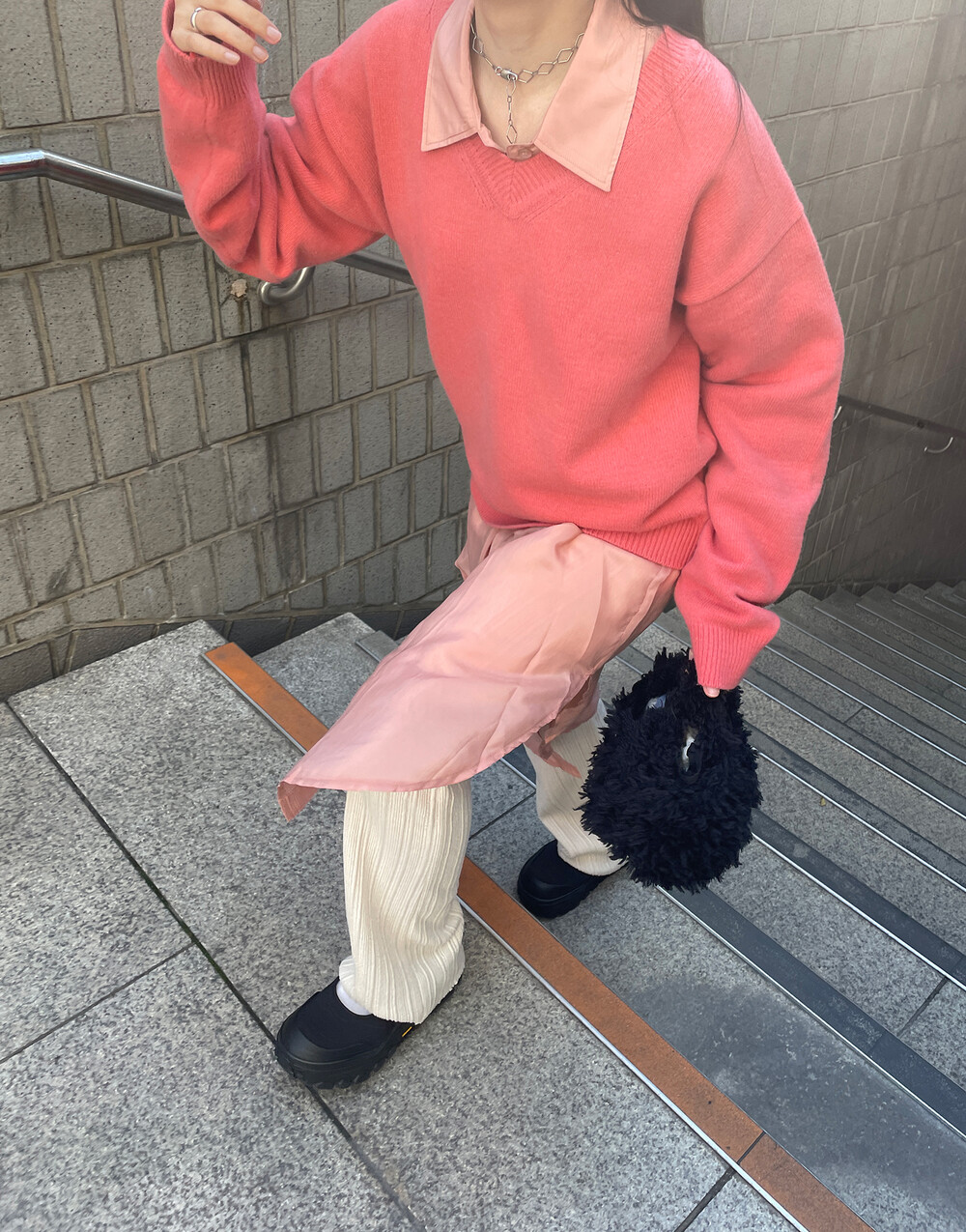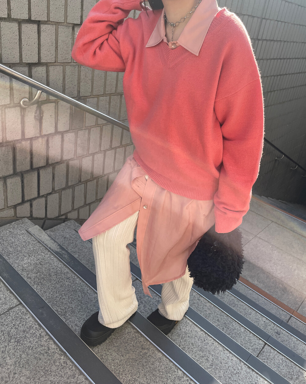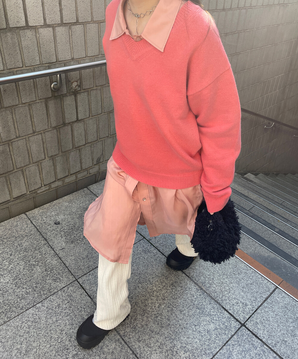 아우터가 부피가 있는 편이기 때문에 하의까지 실루엣이 부피가 있으면