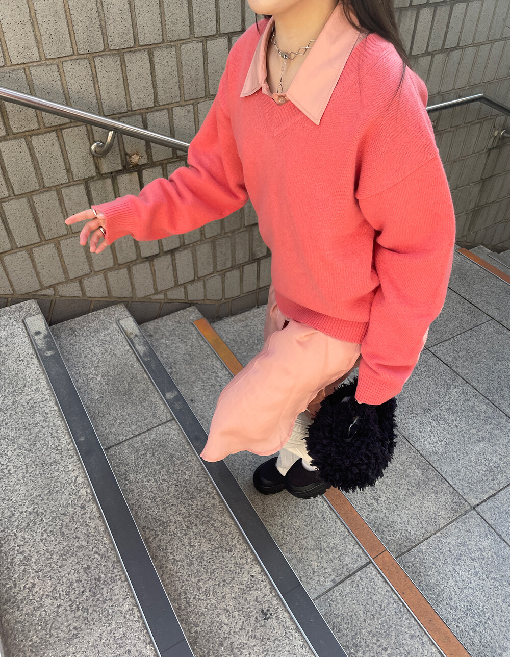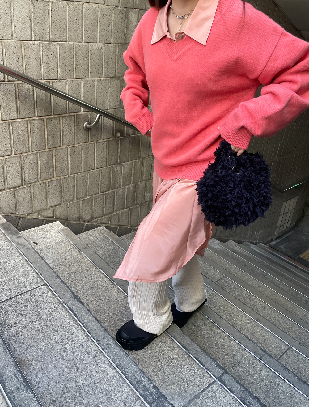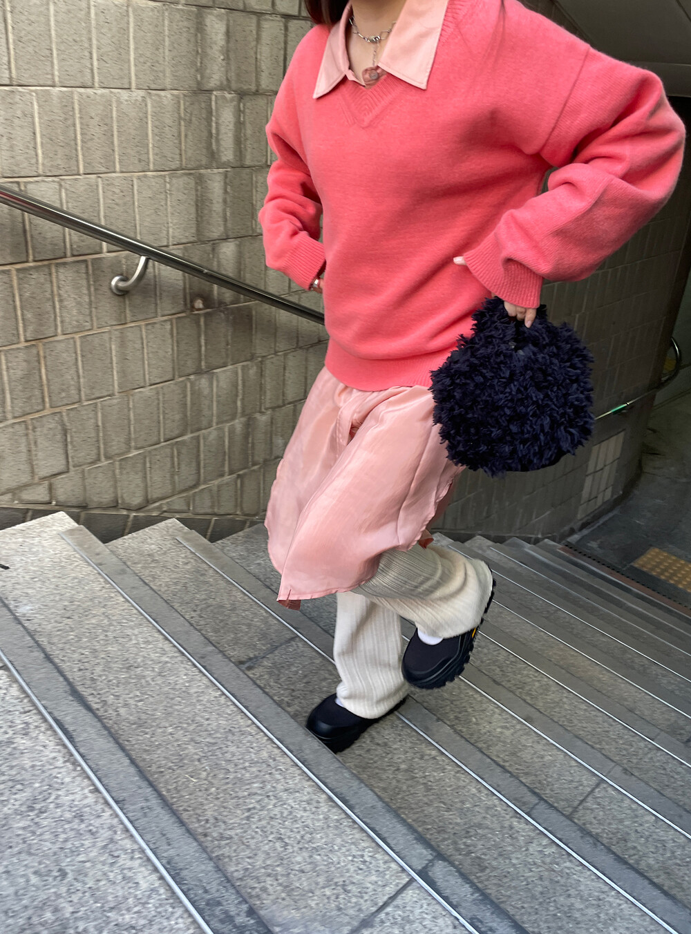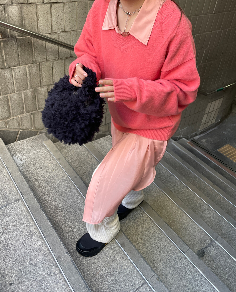 아우터가 부피가 있는 편이기 때문에 하의까지 실루엣이 부피가 있으면
