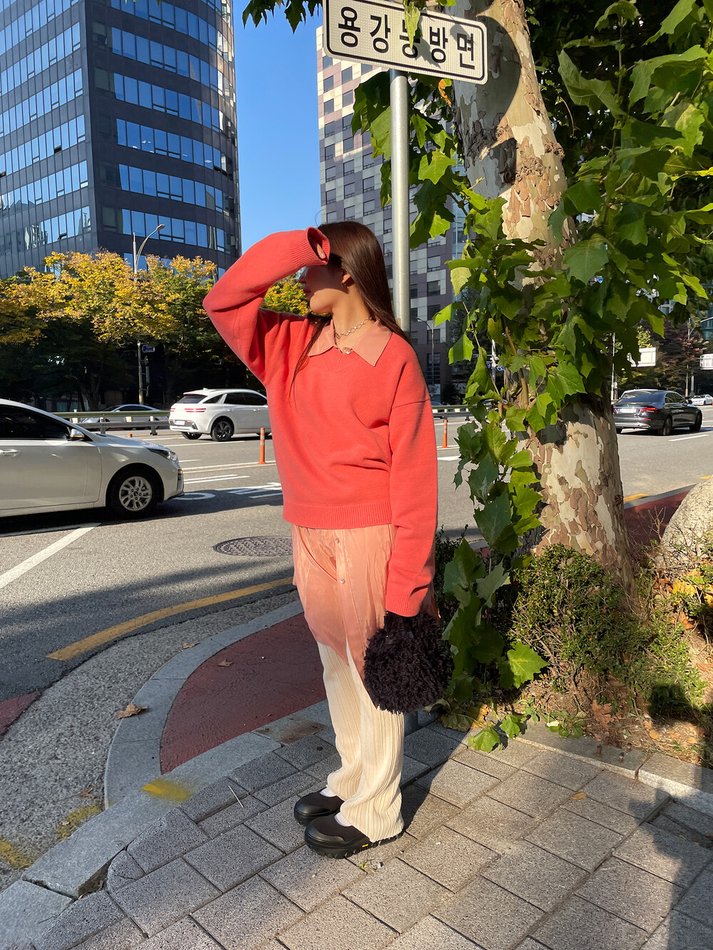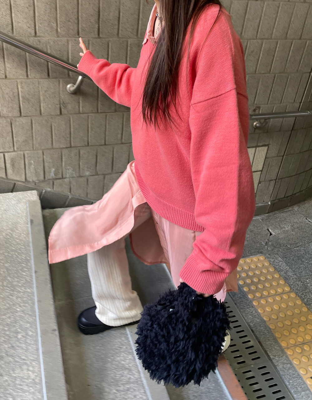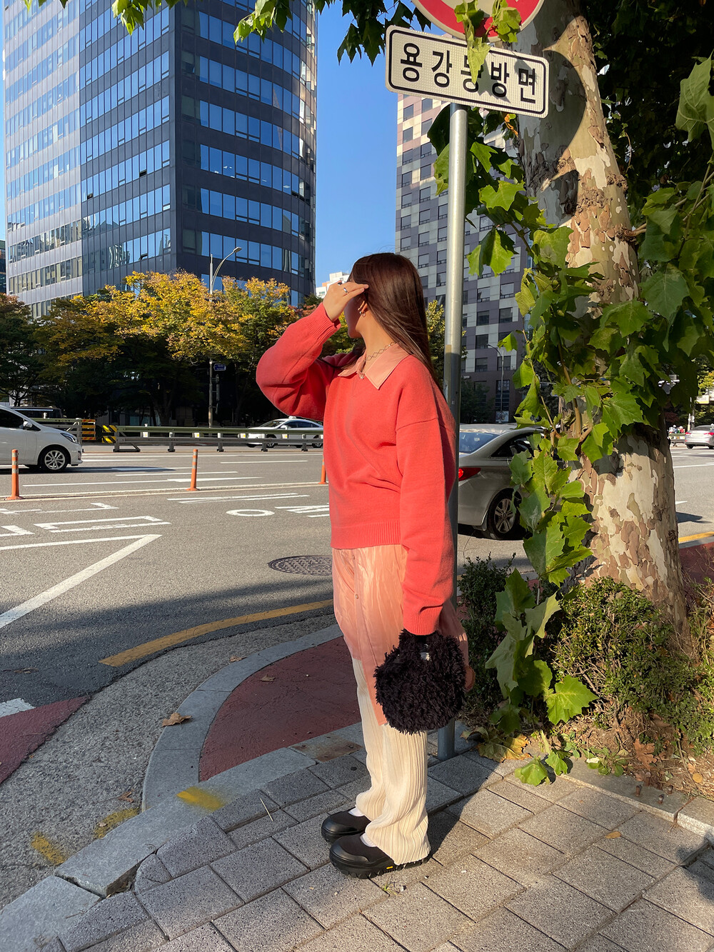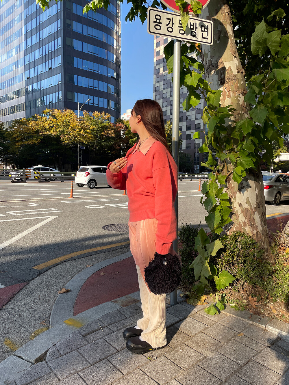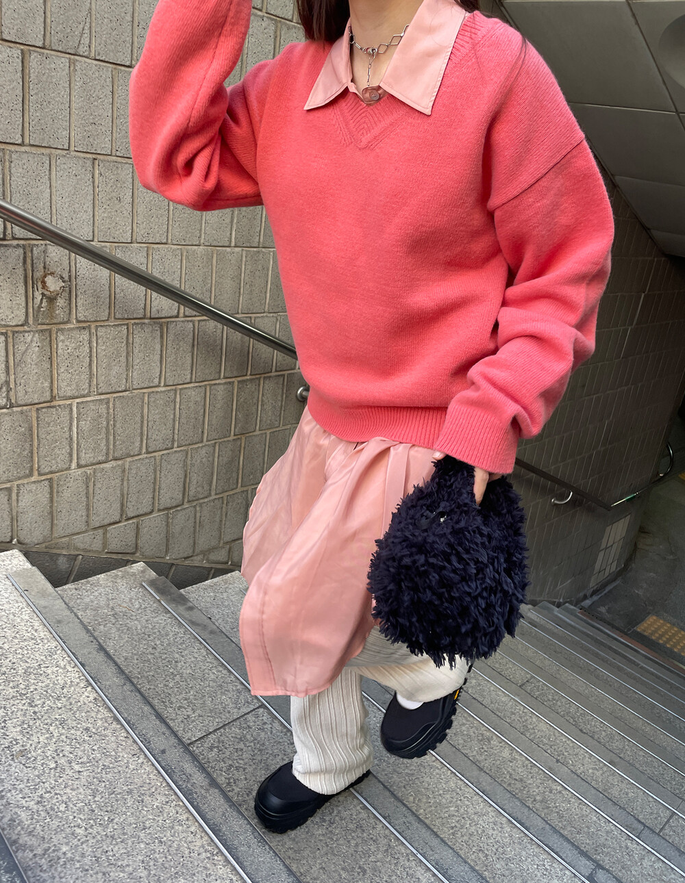 아우터가 부피가 있는 편이기 때문에 하의까지 실루엣이 부피가 있으면