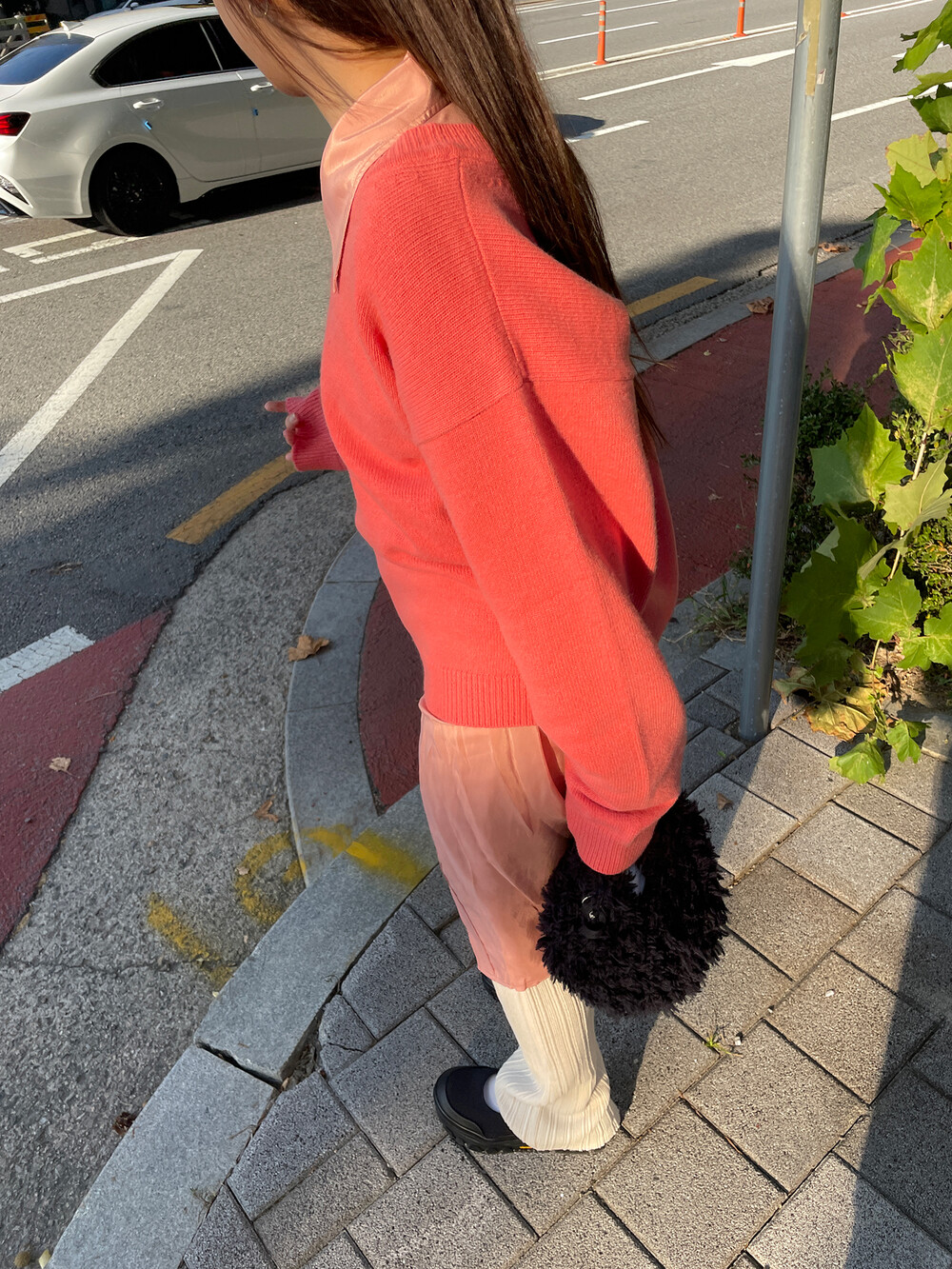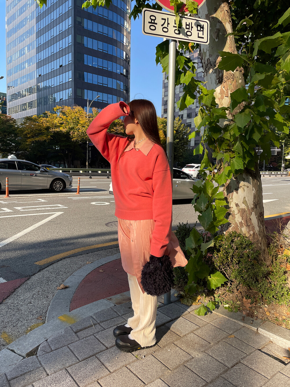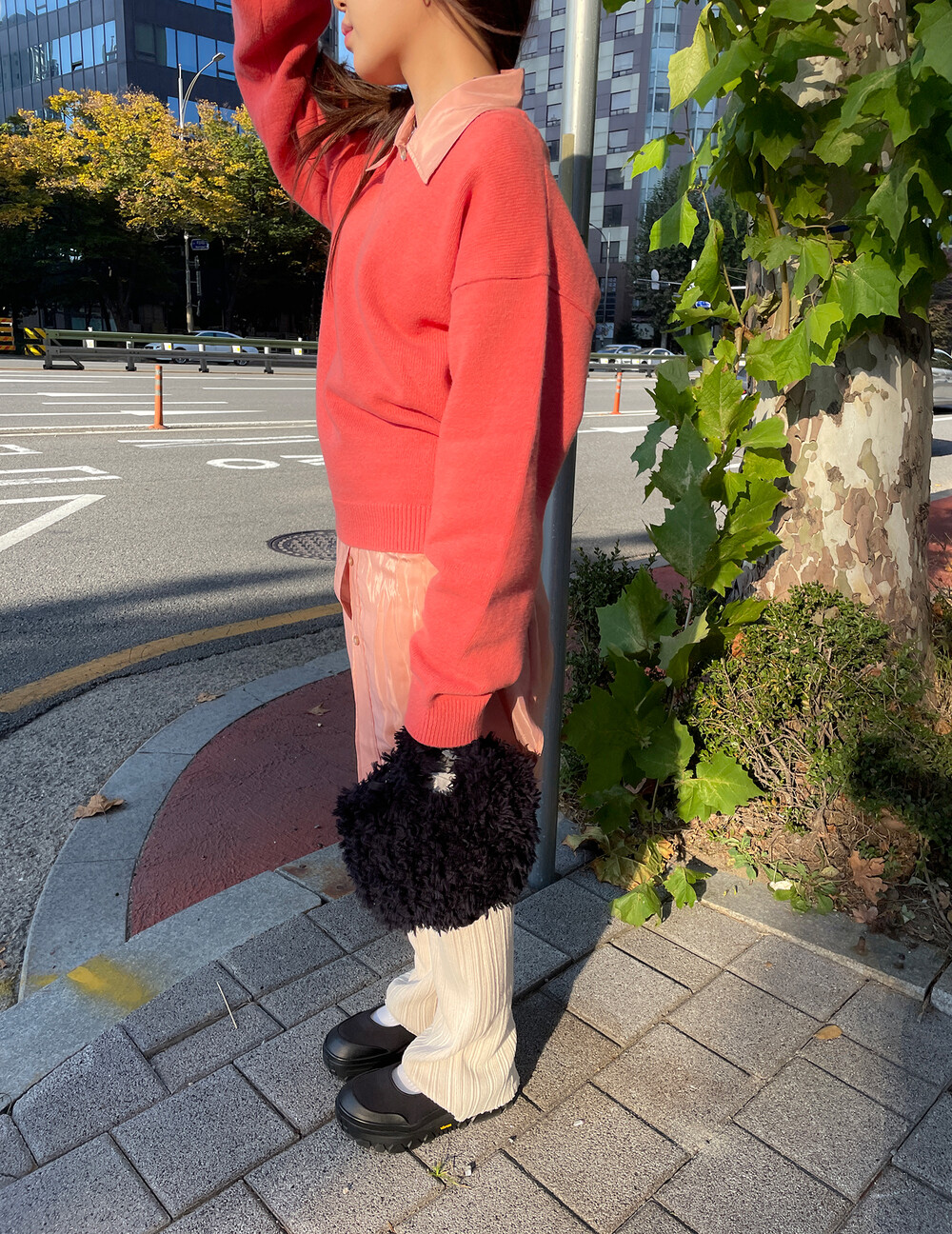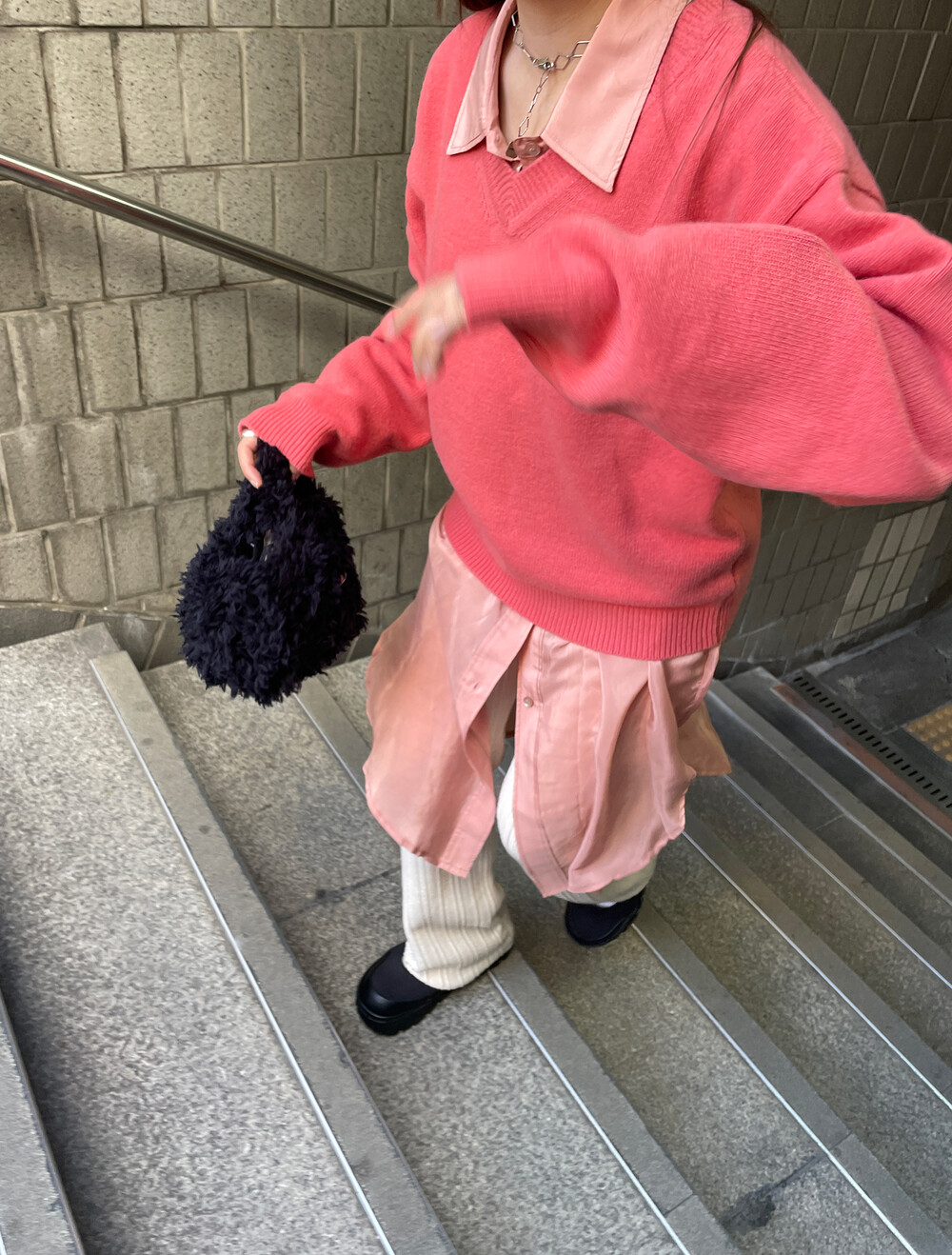 아우터가 부피가 있는 편이기 때문에 하의까지 실루엣이 부피가 있으면
