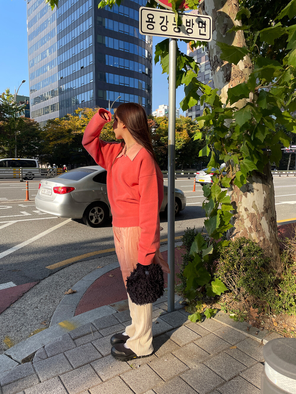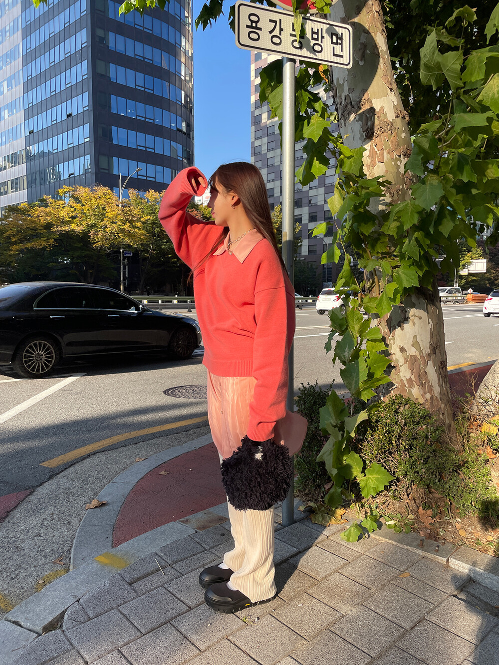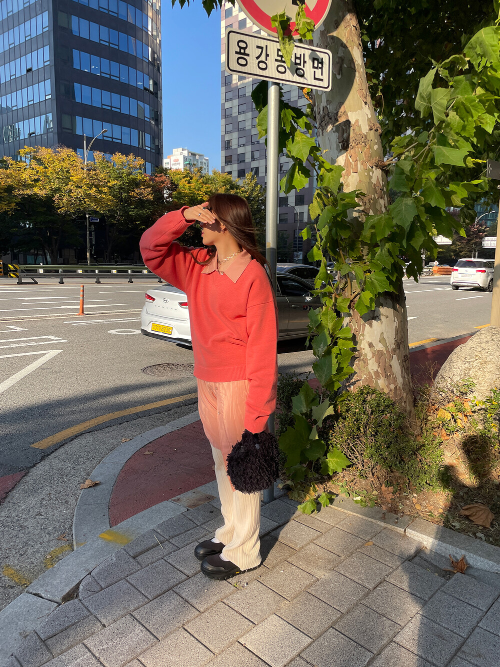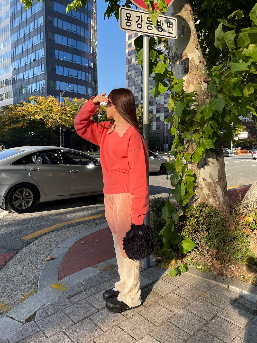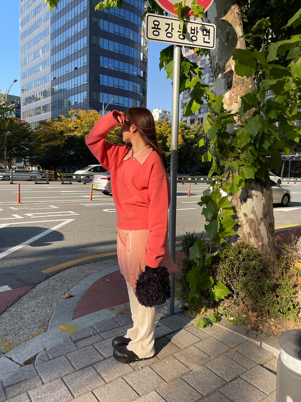 아우터가 부피가 있는 편이기 때문에 하의까지 실루엣이 부피가 있으면