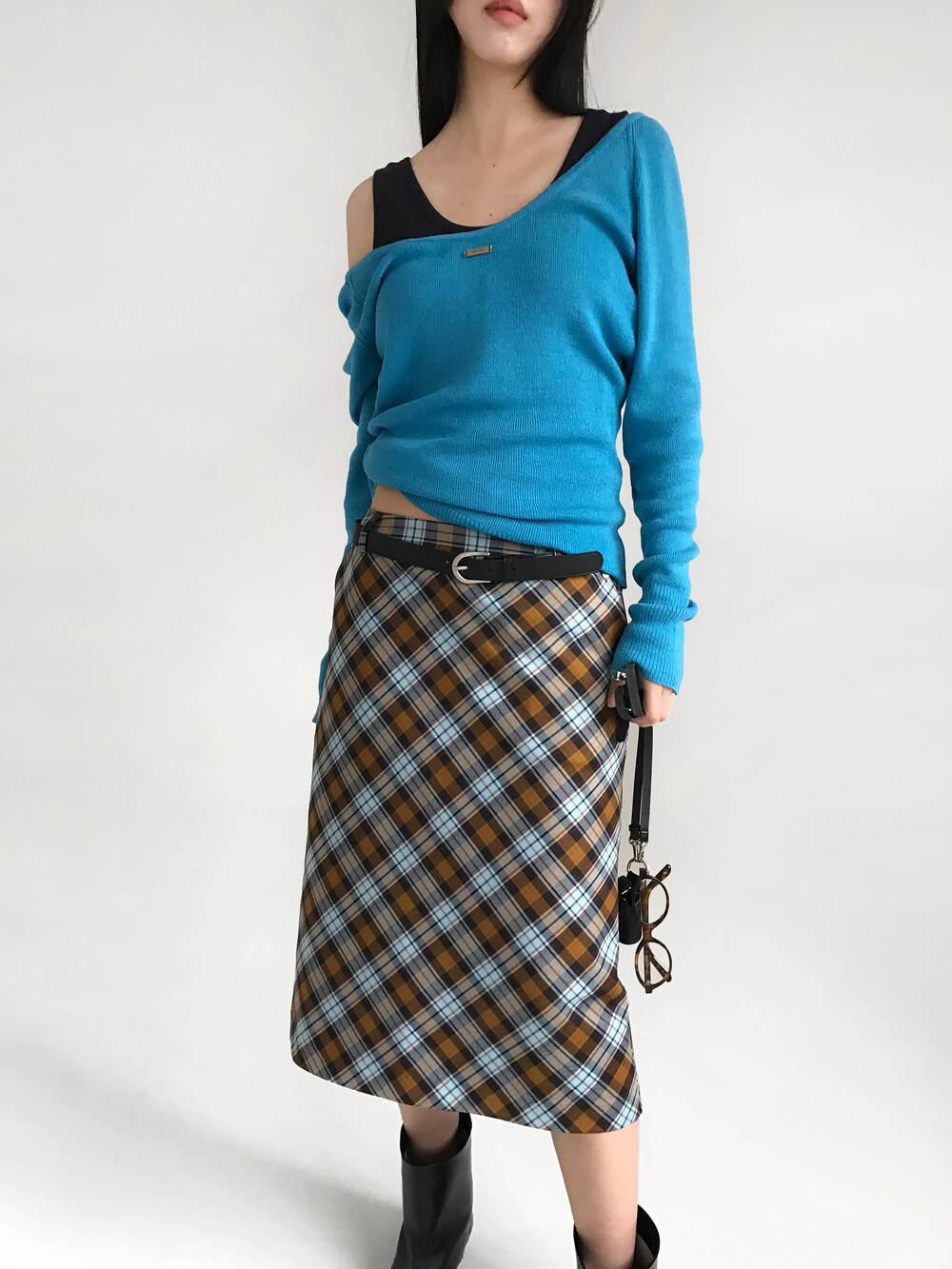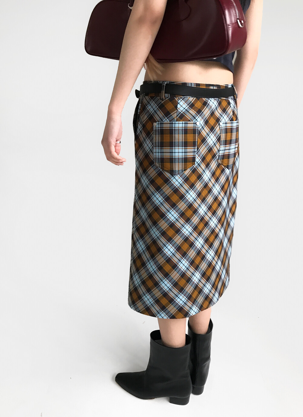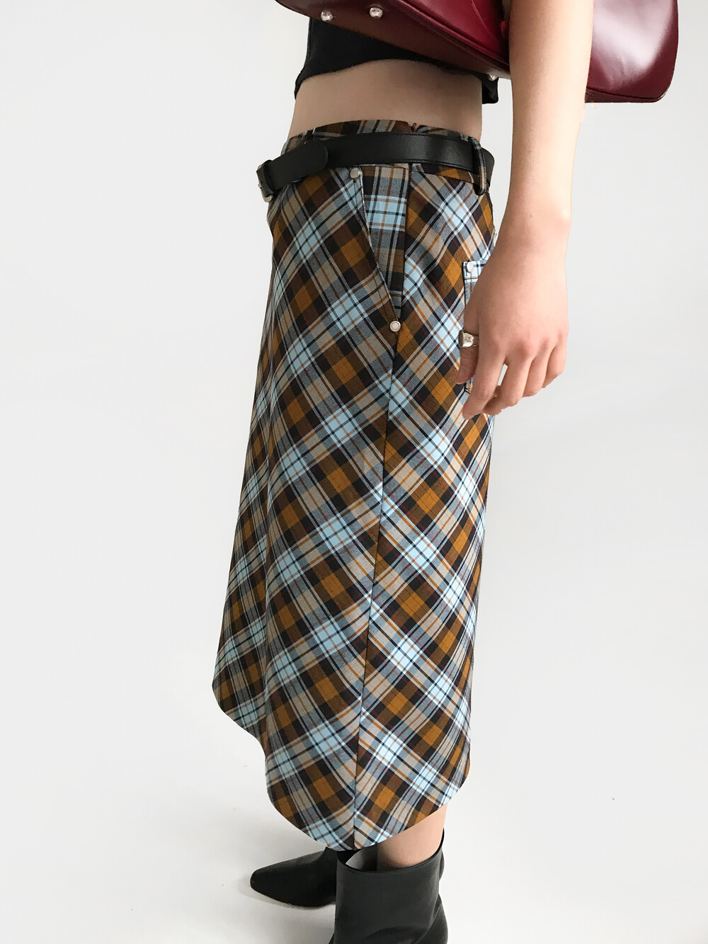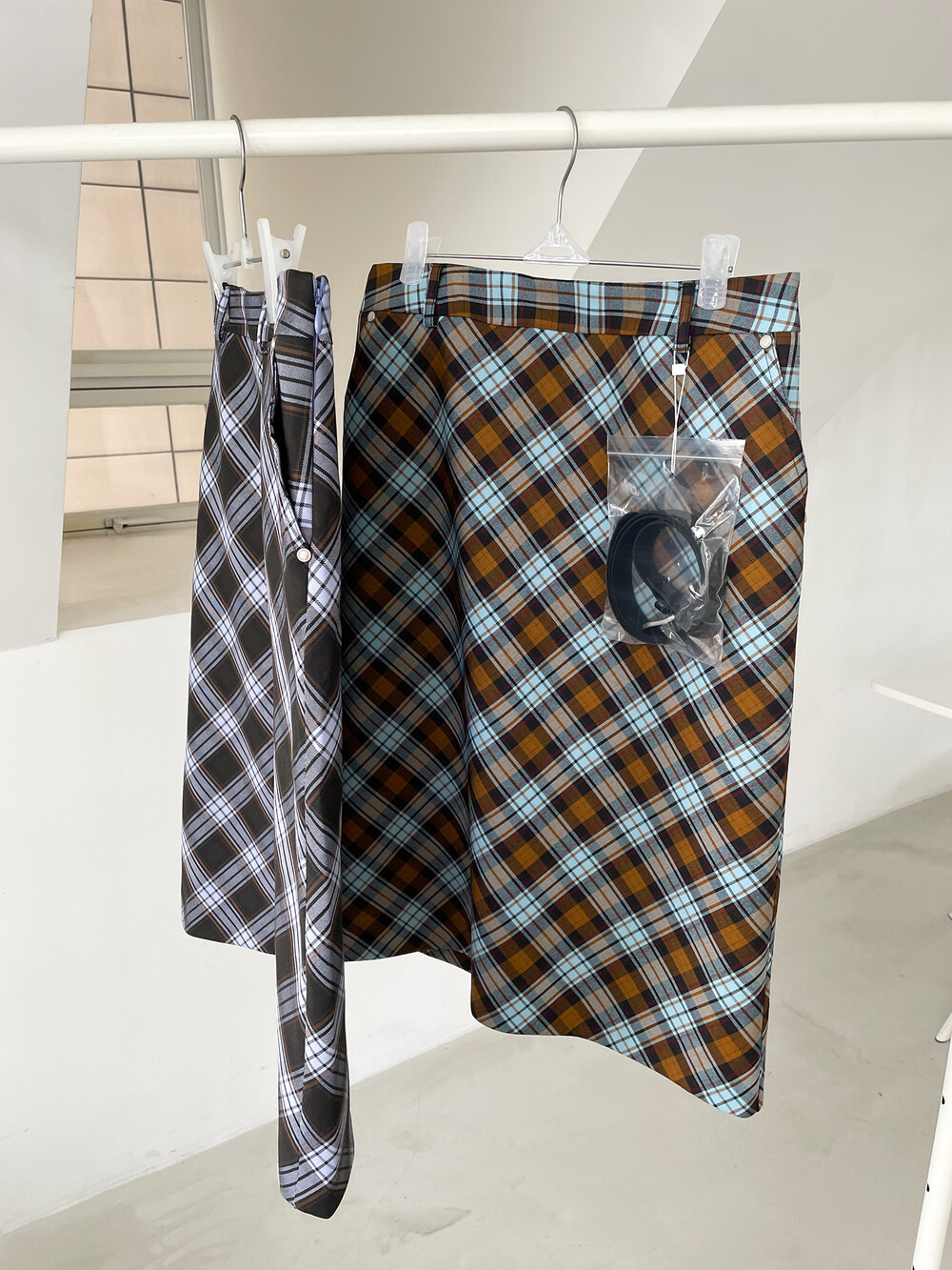 CARRIE CHECK RIVET SKIRT+BELT SET, BROWN (2C)