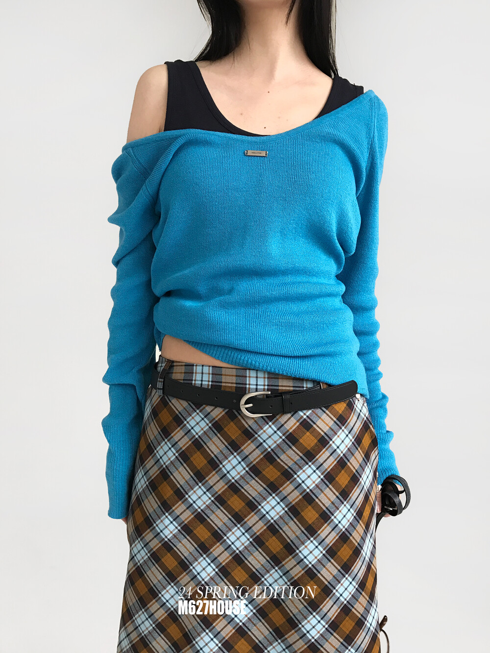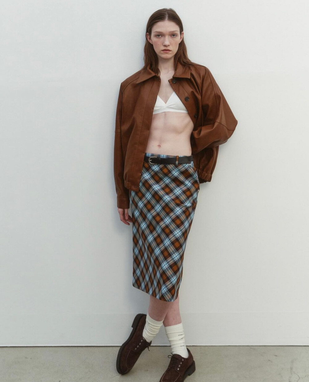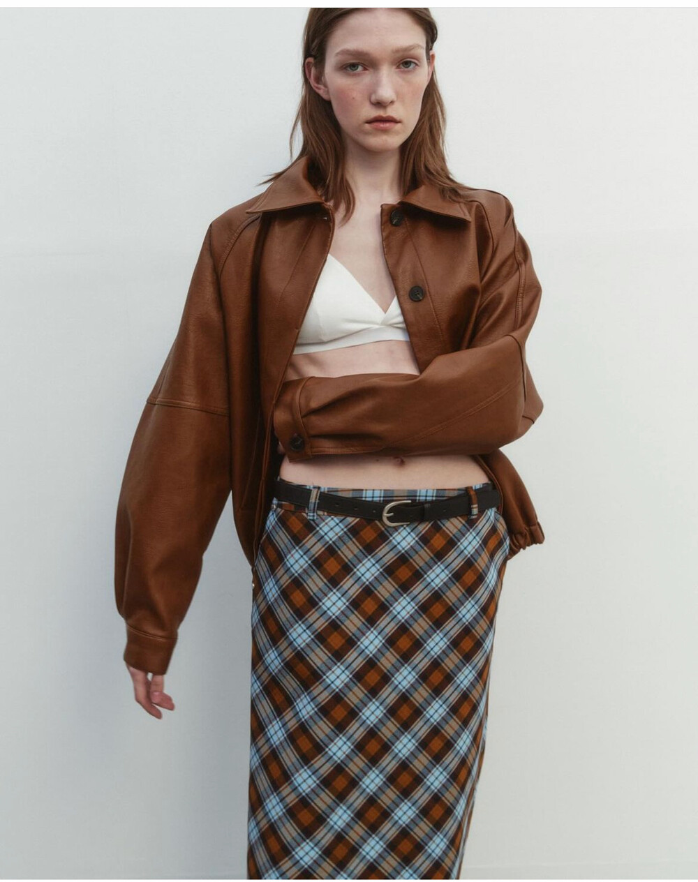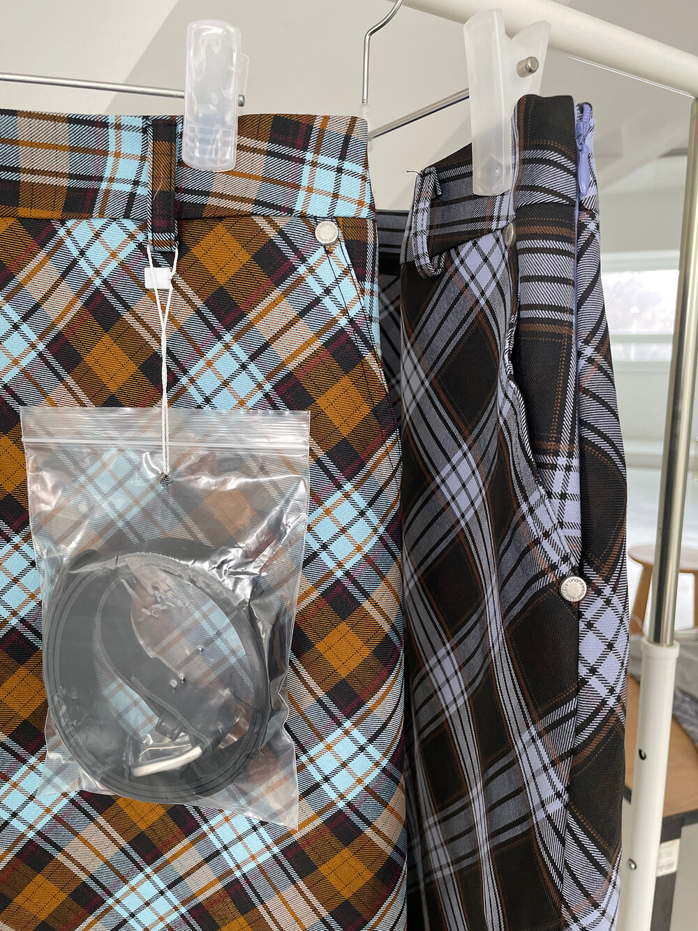 CARRIE CHECK RIVET SKIRT+BELT SET, BROWN (2C)
