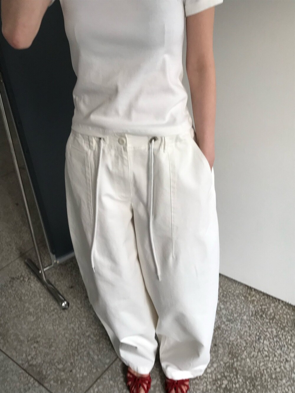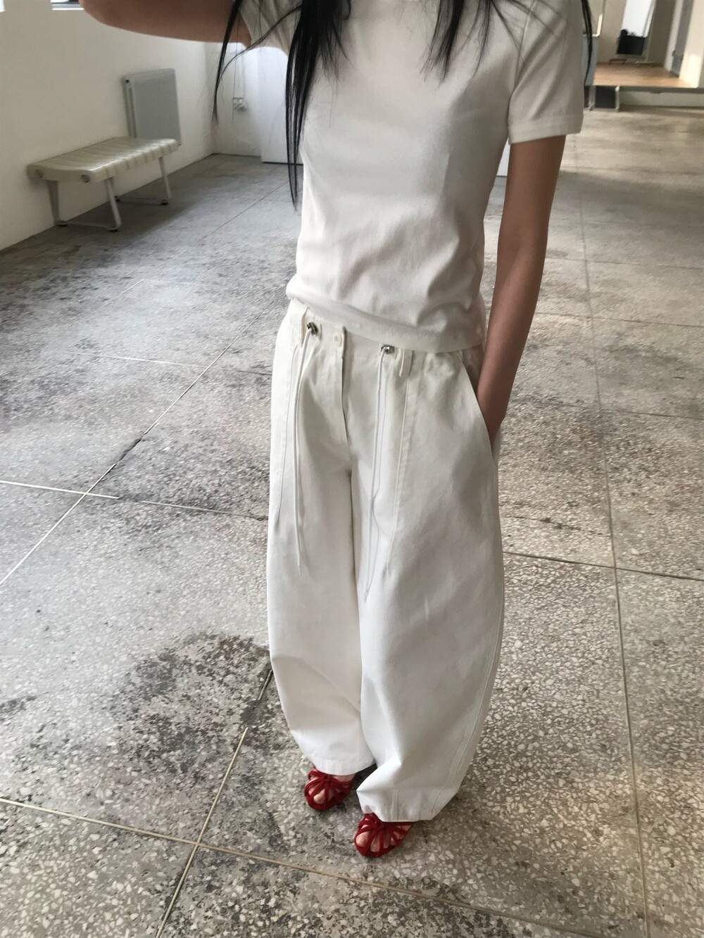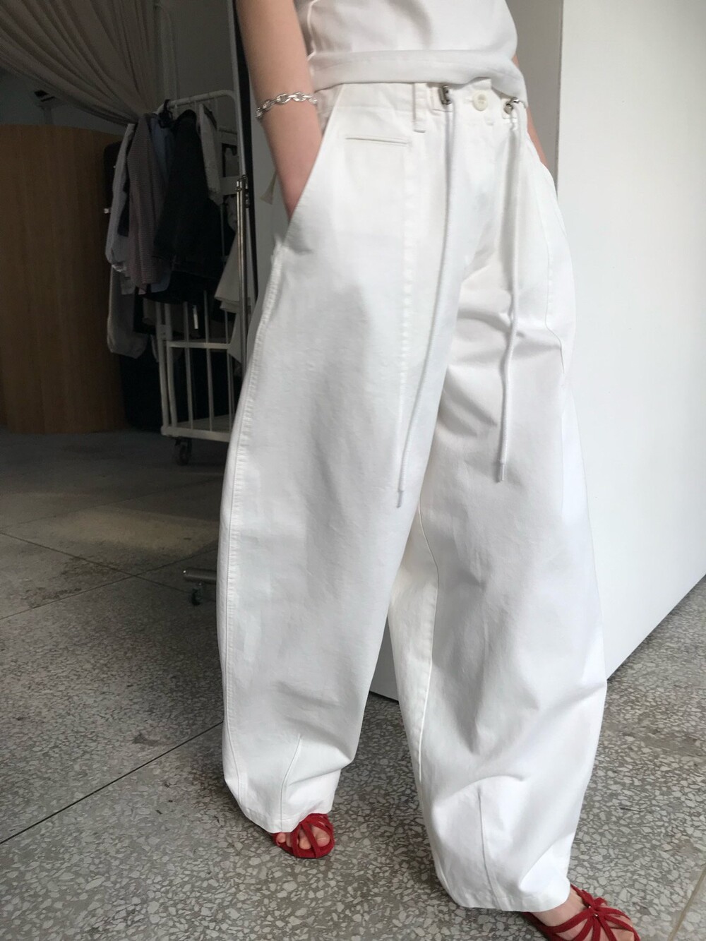 허리부분의 스트링으로 사이즈 조절이 가능합니다.