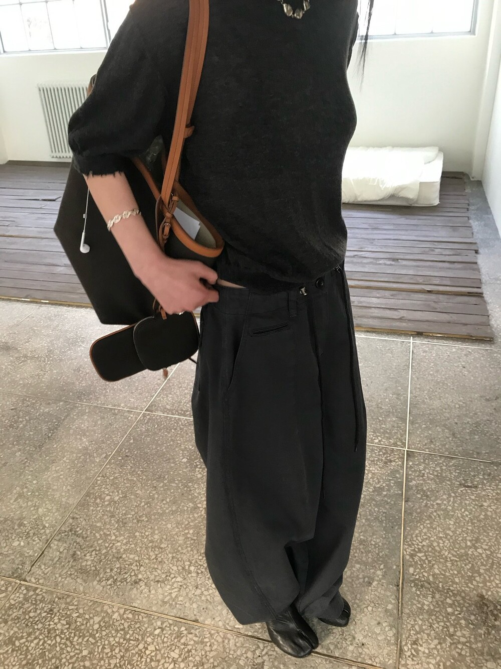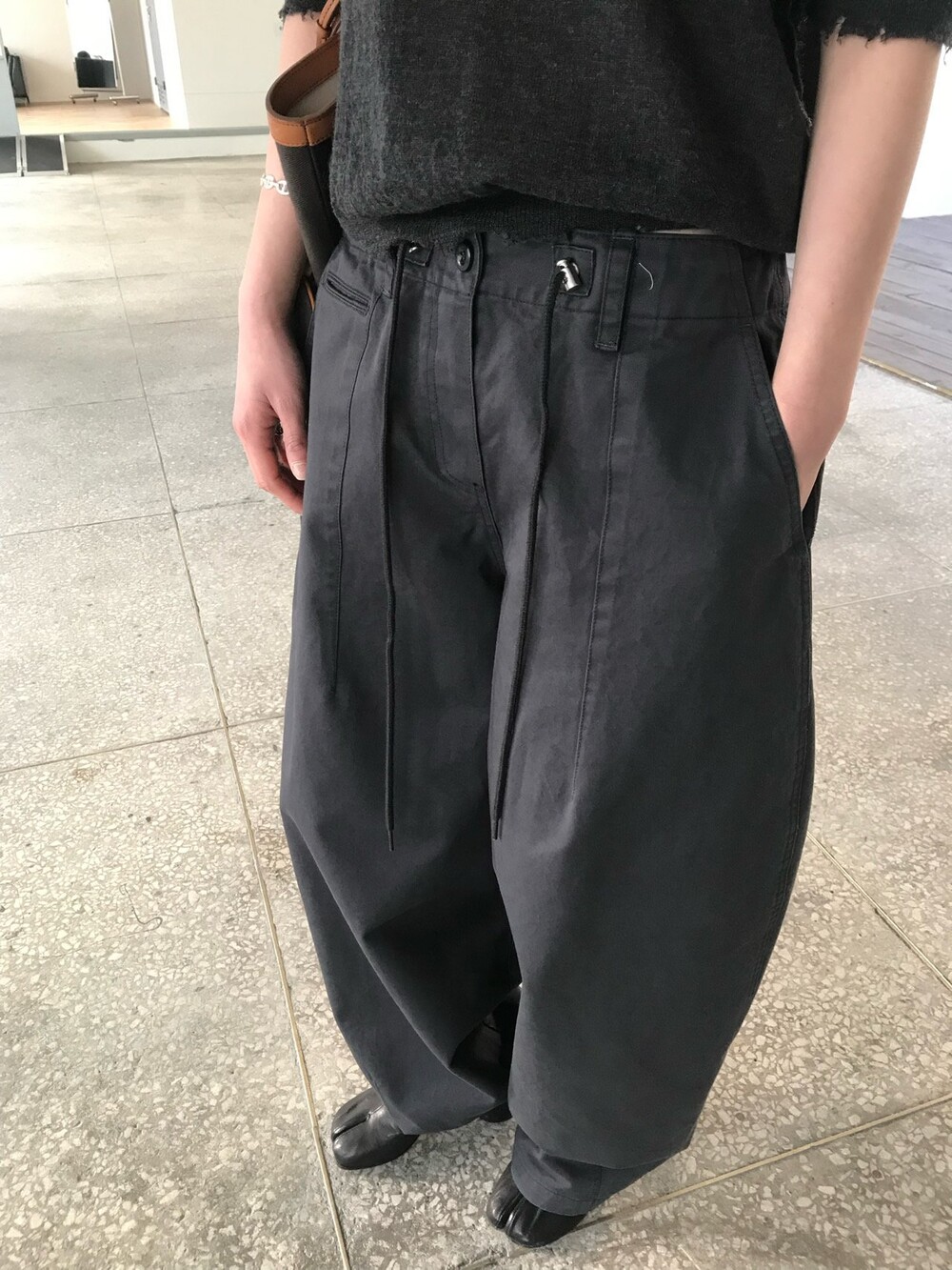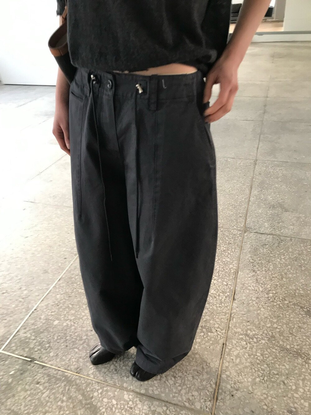 허리부분의 스트링으로 사이즈 조절이 가능합니다.