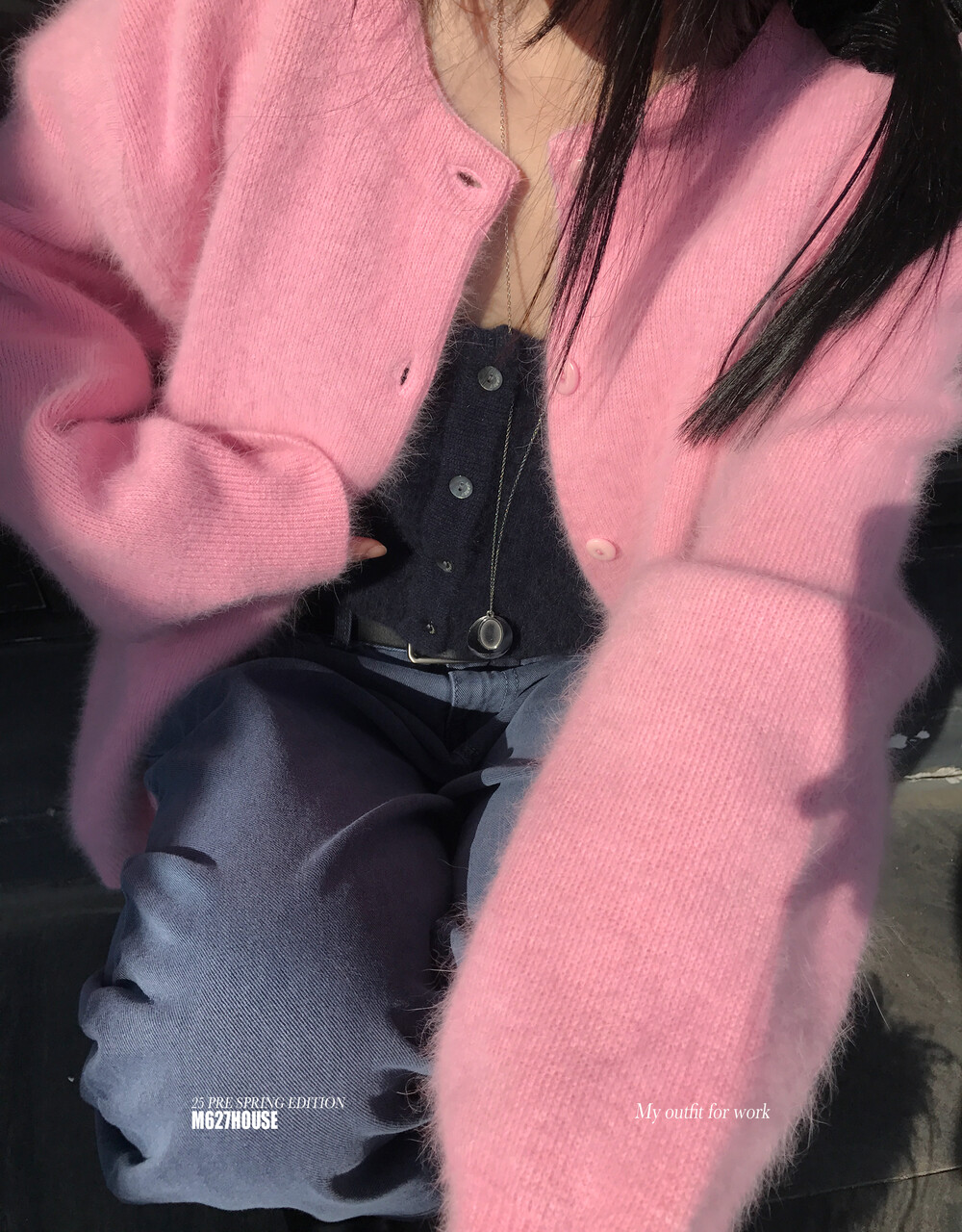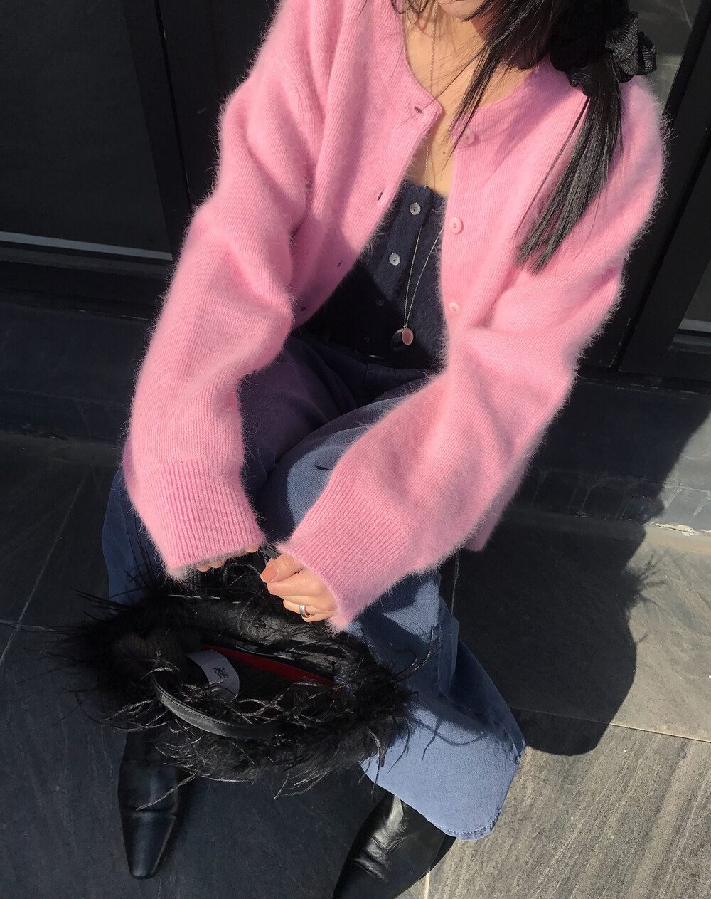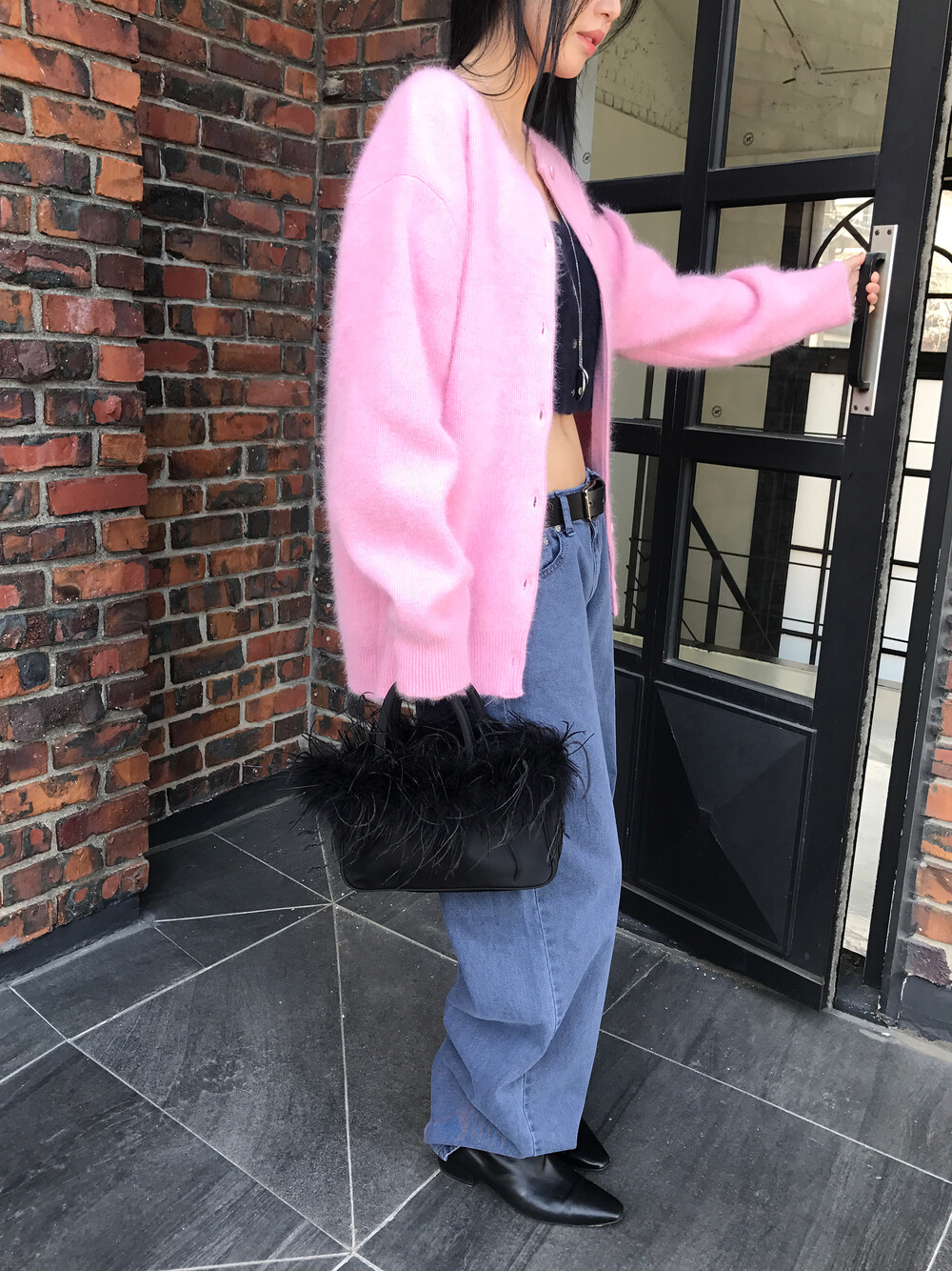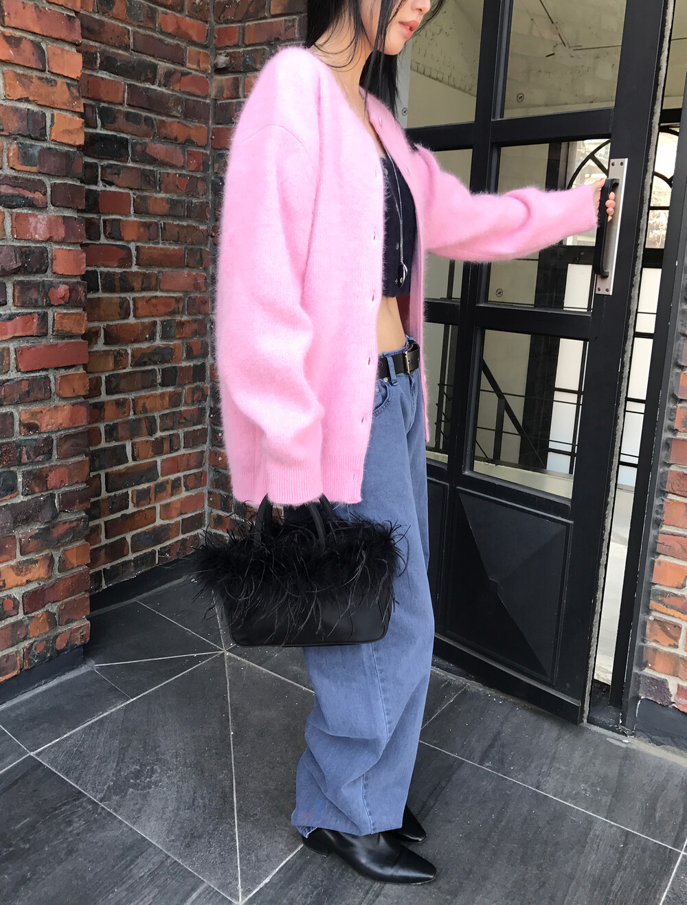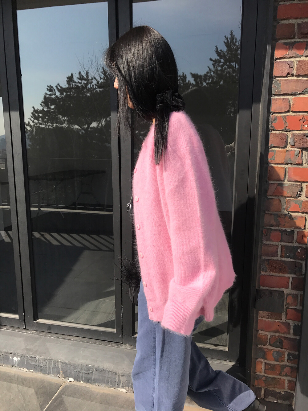 부드러운 앙고라의 텍스처와 질감을 살린 헤어리한 원사를 사용해 포근한 무드가 느껴지는 가디건.
