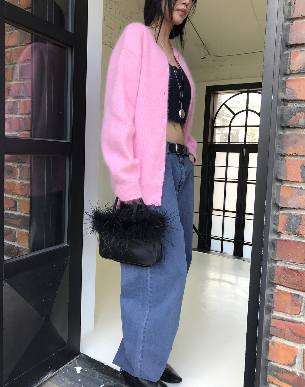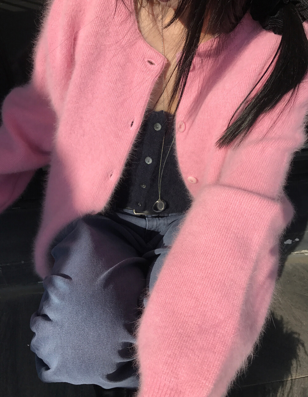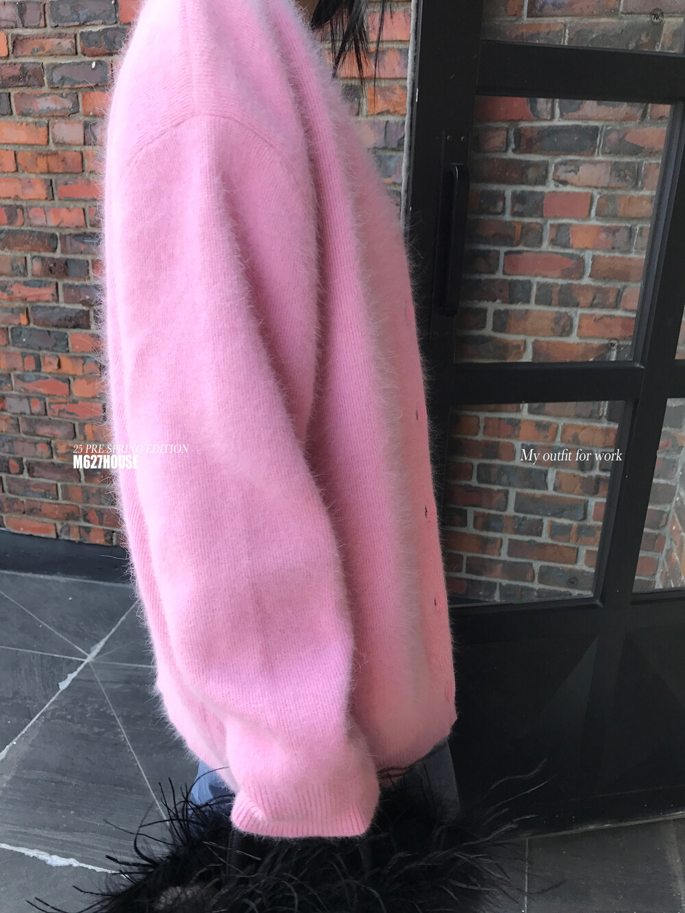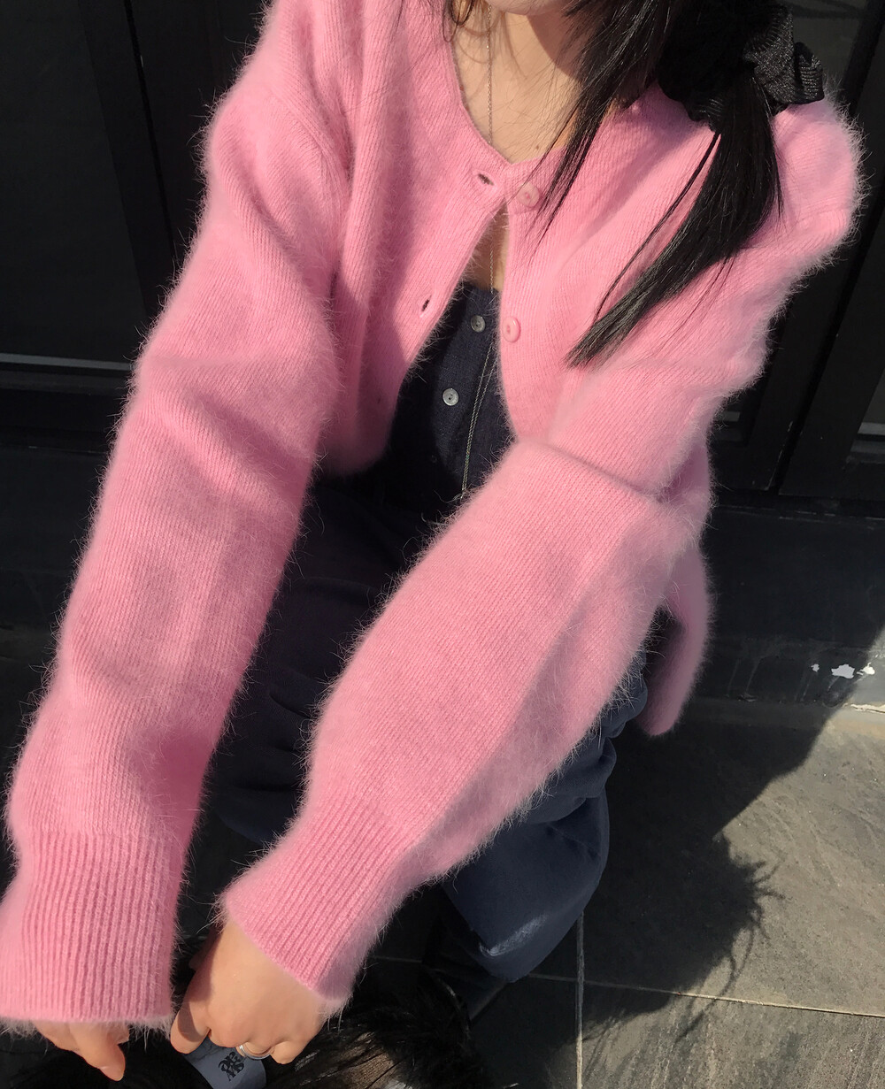 부드러운 앙고라의 텍스처와 질감을 살린 헤어리한 원사를 사용해 포근한 무드가 느껴지는 가디건.