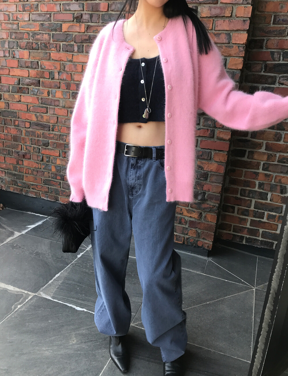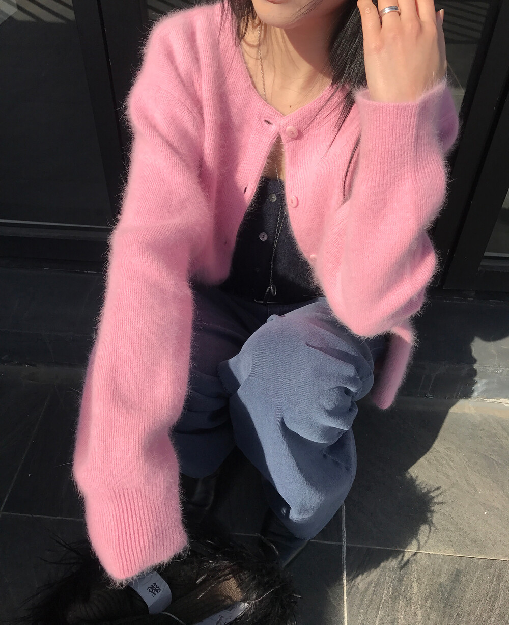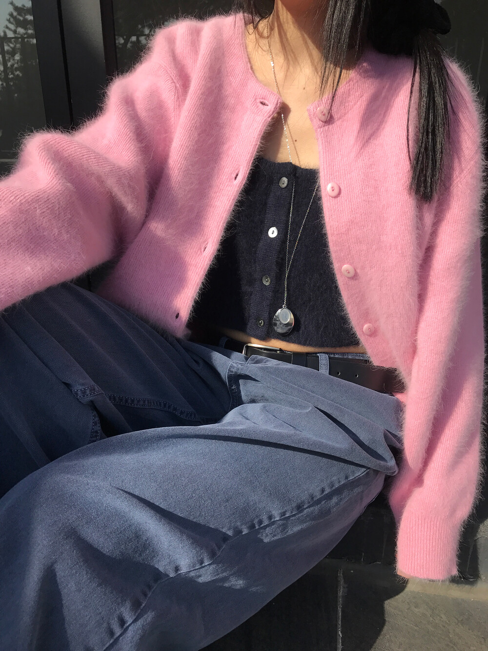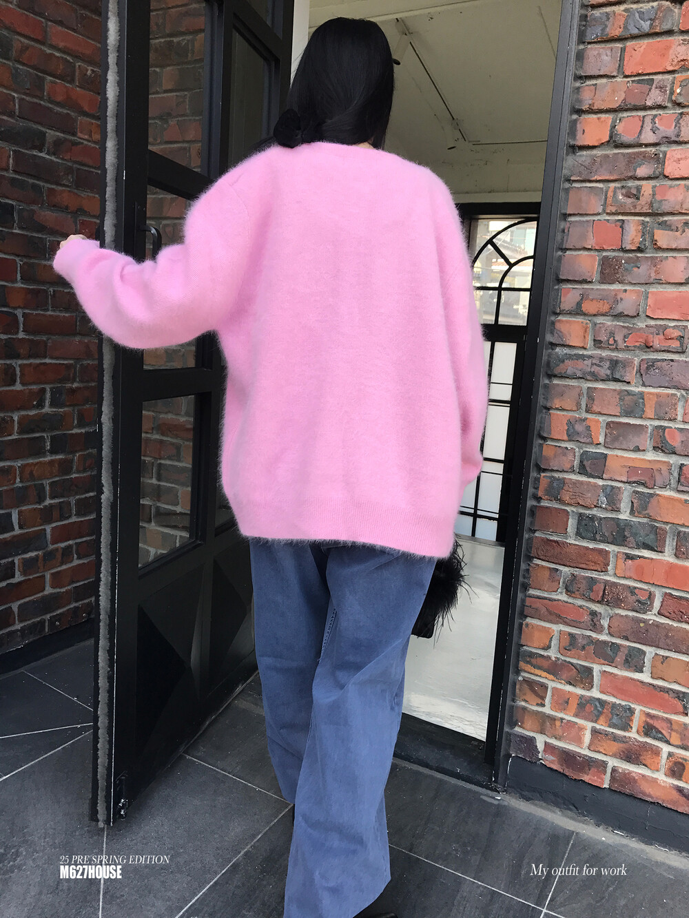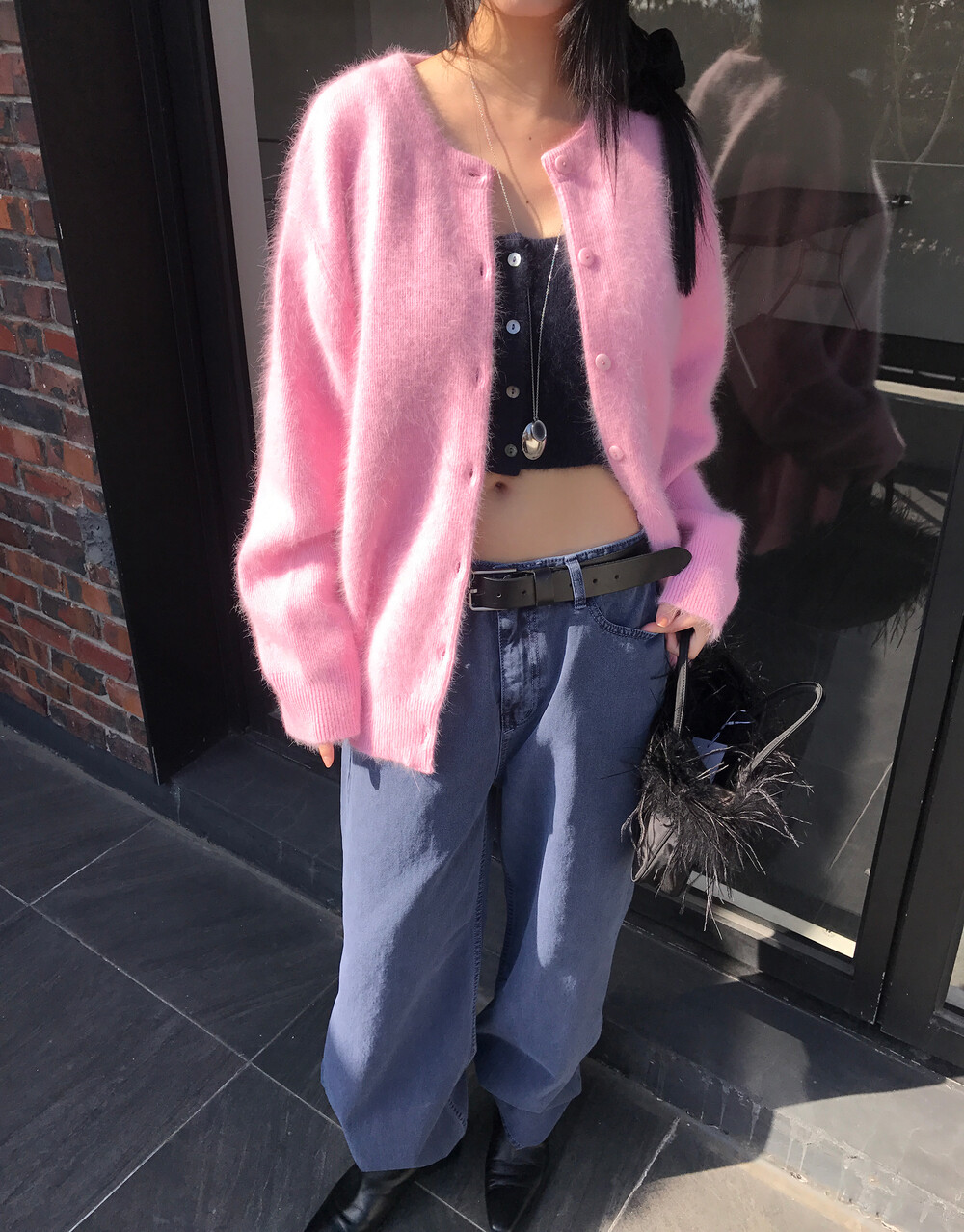부드러운 앙고라의 텍스처와 질감을 살린 헤어리한 원사를 사용해 포근한 무드가 느껴지는 가디건.