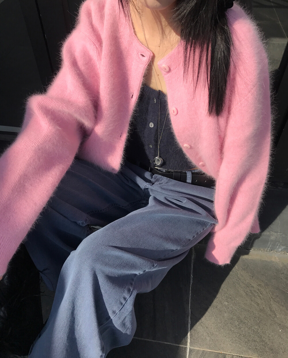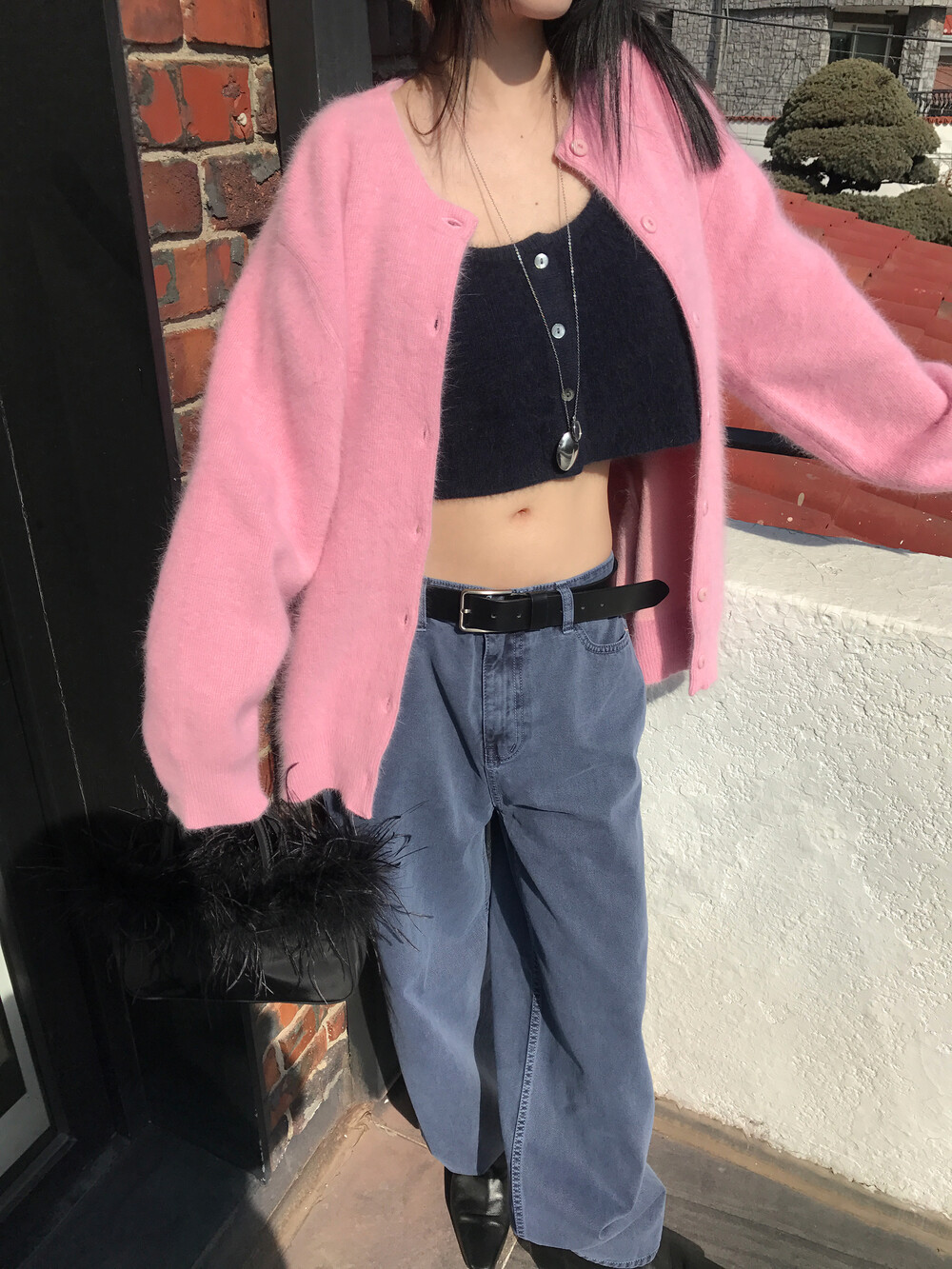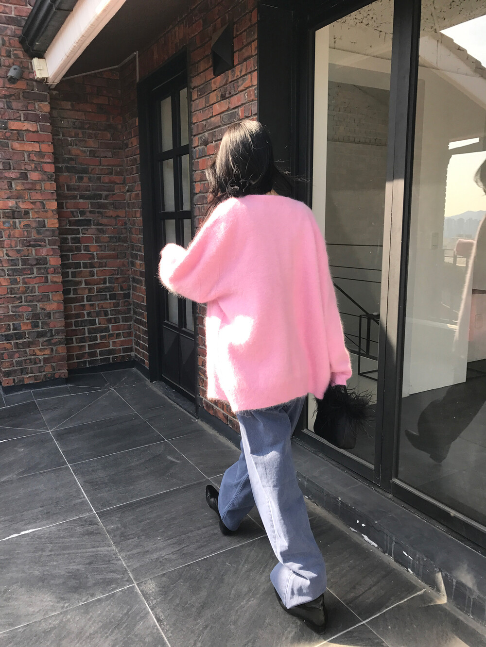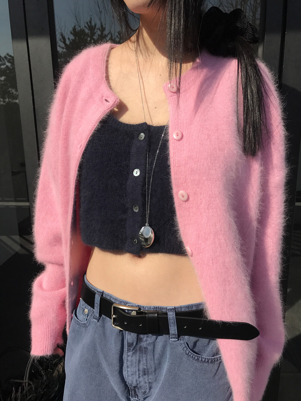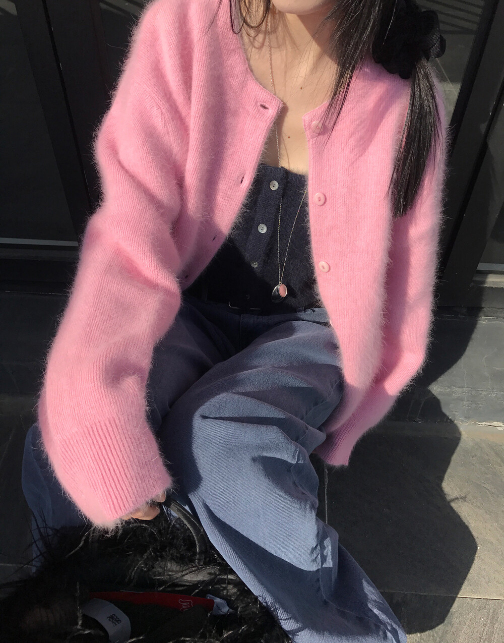 부드러운 앙고라의 텍스처와 질감을 살린 헤어리한 원사를 사용해 포근한 무드가 느껴지는 가디건.