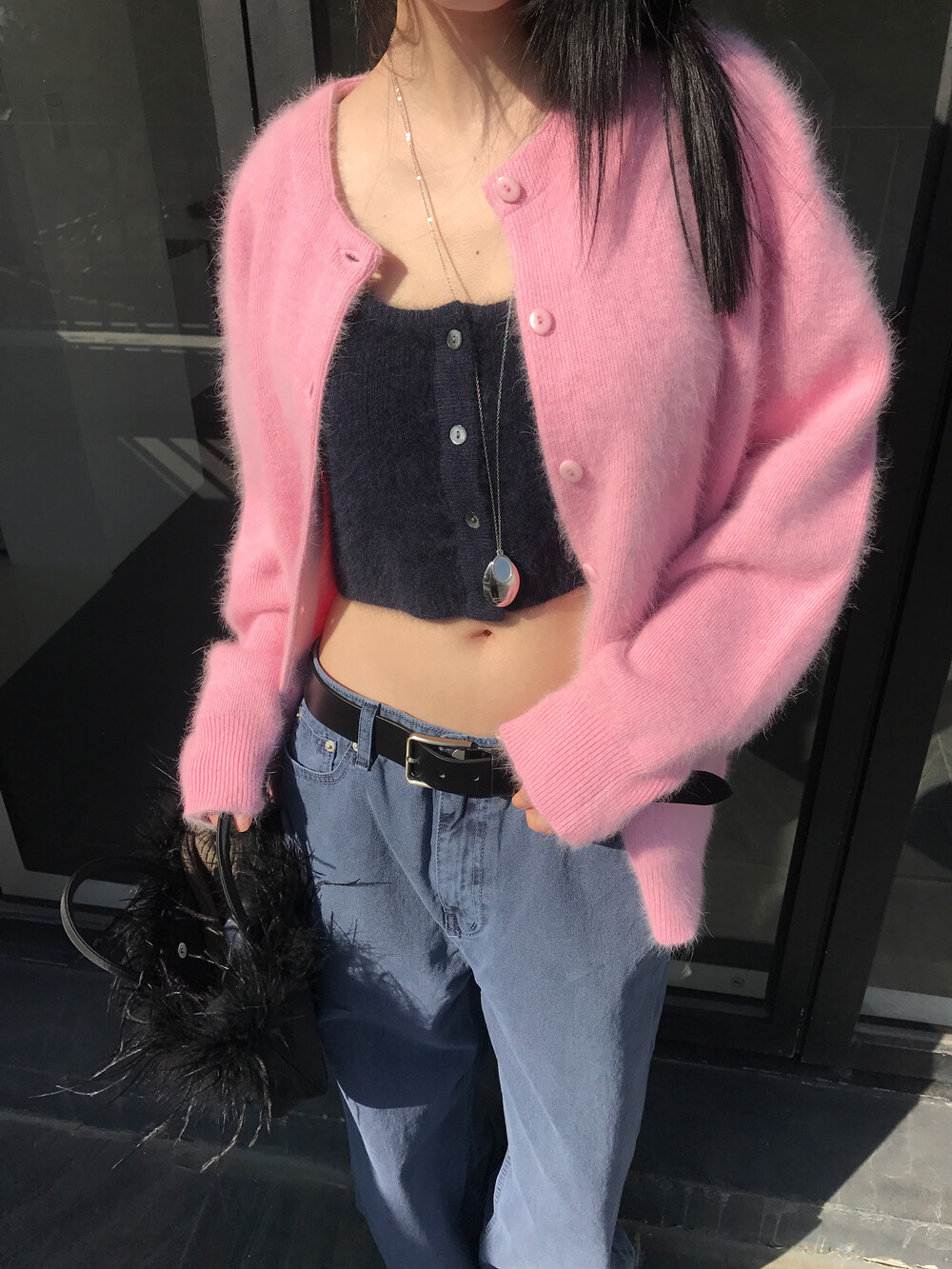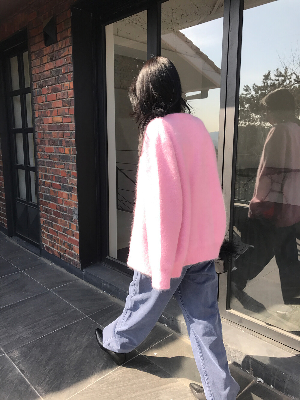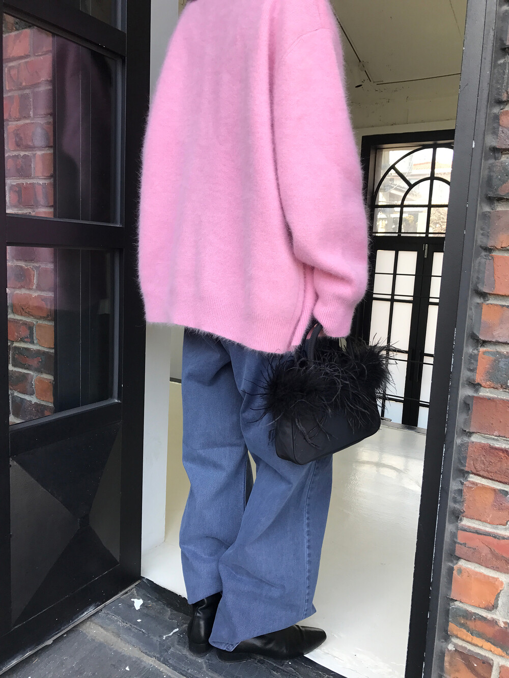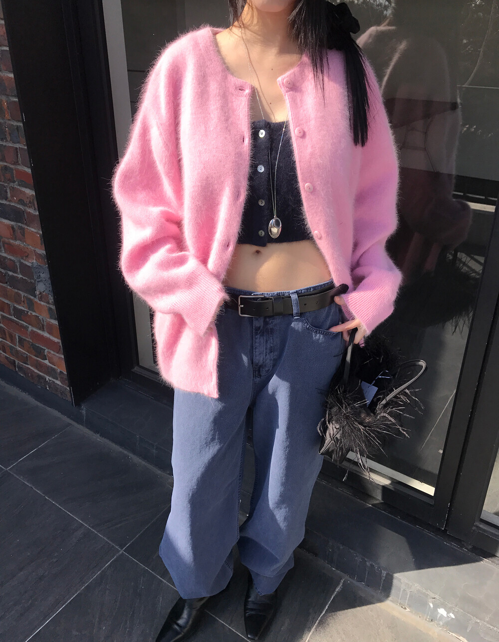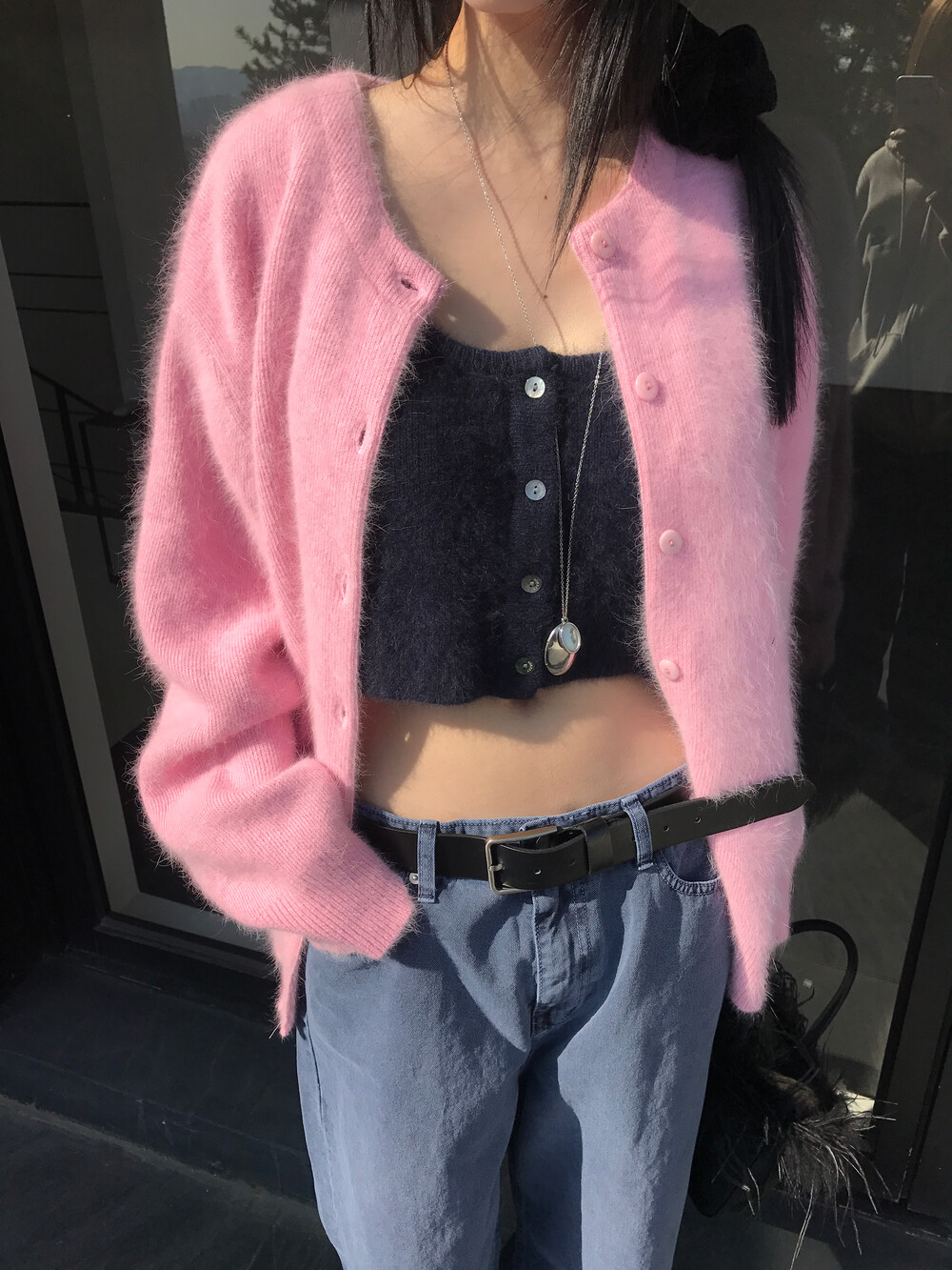 부드러운 앙고라의 텍스처와 질감을 살린 헤어리한 원사를 사용해 포근한 무드가 느껴지는 가디건.
