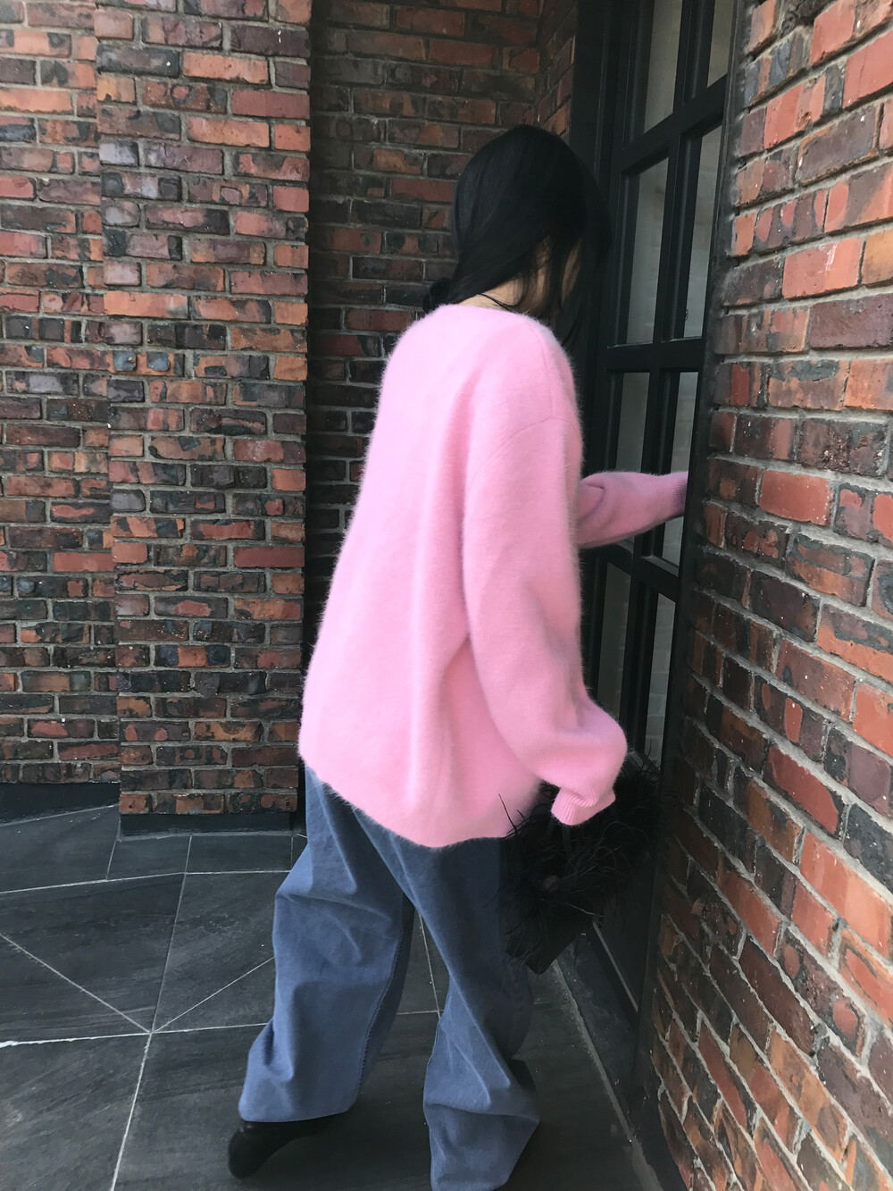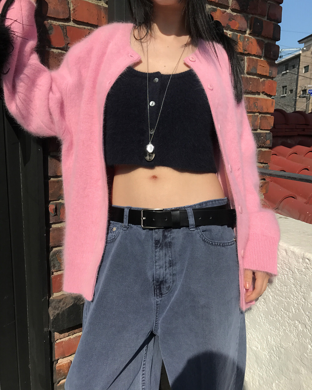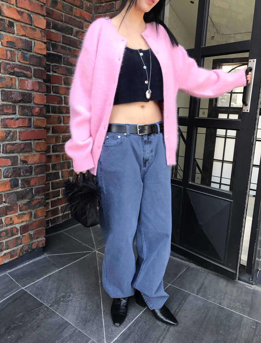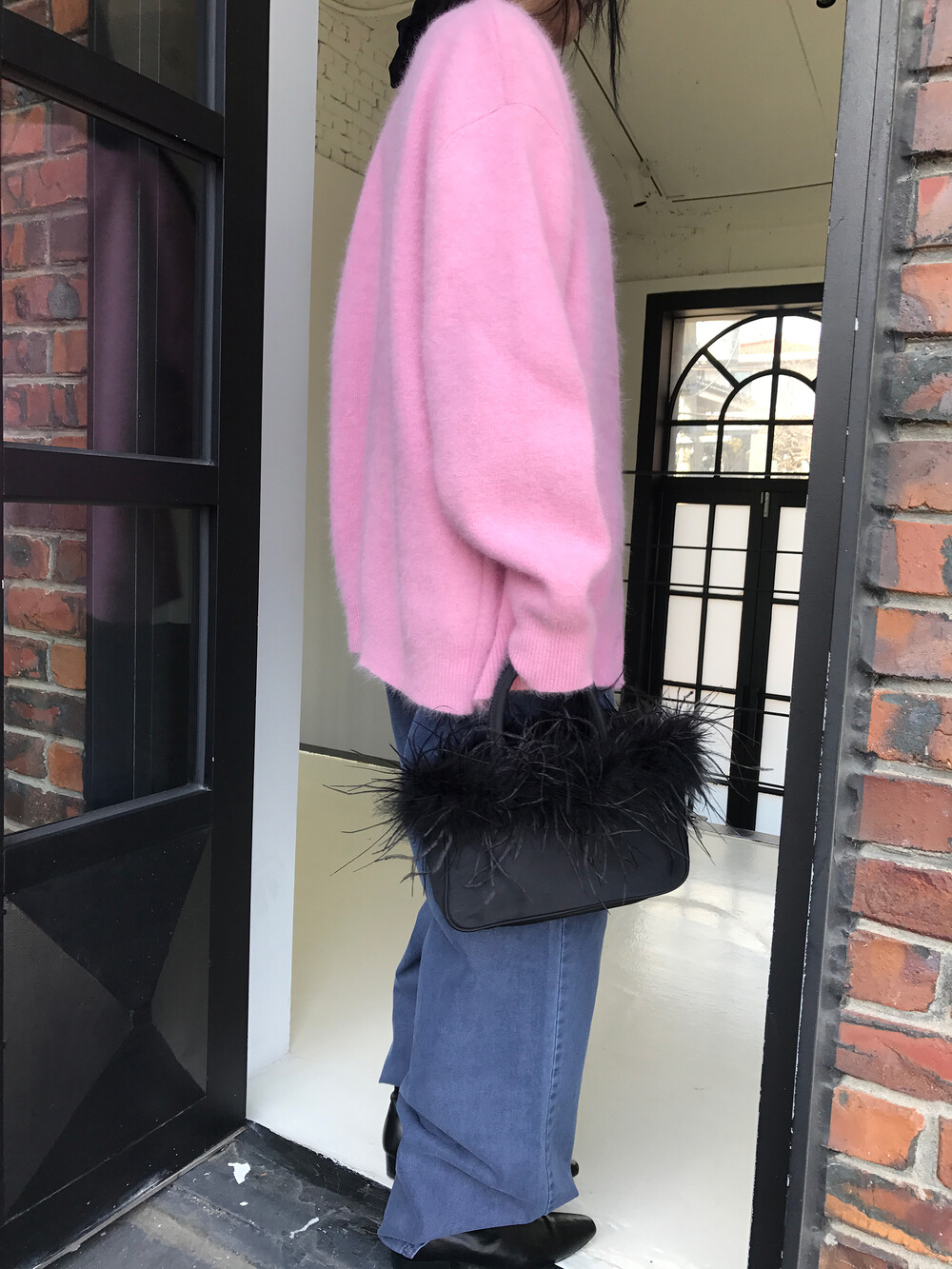 부드러운 앙고라의 텍스처와 질감을 살린 헤어리한 원사를 사용해 포근한 무드가 느껴지는 가디건.