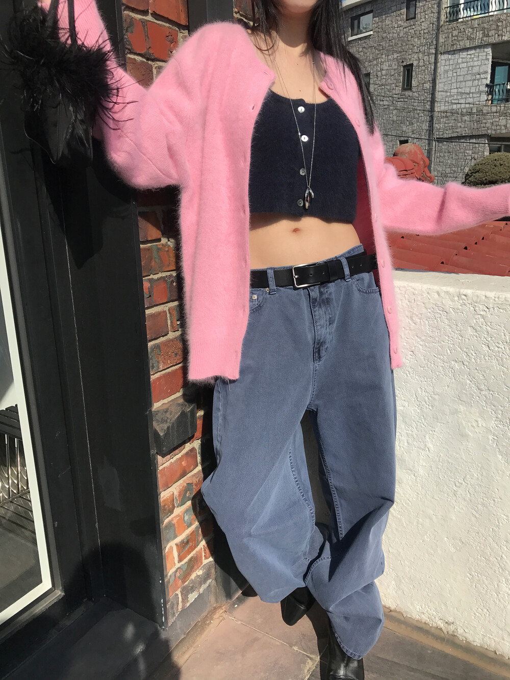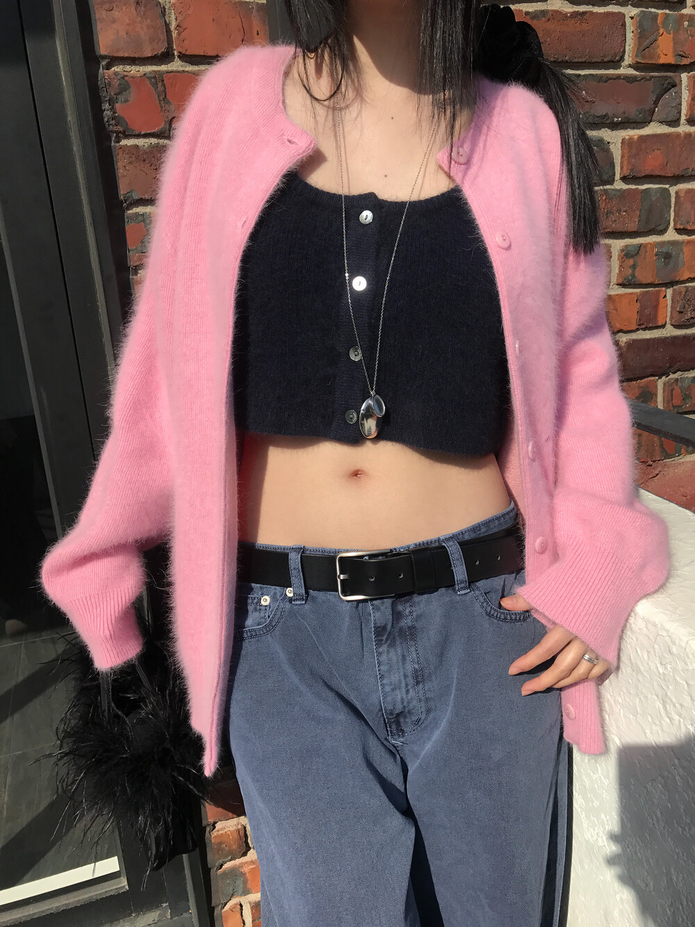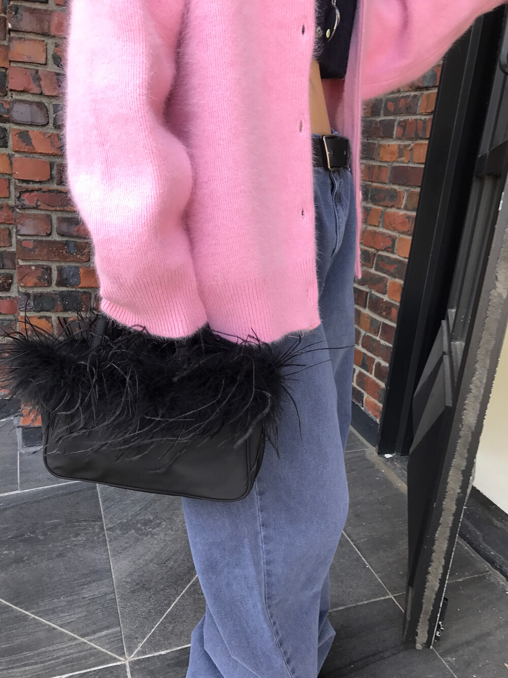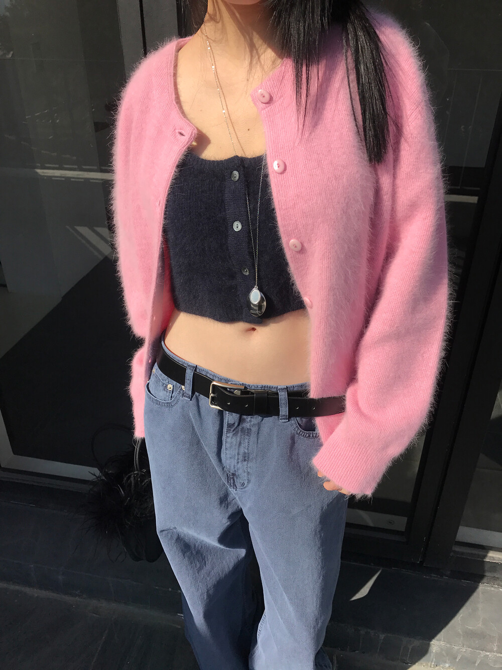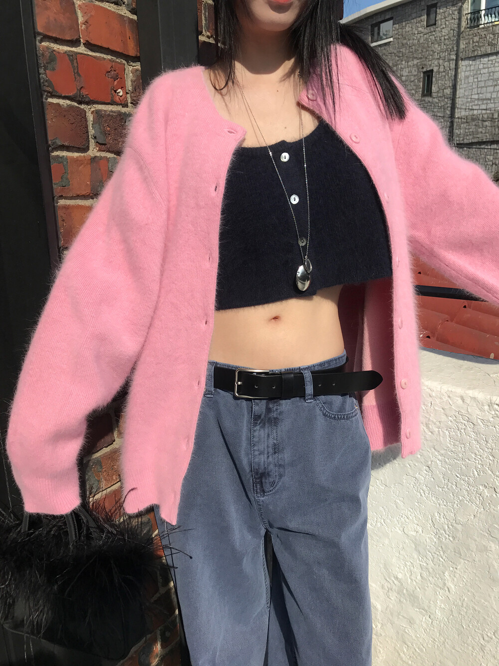 부드러운 앙고라의 텍스처와 질감을 살린 헤어리한 원사를 사용해 포근한 무드가 느껴지는 가디건.