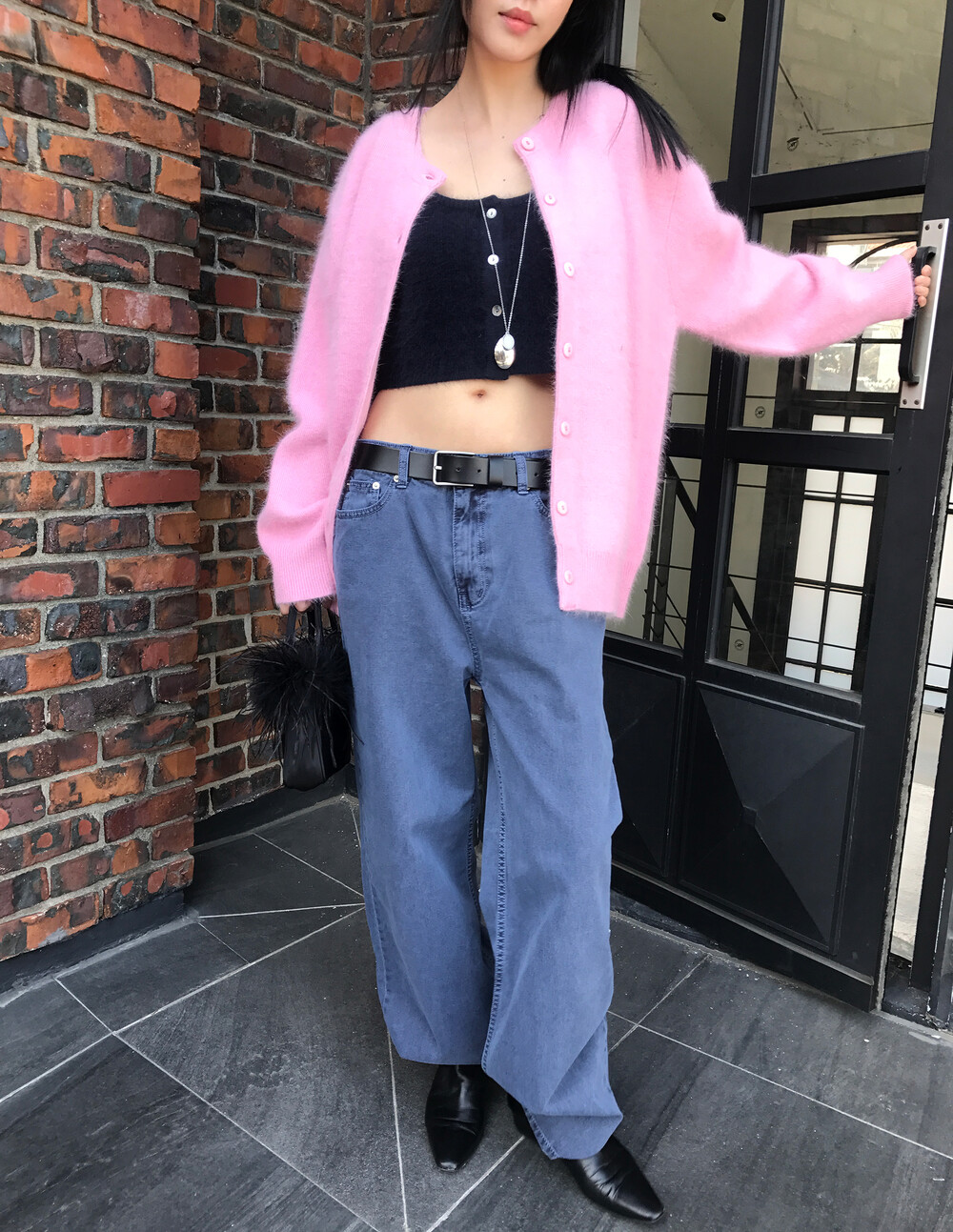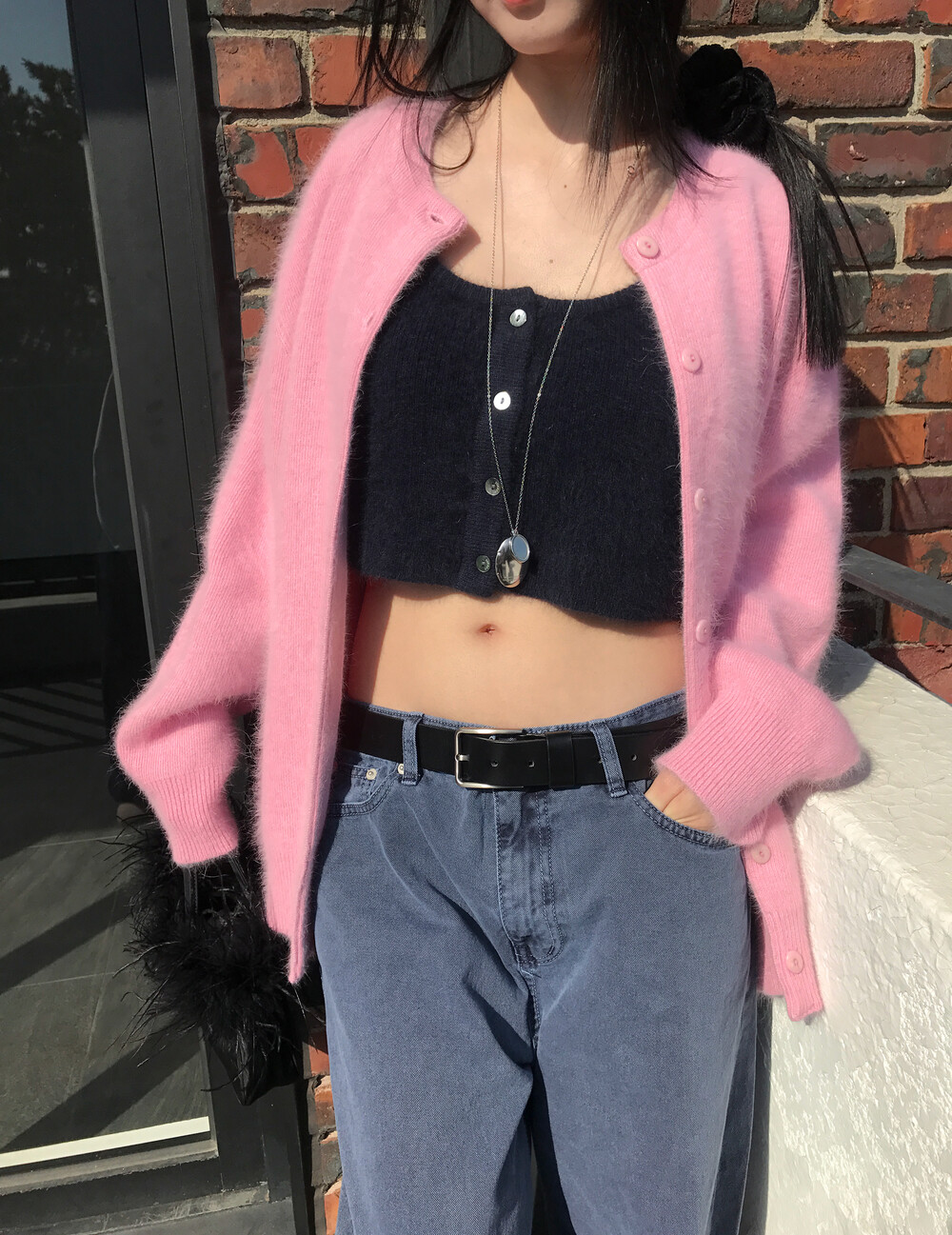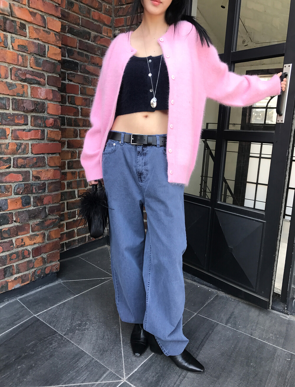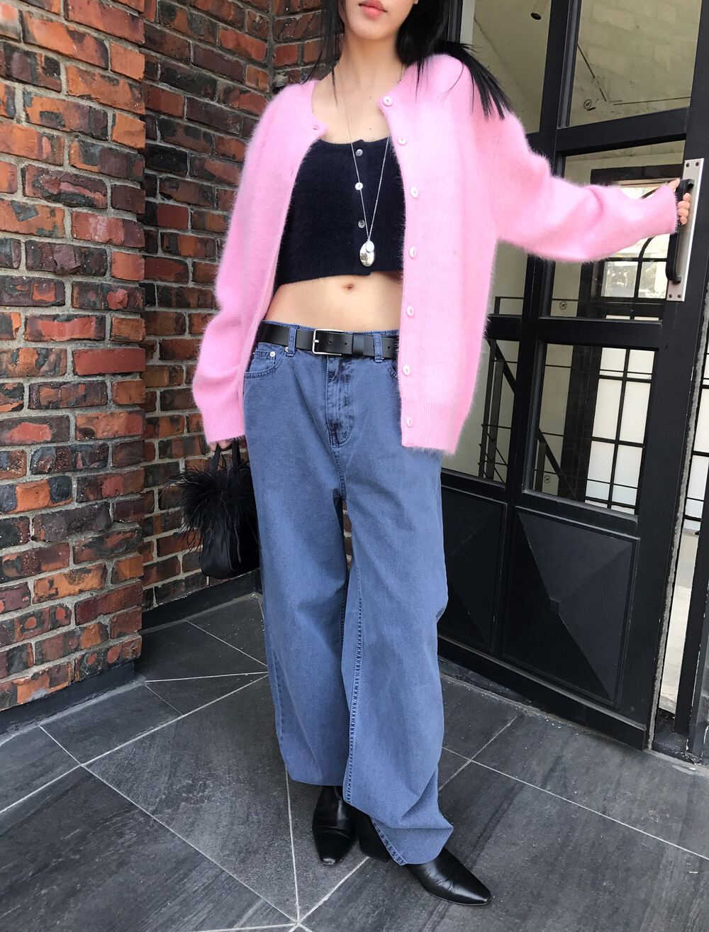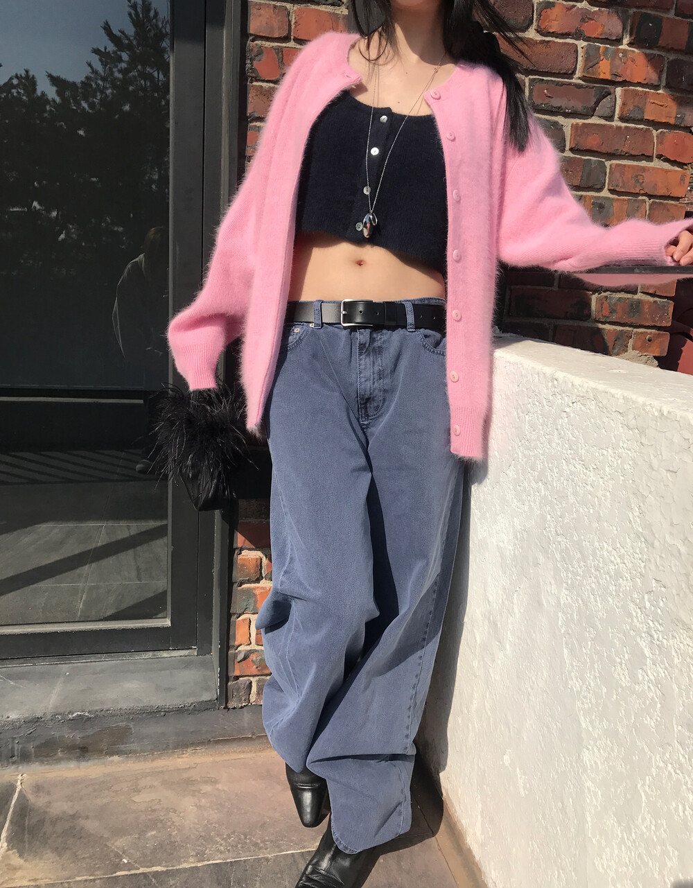 부드러운 앙고라의 텍스처와 질감을 살린 헤어리한 원사를 사용해 포근한 무드가 느껴지는 가디건.