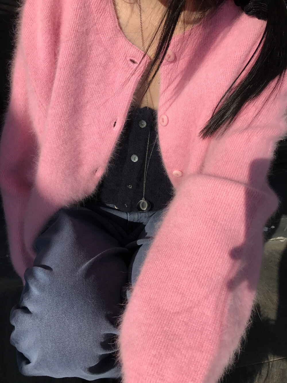 저는 핑크에 반해 셀렉을 했지만, 실제로 입어보니 블랙이 너무너무 예쁜거에요. 그리고 앙고라 70이나 함유된 그런 고급스러운 소재감으로 정말 딱 봐도 이 가디건은 고급스럽다라는게 느껴졌어요. 익스클루시브로 개발된 원사를 사용해 풍성한 헤어감이 돋보였어요!