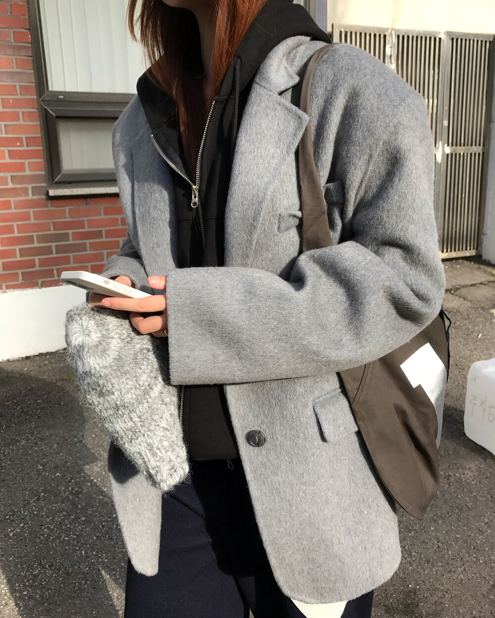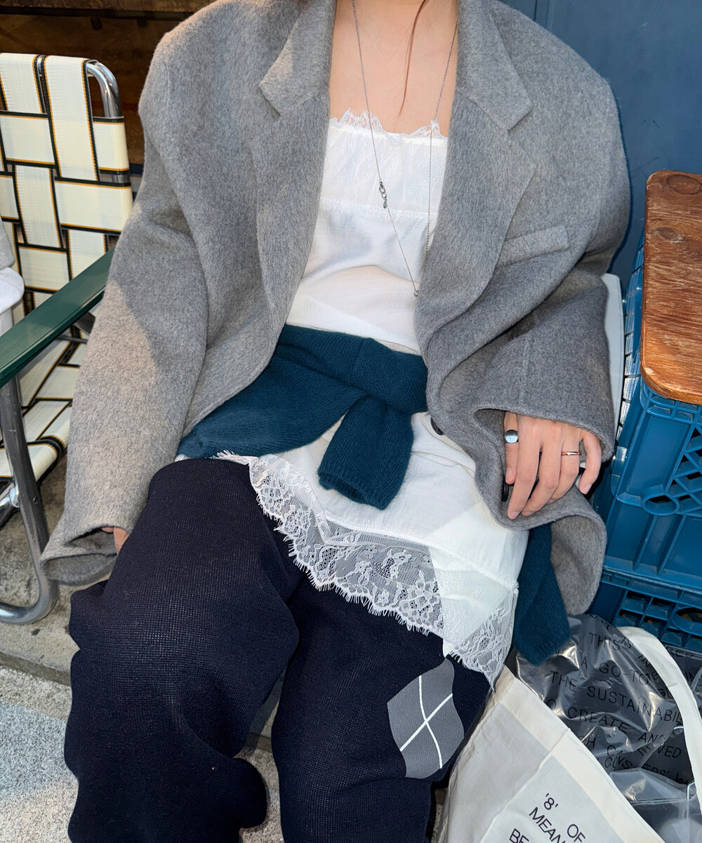 수많은 울 이중지 중에서도 저렴해보이는 광택감이 돌지않고, 약간의 헤어리한 텍스쳐감이 느껴지는 알파카함유 원단으로 제작했어요.