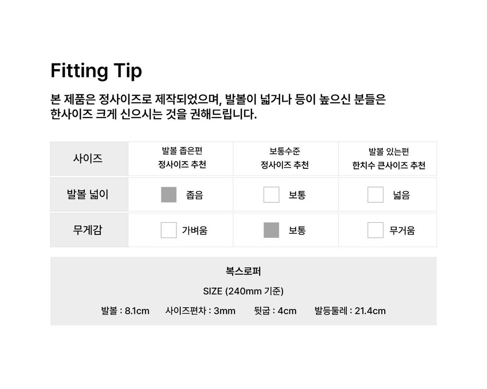 *슬림하게 떨어지는 토 쉐입으로 발볼이 넓을 경우 반치수업 권장합니다.