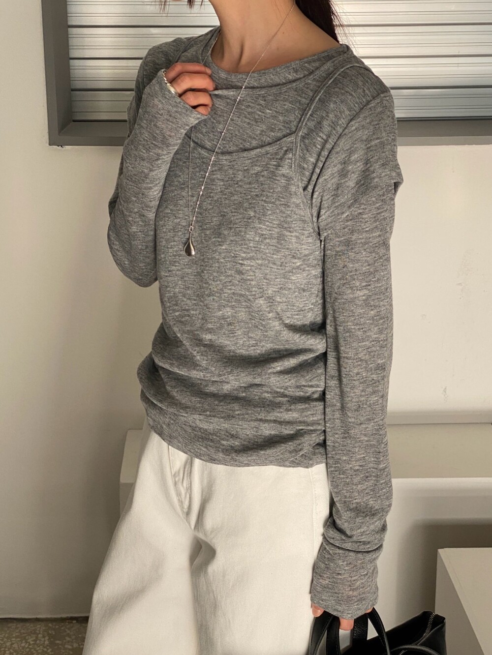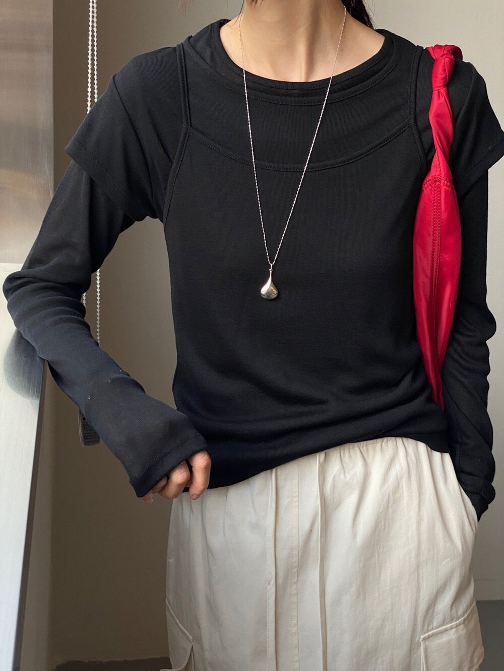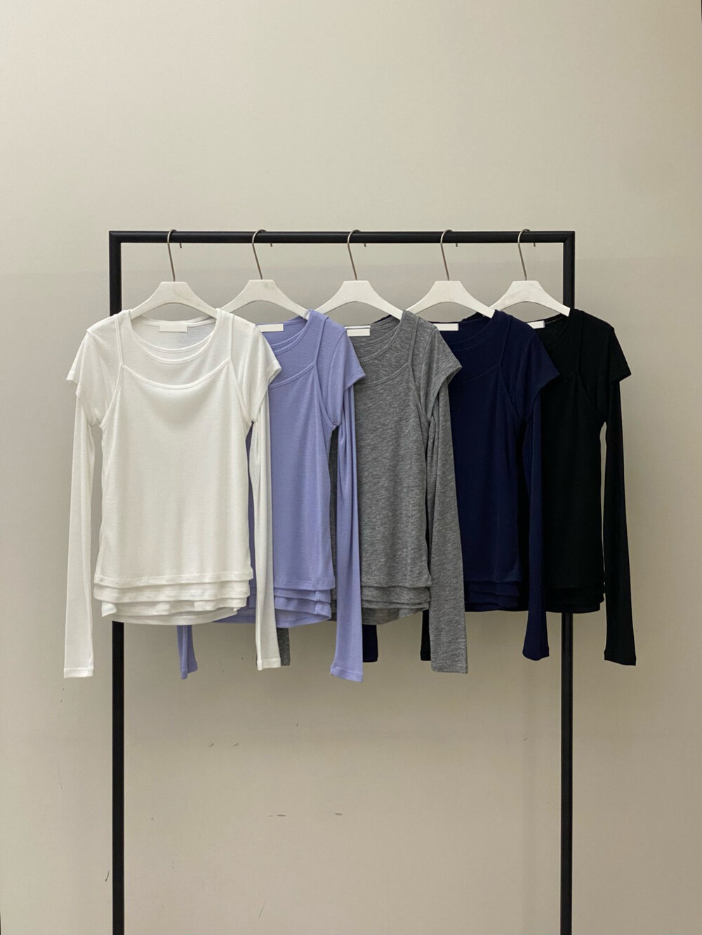 레이어드한 네크라인이 전부 보이도록 파임정도를 다르게 디자인했어요.